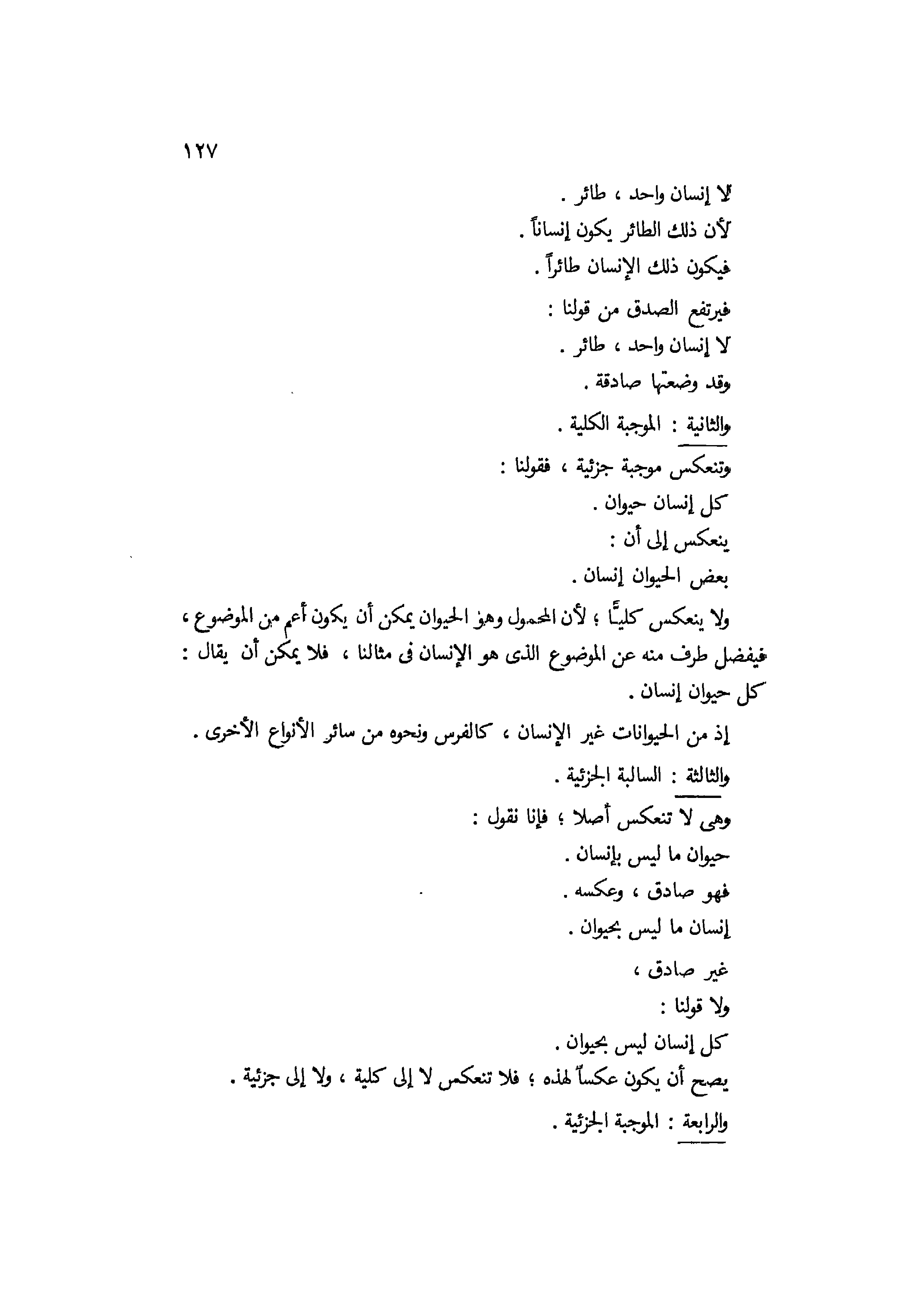 والثالثة السالبة الجزئية، وهي لا تنعكس أصلا، فإنا نقول حيوان ما ليس بإنسان فهو صادق وعكسه إنسان ما ليس بحيوان غير صادق، ولا قولنا كل إنسان ليس بحيوان يصح أن يكون عكسا لهذه، فلا تنعكس لا إلى كلية ولا إلى جزئية.