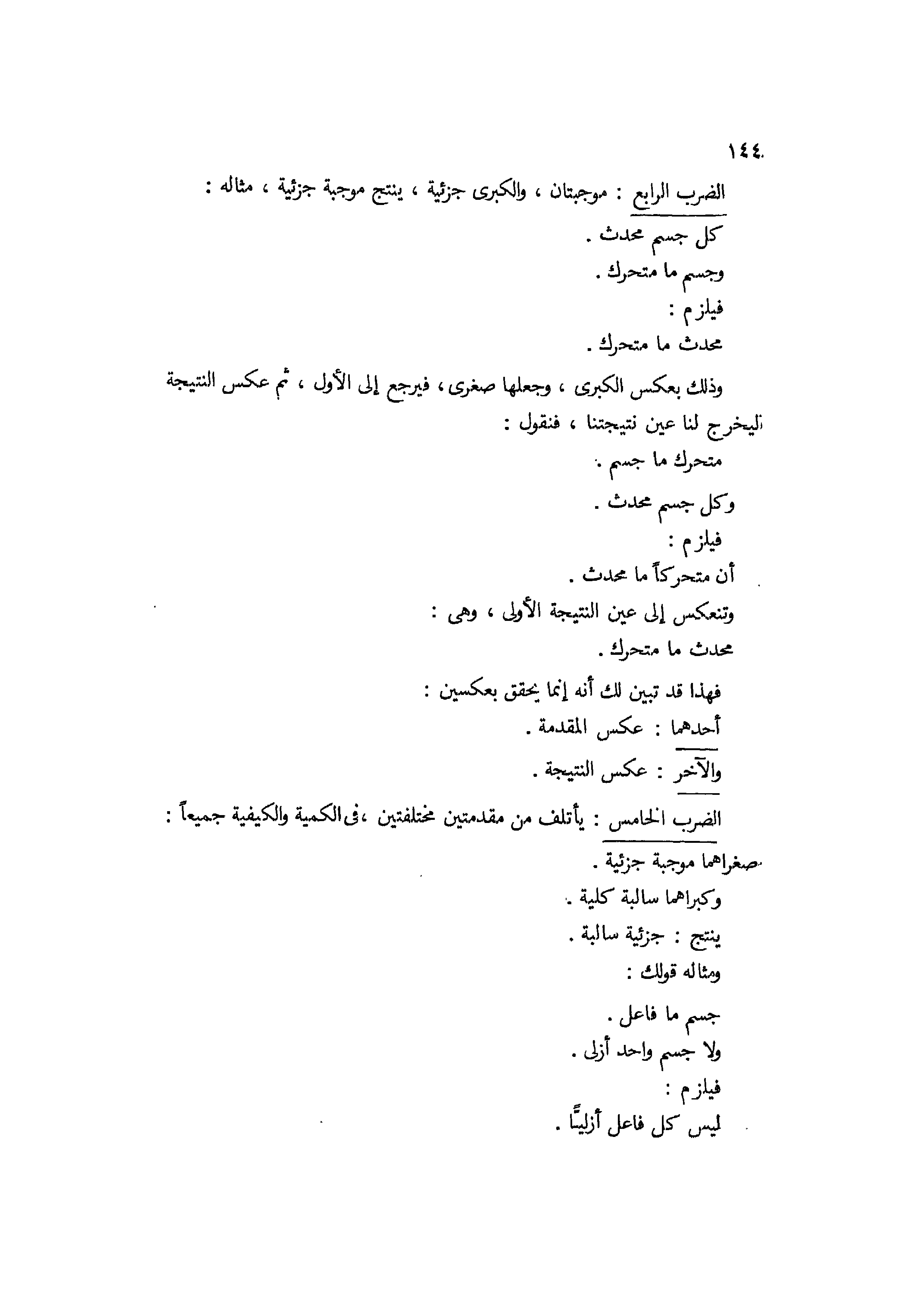 الضرب الرابع موجبتان والكبرى جزئية ينتج موجبة جزئية، مثاله كل جسم محدث وجسم ما متحرك، فيلزم محدث ما متحرك وذلك بعكس الكبرى وجعلها صغرى، فيرجع إلى الأول ثم عكس النتيجة ليخرج لنا عين نتيجتنا، فتقول متحرك ما جسم وكل جسم محدث، فيلزم أن متحركا ما محدث وتنعكس إلى عين النتيجة الأولى وهي محدث ما متحرك، فهذا قد تبين لك أنه إنما يحقق بعكسين أحدهما عكس المقدمة والآخر عكس النتيجة.