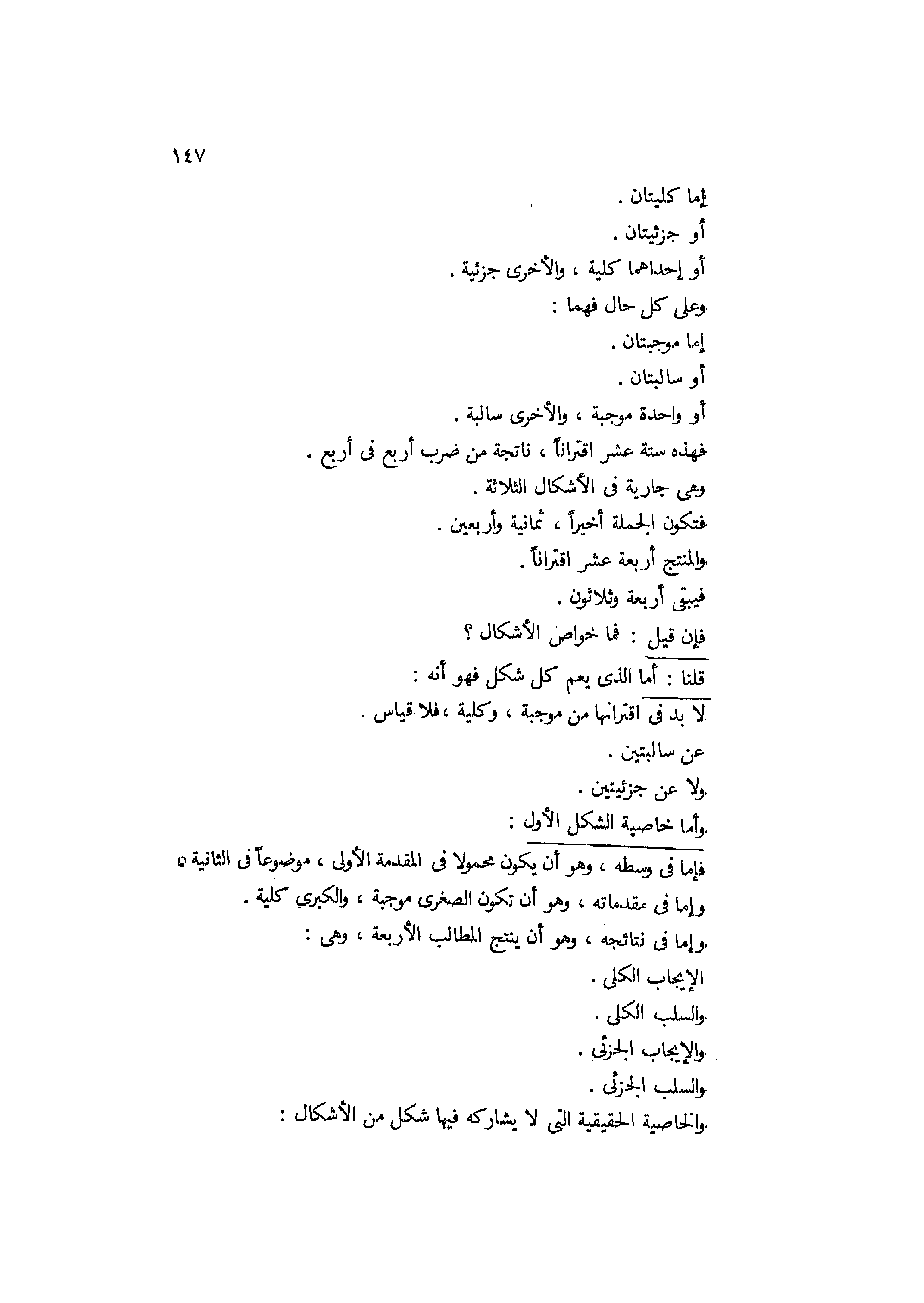 إما كليتان أو جزئيتان او إحدهما كلية والأخرى جزئية، وعلى كل حال فهما إما موجبتان أو سالبتان أو واحدة موجبة والأخرى سالبة فهذه ستة عشر اقترانا ناتجة من ضرب أربع في أربع، وهي جارية في الأشكال الثلاثة، فتكون الجملة أخيرا ثمانية وأربعين، والمنتج أربعة عشر إقترانا فيبقى أربعة وثلاثين. فإن قيل: فما خواص الأشكال؟ قلنا: أما الذي يعمل كل شكل فهوإنه لا بد في اقترانها من موجبة وكلية، فلا قياس عن سالبتين ولا عن جزئيتين.