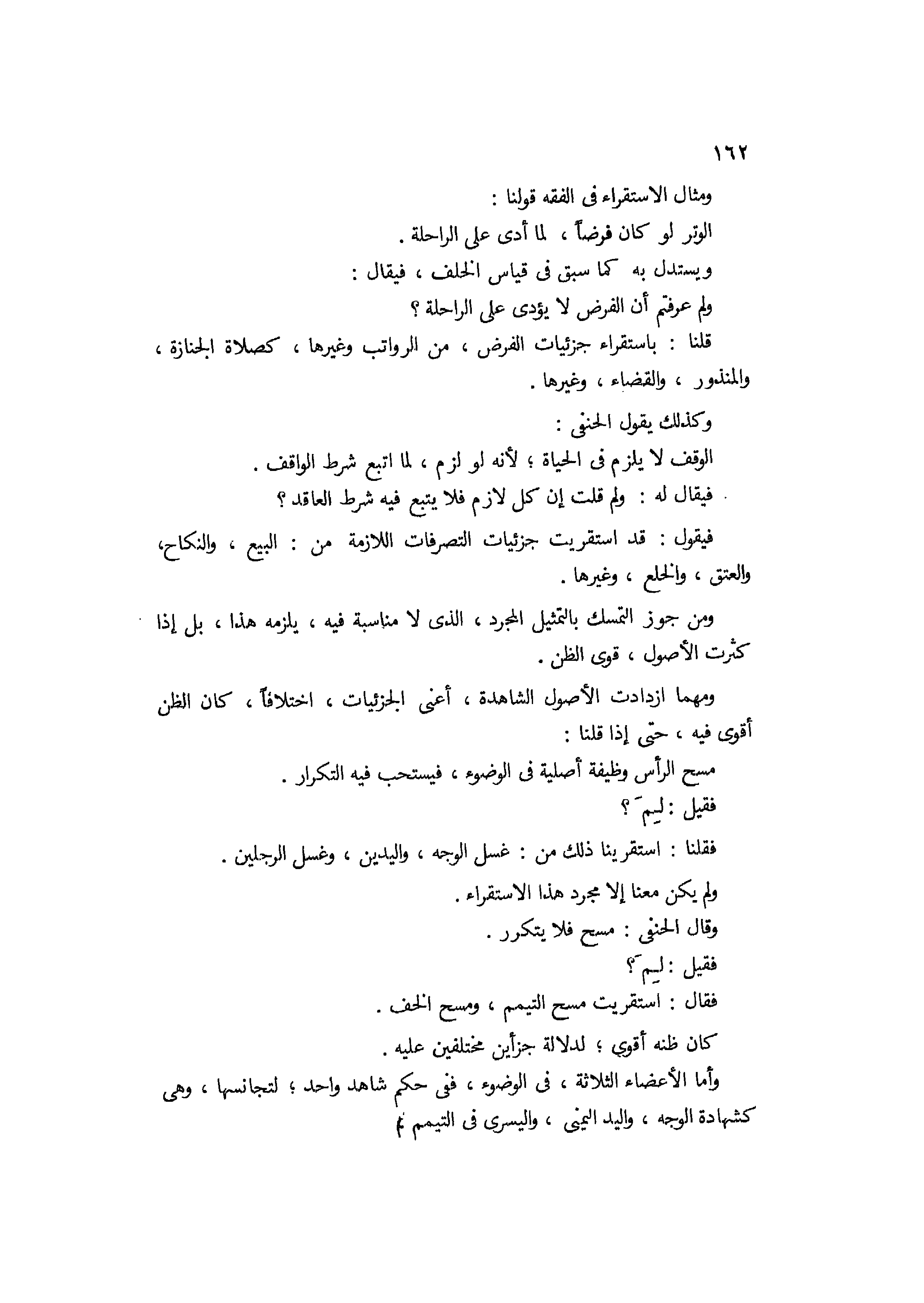 ومثال الإستقراء في الفقه قولنا: الوتر لو كان فرضا لما أدي على الراحلة، ويستدل به كما سبق في قياس الخلف فيقال: ولم عرفتم أن الفرض لا يؤدي على الراحلة؟ قلنا: باستقراء جزئيات الفرض من الرواتب وغيرها كصلاة الجنازة والمنذورة والقضاء وغيرها، وكذلك يقول الحنفي " الوقف لا يلزم في الحياة لأنه لو لزم لما اتبع شرط الواقف، فيقال له: ولم قلت أن كل لازم فلا يتبع فيه شرط العاقد؟ فيقول: قد استقريت جزئيات التصرفات اللازمة من البيع والنكاح والعتق والخلع وغيرها، ومن جوز التمسك بالتمثيل المجرد الذي لا مناسبة فيه يلزمه هذا، بل إذا كثرت الأصول قوي الظن، ومهما ازدادت الأصول الشاهدة أعني الجزئيات اختلافا كان الظن أقوى فيه، حتى إذا قلنا مسح الراس وظيفة أصلية في الوضوء فيستحب فيه التكرار فقيل: لم؟ فقلنا استقرينا ذلك من غسل الوجه واليدين وغسل الرجلين، ولم يكن معنا إلا مجرد هذا الإستقراء.
