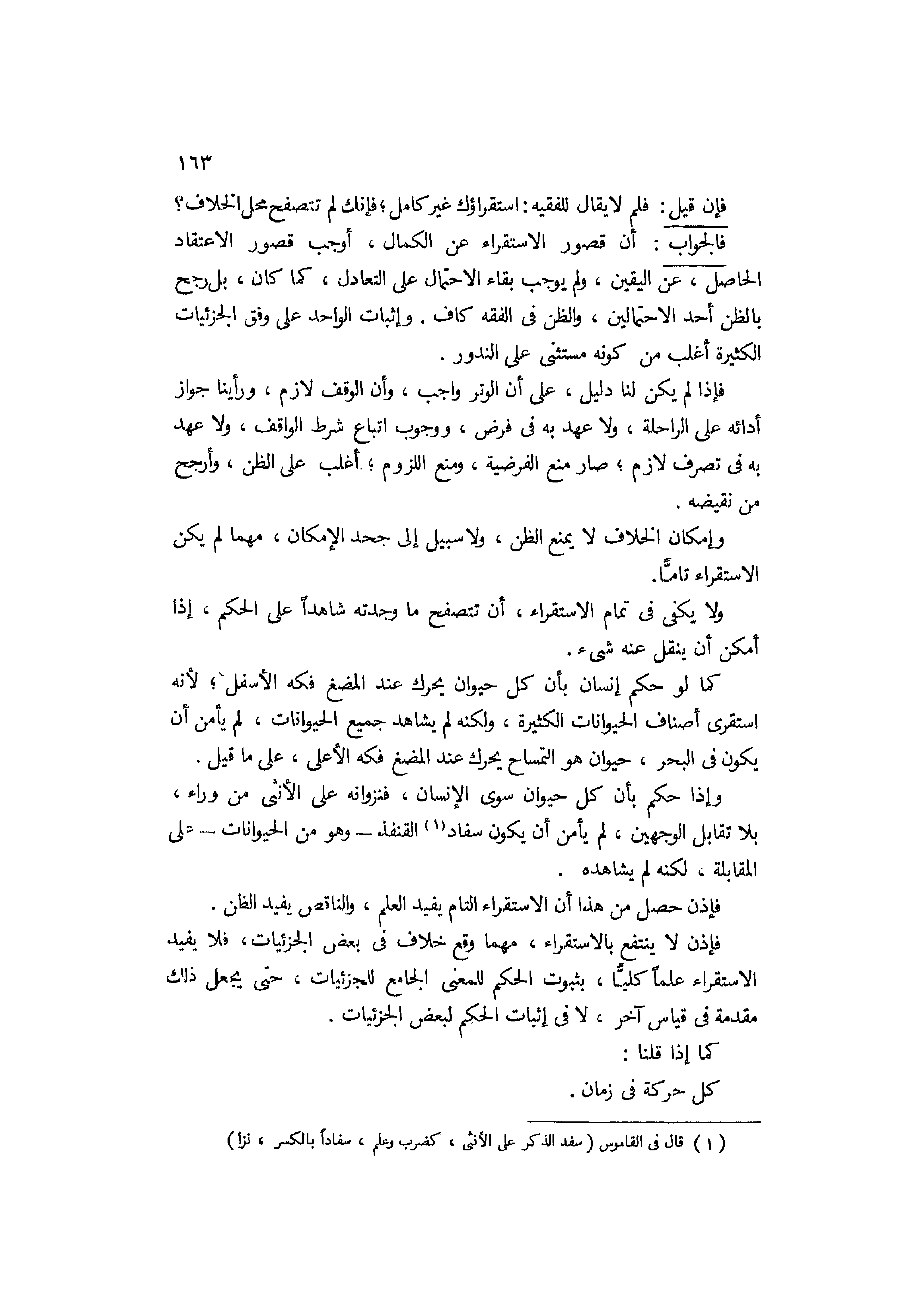 فإن قيل: فلم لا يقال للفقيه إستقراؤك غير كامل فإنك لم تتصفح محل الخلاف؟ فالجواب: أن قصور الإستقراء عن الكمال أوجب قصور الإعتقاد الحاصل عن اليقين، ولم يوجب بقاء الإحتمال على التعادل كما كان، بل رجح بالظن أحد الإحتمالين، والظن في الفقه كاف وإثبات الواحد على وفق الجزئيات الكثيرة أغلب من كونه مستثنى على الندور، فإذا لم يكن لنا دليل على أن الوتر واجب وأن الوقف لازم، ورأينا جواز أدائه على الراحلة ولا عهد به في فرض ووجوب اتباع شرط الواقف، ولا عهد به في تصرف لازم صار منع الغرضية ومنع اللزوم أغلب على الظن وأرجح من نقيضه، وإمكان الخلاف لا يمنع الظن ولا سبيل إلى جحد الإمكان مهما لم يكن الإستقراء تاما، ولا يكفي في تمام الإستقراء أن تتصفح ما وجدته شاهدا على الحكم إذا أمكن أن ينتقل عنه شيء، كما لو حكم إنسان بأن كل حيوان يحرك عند المضغ فكه الأسفل لأنه إستقرى أصناف الحيوانات الكثيرة، ولكنه لما لم يشاهد جميع الحيوانات لم يأمن أن يكون في البحر حيوان هو التمساح يحرك عن المضغ فكه الأعلى - على ما قيل - وإذا حكم بأن كل حيوان سوى الإنسان، فنزوانه على الأنثى من وراء بلا تقابل الوجهين لم يأمن أن يكون سفاد القنفد وهو من الحيوانات على المقابلة لكنه لم يشاهده، فإذن حصل من هذا أن الإستقراء التام يفيد الظن، فإذن لا ينتفع بالإستقراء مهما وقع خلاف في بعض الجزئيات فلا يفيد الإستقراء علما كليا بثبوت الحكم للمعنى الجامع للجزئيات، حتى يجعل ذلك مقدمة في قياس آخر لا في إثبات الحكم لبعض الجزئيات، كما إذا قلنا: كل حركة في زمان