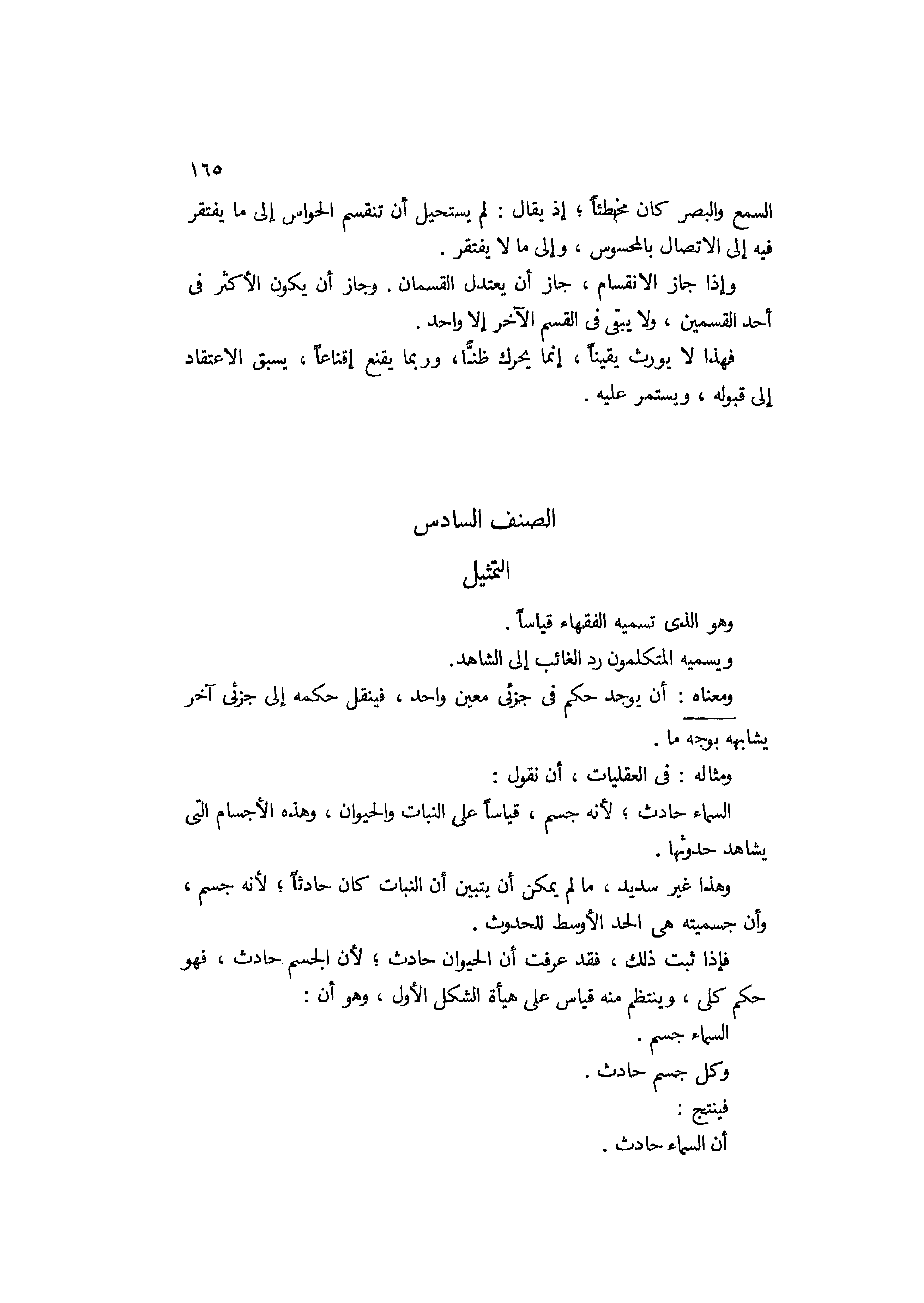 وهو الذي تسميه الفقهاء قياسا، ويسميه المتكلمون رد الغائب إلى الشاهد، ومعناه أن يوجد حكم في جزئي معين واحد فينقل حكمه إلى جزئي آخر يشابهه بوجه ما، ومثاله في العقليات أن نقول: السماء حادث لأنه جسم قياسا على النبات والحيوان، وهذه الأجسام التي يشاهد حدوثها، وهذا غير سديد ما لم يمكن أن يتبين أن النبات كان حادثا لأنه جسم، وإن جسميته هي الحد الأوسط للحدوث، فإن ثبت ذلك فقد عرفت أن الحيوان حادث لأن الجسم حادث، فهو حكم كلي وينتظم منه قياس على هيئة الشكل الأول، وهو أن السماء جسم وكل جسم حادث، فينتج أن السماء حادث