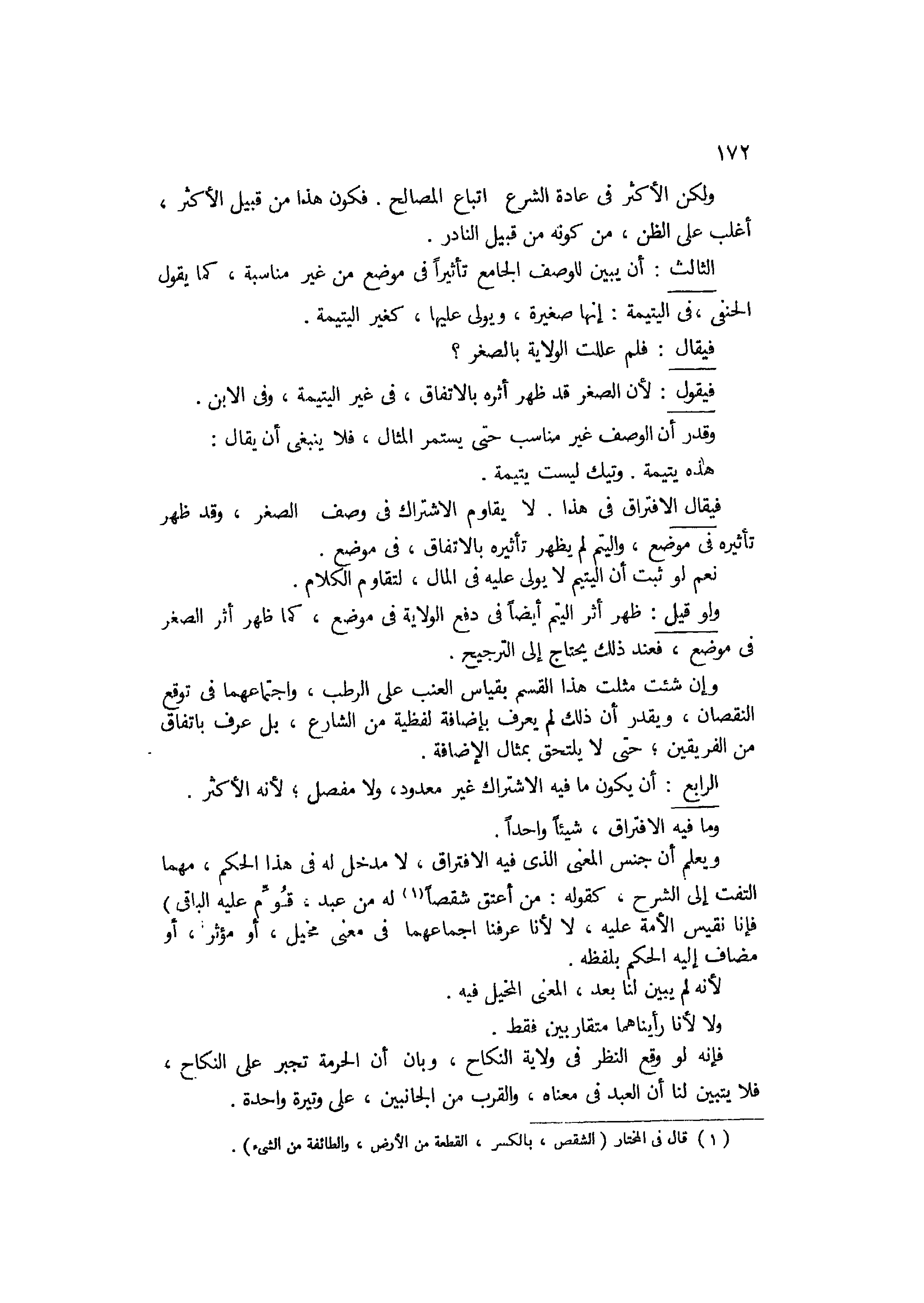الرابع: أن يكون ما فيه الإشتراك غير معدود ولا مفصل لأنه الأكثر، وما فيه الإفتراق شيئا واحدا، ويعلم أن جنس المعنى الذي فيه الإفتراق، لا مدخل له في هذا الحكم، مهما التفت إلى الشرع كقوله: من أعتق شقصا له من عبد، قوّم عليه الباقي. فإنا نقيس الأمة عليه، لا لأنا عرفنا إجتماعهما في معنى مخيل أومؤثر أو مضاف إليه الحكم بلفظه، لأنه لم يبن لنا بعد المعنى المخيل فيه، ولا لأنا رأيناهما متقاربين فقط. فإنه لو وقع النظر في ولاية النكاح، وبان أن الأمة تجبر على النكاح، فلا يتبين لنا أن العبد في معناه. والقرب من الجانبين على وتيرة واحدة،