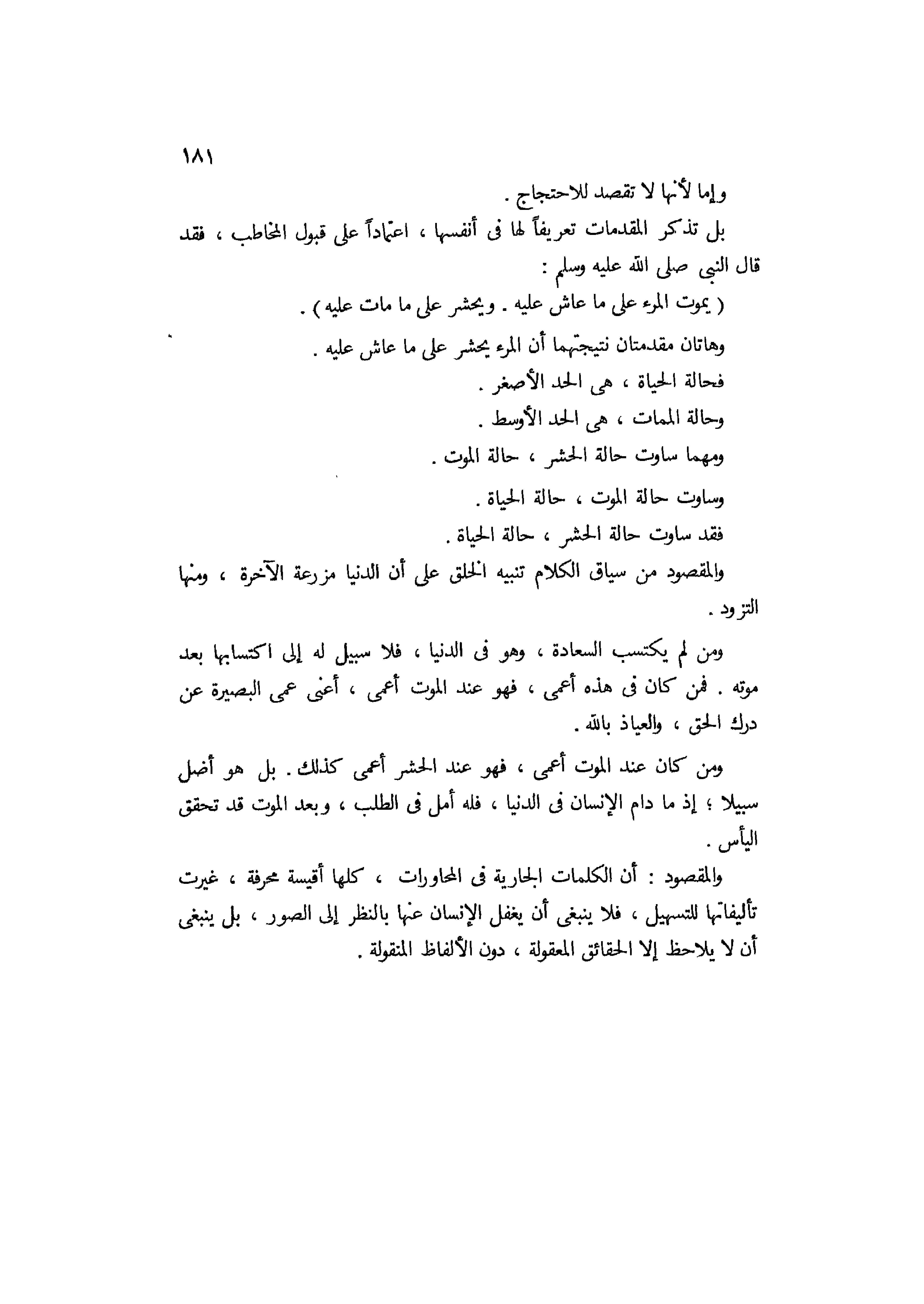 إعتمادا على قبول المخاطب، فقد قال النبي صلى الله عليه وسلم: " يموت المرء على ما عاش عليه، ويحشر على ما مات عليه " وهاتان مقدمتان نتيجتهما أن المرء يحشر علىماعاش عليه، فحالة الحياة هي الحد الأصغر، وحالة الممات هي الحد الأوسط. ومهما ساوت حالة الحشر حالة الموت، وساوت حالة الموت حالة الحياة، فقد ساوت حالة الحشر حالة الحياة.