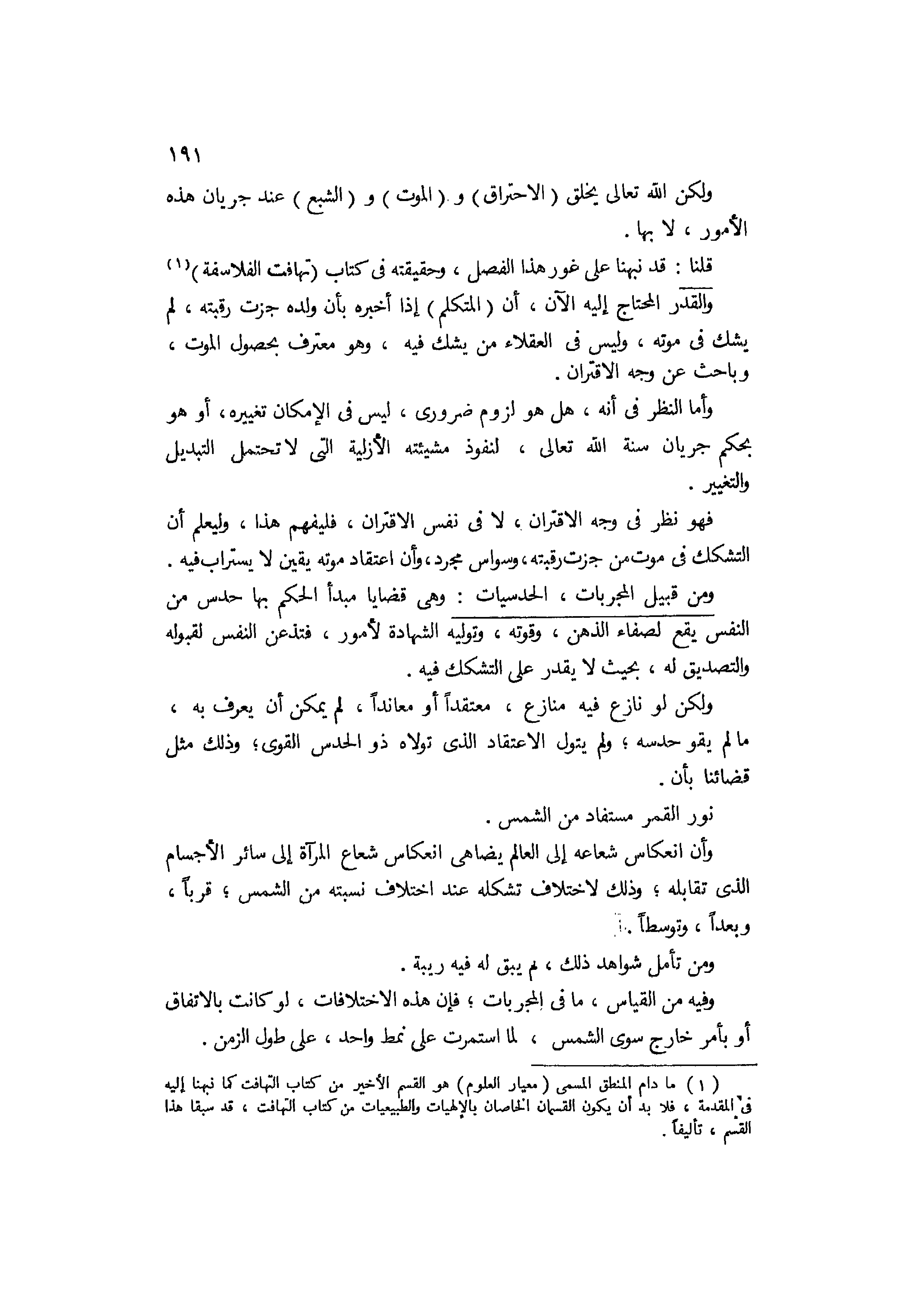 ولكن الله تعالى يخلق الإحتراق والموت والشبع عند جريان هذه الأمور لا بها؟ قلنا: قد نبهنا على غور هذا الفصل وحقيقته في كتاب تهافت الفلاسفة. والقدر المحتاج إليه الآن أن المتكلم إذا اخبره بأن ولده جزت رقبته لم يشك في موته، وليس في العقلاء من يشك فيه، وهو معترف بحصول الموت وباحث عن وجه الإقتران. وأما النظر في أنه هل هو لزوم ضروري ليس في الإمكان تغييره أو هو بحكم جريان سنة الله تعالى لنفوذ مشيئته الأزلية، التي لا تحتمل التبديل والتغيير، فهو نظر في وجه الإقتران لا في نفس الإقتران، فليفهم هذا وليعلم أن التشكك في موت من جزت رقبته وسواس مجرد، وأن اعتقاد موته يقين لا يستراب فيه، ومن قبيل المجربات الحدسيات، وهي قضايا مبدأ الحكم بها حدس من النفس يقع لصفاء الذهن وقوته وتوليه الشهادة لأمور، فتذعن النفس لقبوله والتصديق له بحيث لا يقدر على التشكك فيه، ولكن لو نازع فيه منازع معتقدا أو معاندا لم يمكن أن يعرف به ما لم يقو حدسه ولم يتول الإعتقاد الذي تولاه ذو الحدس القوي، وذلك مثل قضائنا بأن نور القمر مستفاد من للشمس، وأن انعكاس شعاعه إلى العالم يضاهي انعكاس شعاع المرآة إلى سائر الأجسام التي تقابله، وذلك لإختلاف تشكله عند اختلاف نسبته من الشمس قربا وبعدا وتوسطا.