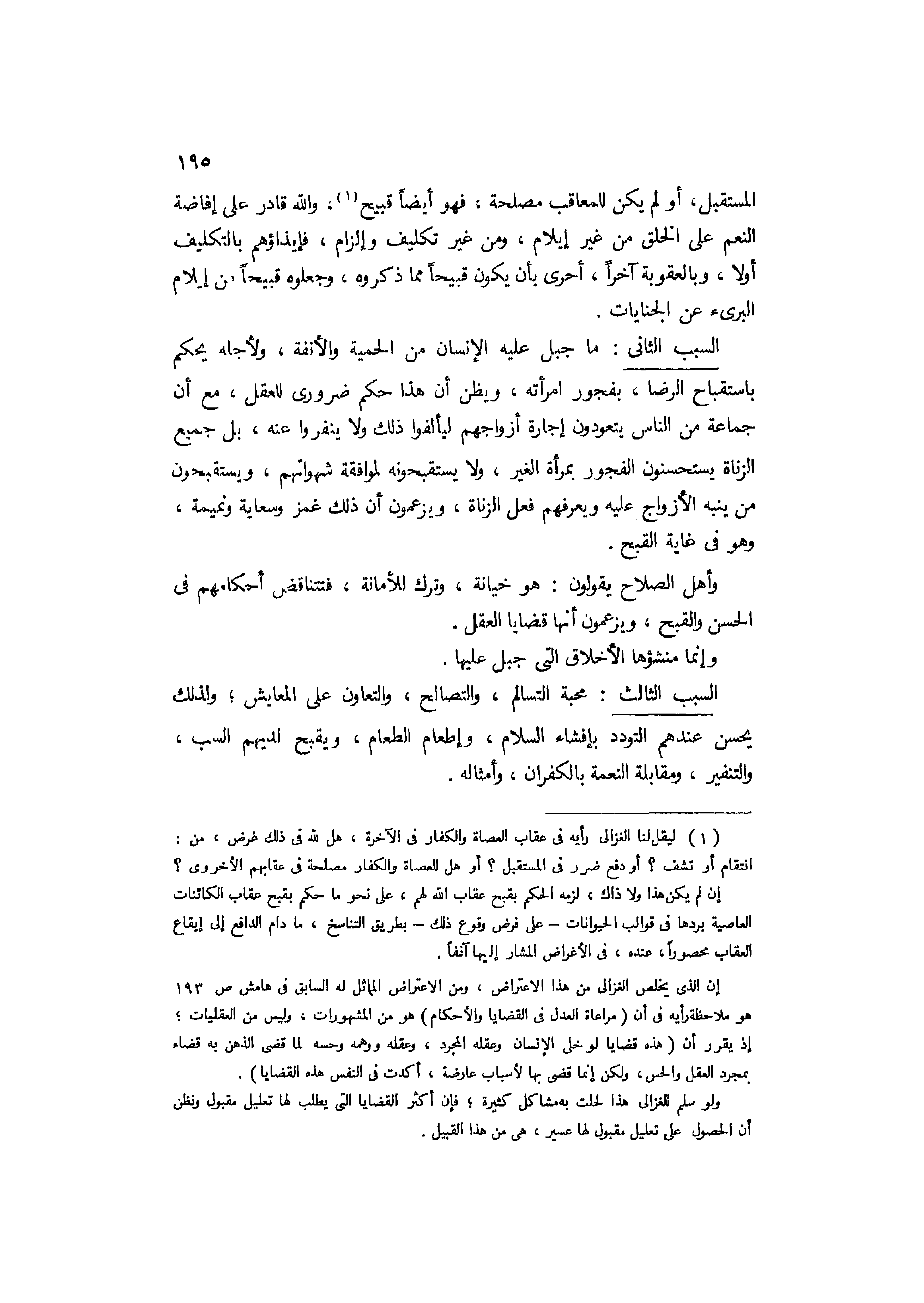 المستقبل أو لم يكن للمعاقب مصلحة فهو أيضا قبيح، والله قادر على إفاضة النعم على الخلق من غير إيلام، ومن غير تكليف وإلزام، فايذاؤهم بالتكليف أولا وبالعقوبة آخرا أحرى بأن يكون قبيحا مما ذكروه، وجعلوه قبيحا من إيلام البريء عن الجنايات.