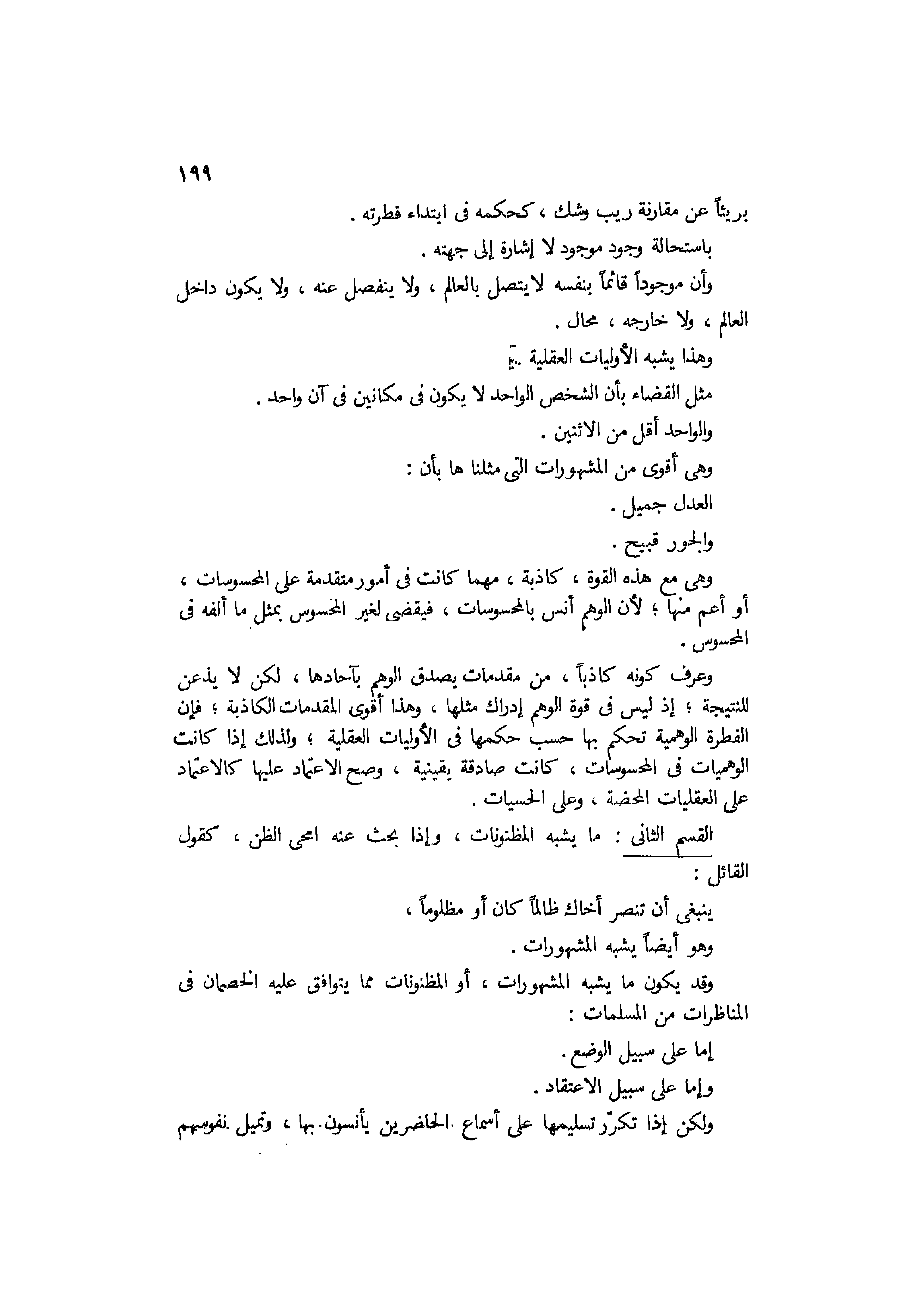 بريا عن مقارنة ريب وشك، كحكمة في إبتداء فطرته بإستحالة وجود موجود لا إشارة إلى جهته، وأن موجودا قائما بنفسه لا يتصل بالعالم ولا ينفصل عنه، ولا يكون داخل العالم ولا خارجه محال، وهذا يشبه الأوليات العقلية مثل القضاء بان الشخص الواحد لا يكون في مكانين في آن واحد، والواحد أقل من الإثنين، وهي أقوى من المشهورات التي مثلناها بأن العدل جميل والجور قبيح، وهي مع هذه القوة كاذبة مهما كانت في أمور متقدمة على المحسوسات أو أعم منها، لأن الوهم إنس بالمحسوسات فيقضي لغير المحسوس بمثل ما ألفه في المحسوس.