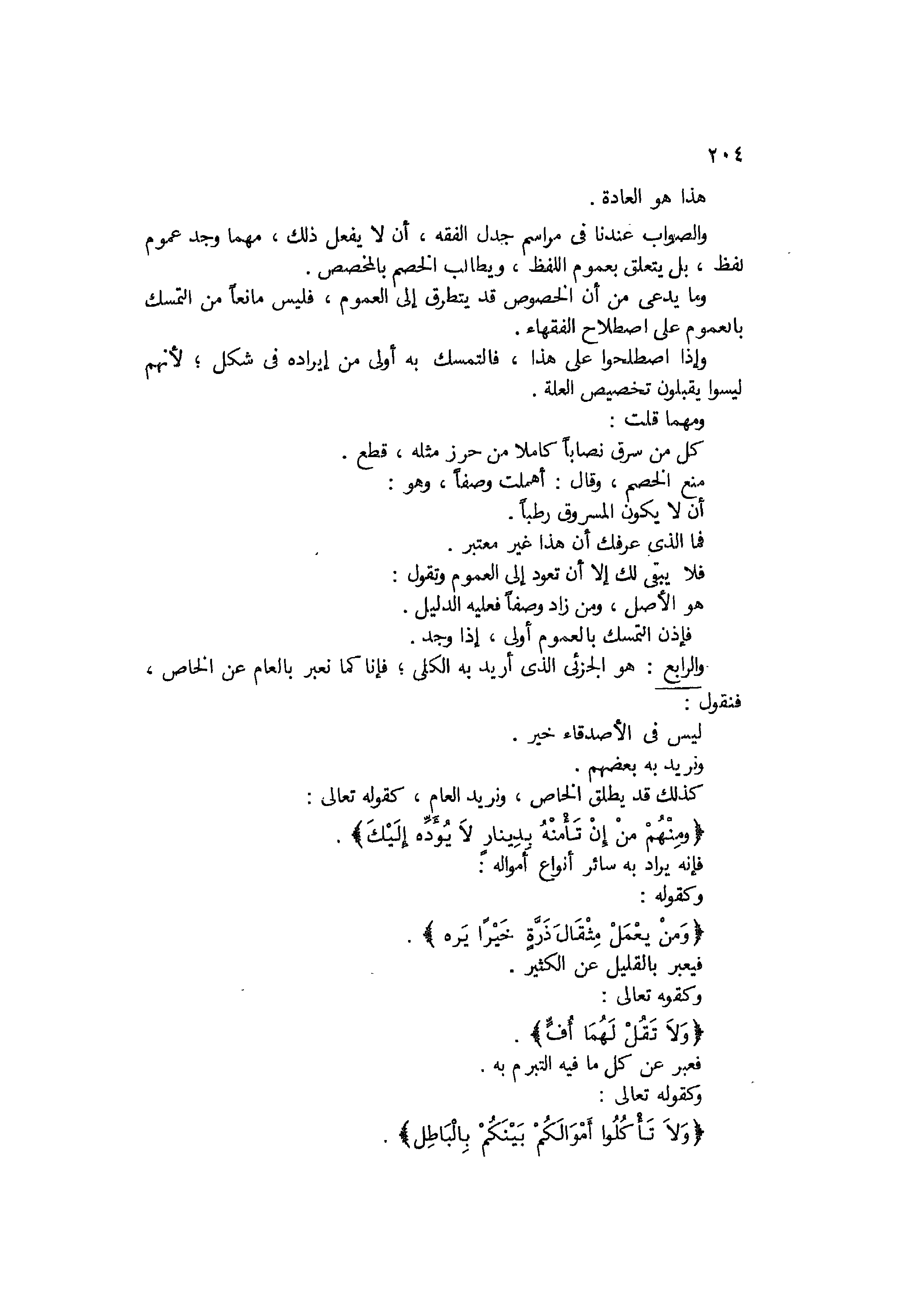 والصواب عندنا في مراسم جدل الفقه ان لا يفعل ذلك مهما وجد عموم لفظ، بل يتعلق بعموم اللفظ ويطالب الخصم بالمخصص، وما يدعي من ان الخصوص قد يتطرق إلىالعموم فليس مانعا من التمسك بالعموم على إصطلاح الفقهاء، وإذا اصطلحوا على هذا فالتمسك به أولى من إيراده في شكل قياس، لأنهم ليسوا يقبلون تخصيص العلة. ومهما قلت: كل من سرق نصابا كاملا من حرز مثله قطع، منع الخصم وقال: أهملت وصفا وهو أن لا يكون المسروق رطبا فما الذي عرفك أن هذا غير معتبر، فلا يبقى لك إلا أن تعود إلى العموم وتقول: هوالأصل. ومن زاد وصفا فعلهي الدليل، فإذن التمسك بالعموم أولى إذا وجد.