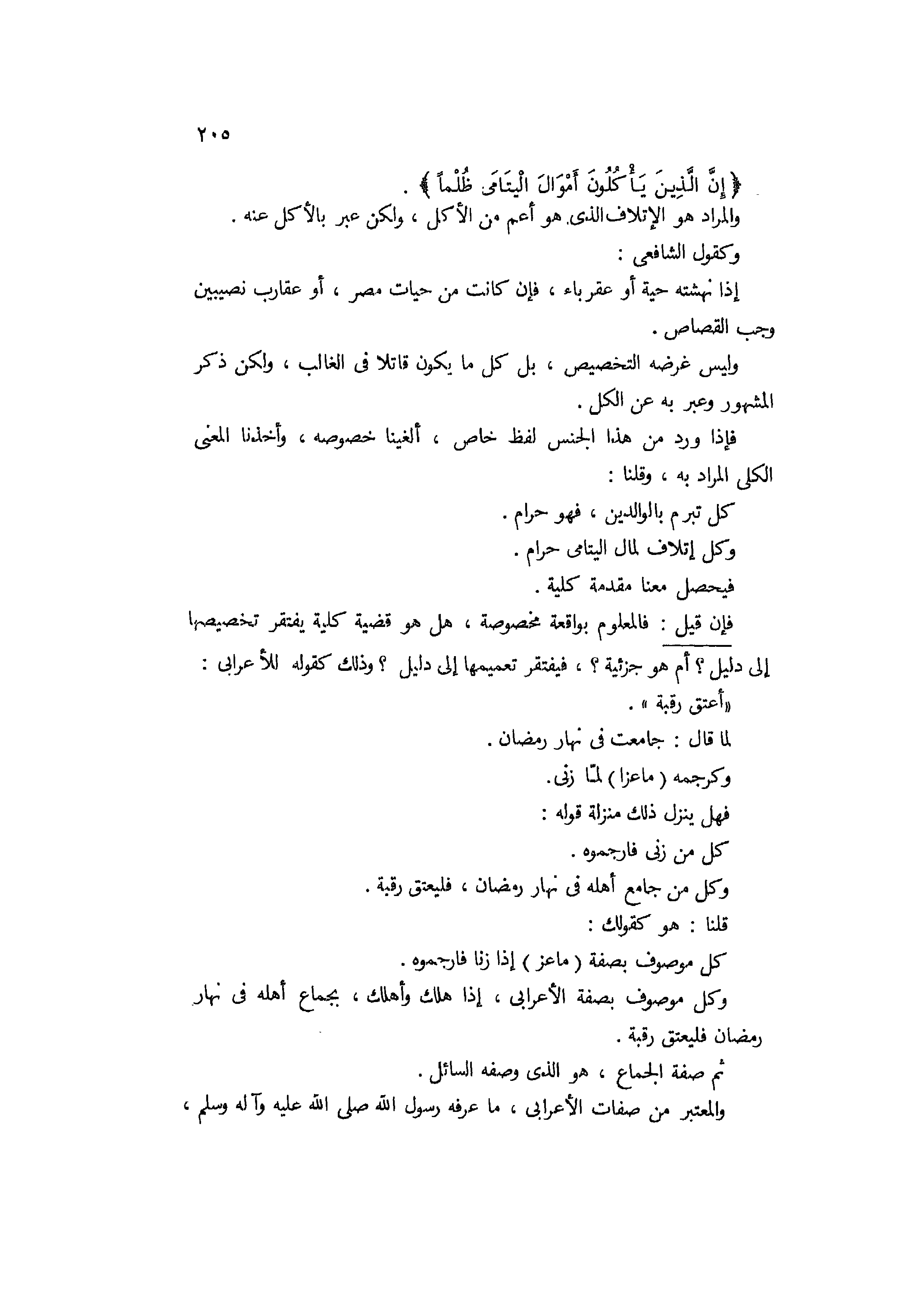 وكقول الشافعي: إذا نهشته حية أو عقرباء فإن كانت من حيات مصر أوعقارب نصيبين وجب القصاص. وليس غرضه التخصيص بل كل ما يكون قاتلا في الغالب، ولكن ذكر المشهور وعبر به عن الكل، فإذا ورد من هذا الجنس لفظ خاص ألغينا خصوصه وأخذنا المعنى الكلي المراد به وقلنا: كل تبرم بالوالدين فهو حرام، وكل إتلاف لمال اليتامى حرام؛ فيحصل معنا مقدمة كلية. فإن قيل: فالمعلوم بواقعة مخصوصة هل هو قضية كلية يفتقر تخصيصها إلى دليل أم هو جزئية فيفتقر تعميمها إلى دليل، وذلك كقوله للأعرابي: (اعتق رقبة) لما قال جامعت في نهار رمضان، وكرجمه ماعزا لما زنى، فهل ينزل ذلك منزلة قوله: كل من زنى فارجموه وكل من جامع أهله في نهار رمضان فليعتق رقبة؟ قلنا: هو كقولك: كل موصوف بصفة ماعز إذا زنى فارجموه، ولك موصوف بصفة الأعرابي إذا هلك وأهلك بجماع أهله في نهار رمضان فليعتق رقبو. ثم صفة الجماع هو الذي وصفه السائل والمعتبر من صفات الأعرابي ما عرفه رسول الله صلى الله عليه وسلم