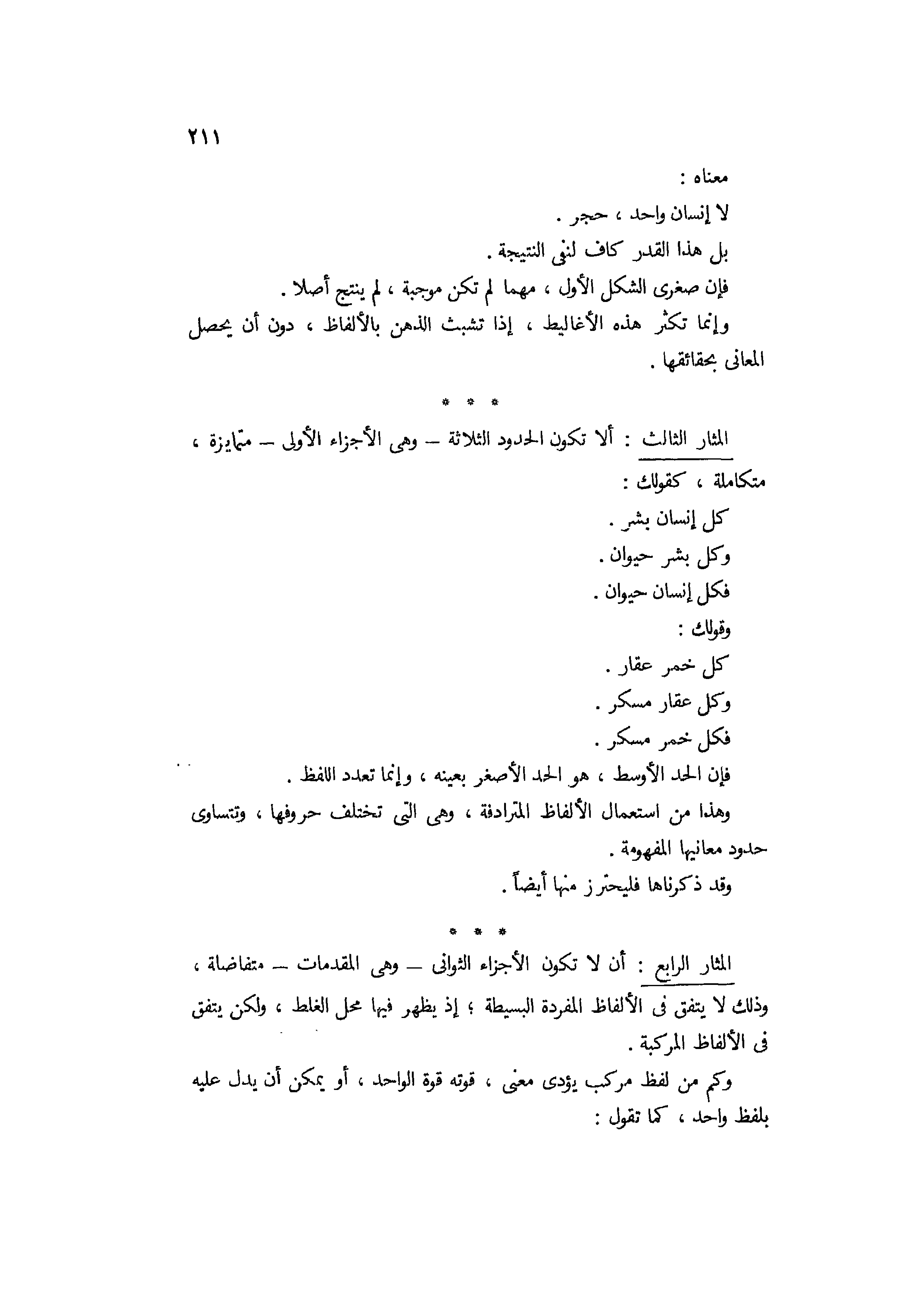 المثار الرابع: ألا تكون الأجزاء الثواني وهي المقدمات متفاضلة، وذلك لا يتفق في الألفاظ المفردة البسيطة إذ يظهر فيها محل الغلط، ولكن يتفق في الألفاظ المركبة، وكم من لفظ مركب يؤدي معنى قوته قوة الواحد أو يمكن أن يدل عليه بلفظ واحد، كما تقول: