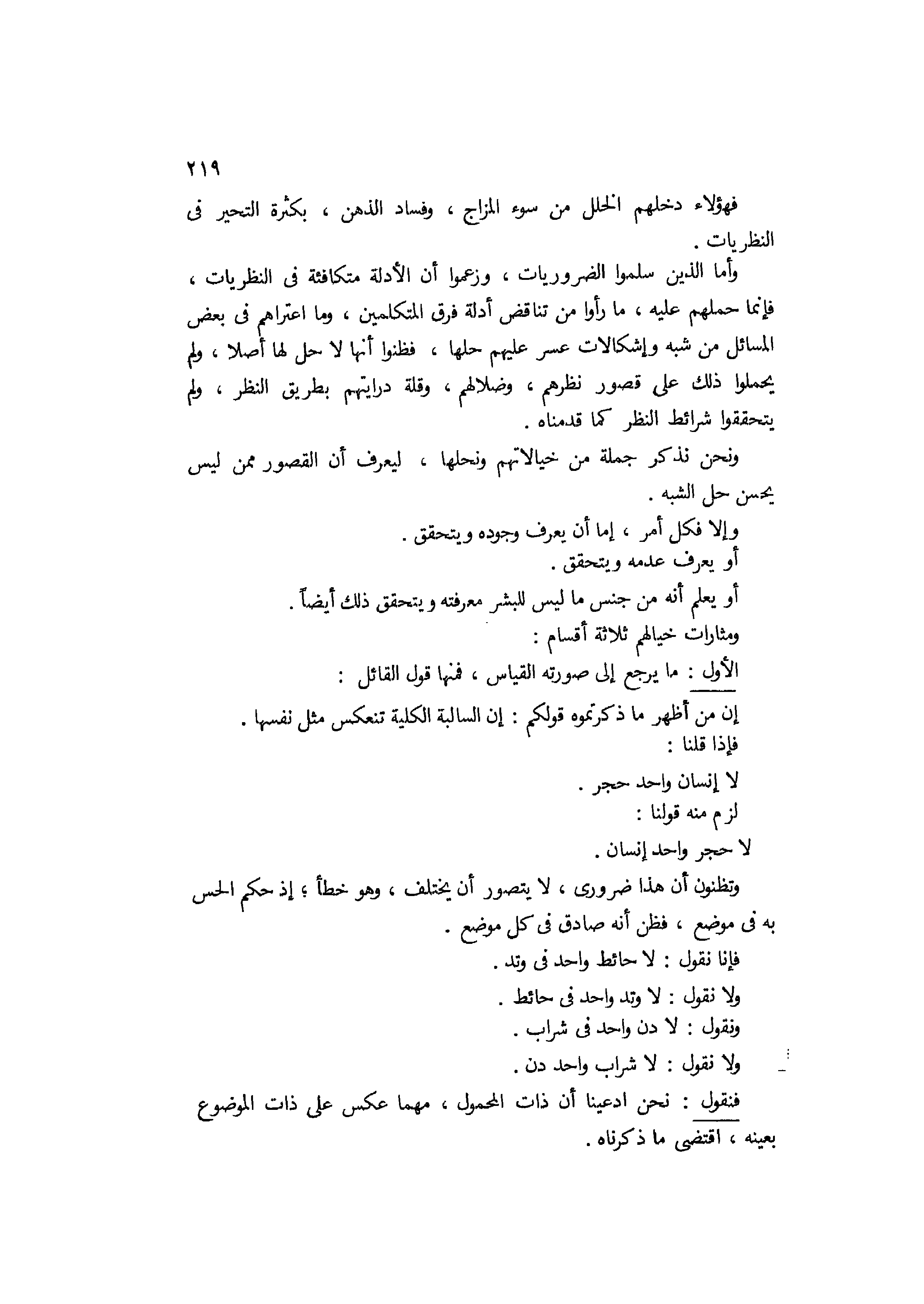 فهؤلاء دخلهم الخلل من سوء المزاج وفساد الذهن بكثرة التحير في النظريات. وأما الذين سلموا الضروريات وزعموا أن الأدلة متكافئة في النظريات فإنما حملهم عليه ما رأوا من تناقض أدلة فرق المتكلمين، وما اعتراهم في بعض المسائل من شبه وإشكالات عسر عليهم حلها، فظنوا أنها لا حل لها أصلا، ولم يحملوا ذلك على قصور نظرهم وضلالهم وقلة درايتهم بطريق النظر، ولم يتحققوا شرائط النظر كما قدمناه، ونحن نذكر جملة من خيالاتهم ونحلها ليعرف أن القصور ممن ليس يحسن حل الشبه، وإلا فكل أمر إما أن يعرف وجوده ويتحقق أو يعرف عدمه ويتحقق، أو يعلم أنه من جنس ما ليس للبشر معرفته ويتحقق ذلك أيضا، ومثارات خيالهم ثلاثة أقسام: الأول: ما يرجع إلى صورة القياس؛ فمنها قول القائل: إن من أظهر ما ذكرتموه قولكم أن السالبة الكلية تنعكس مثل نفسها، فإذا قلنا لا إنسان واحد حجر واحد إنسان، وتظنون أن هذا ضروري لا يتصور أنيختلف، وهو خطأ إذ حكم الحس به في موضع فظن أنه صادق في كل موضع. فإنا نقول: لا حائط واحد في وتد ولا نقول لا وتد واحد في حائط، ونقول: لا دن واحد في شراب، ولا نقول: لا شراب واحد دن، فنقول: نحن ادعينا أن ذات المحمول مهما عكس على ذات الموضوع بعينه اقتضى ما ذكرناه