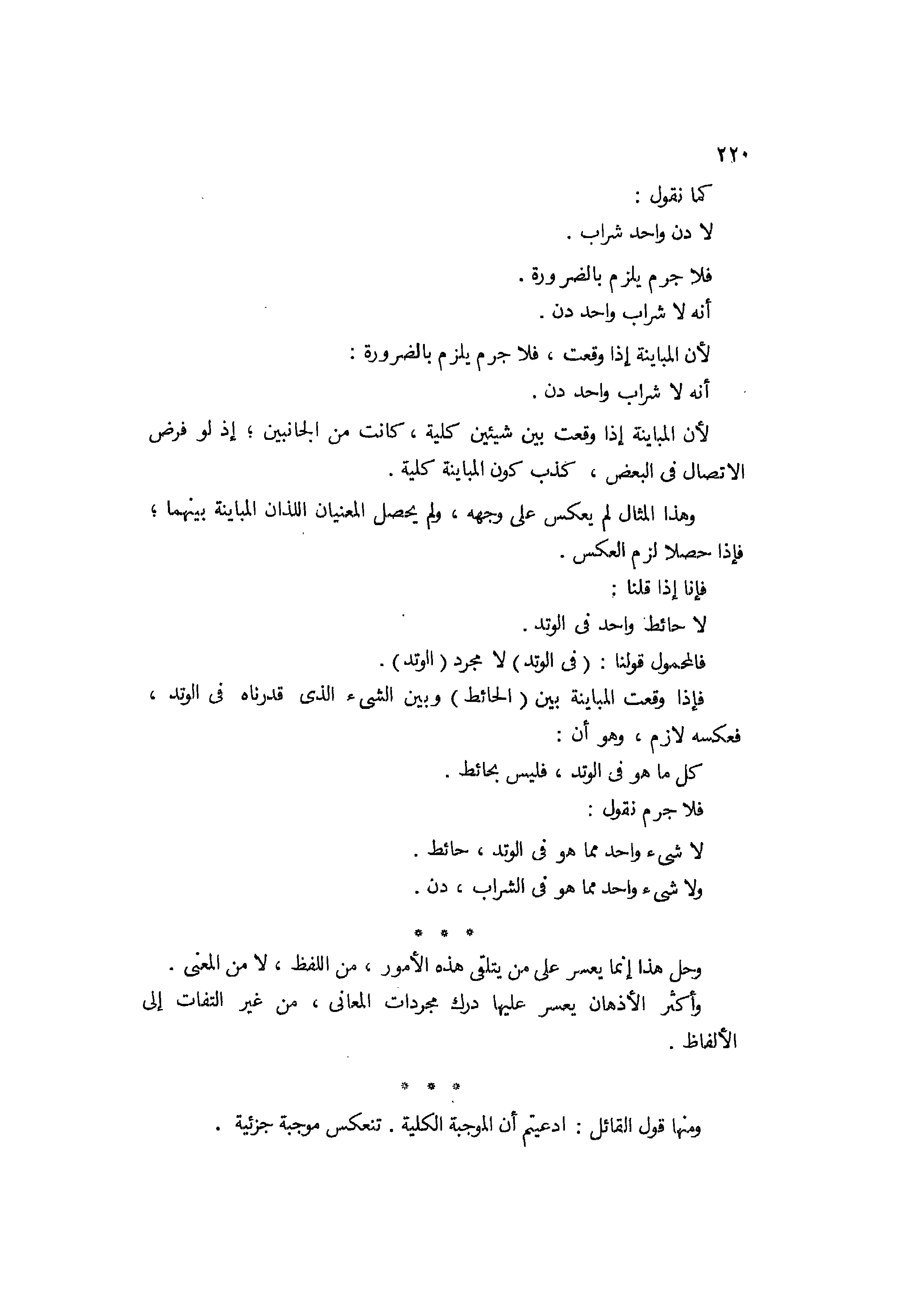 كما نقول: لا دن واحد شراب فلا جرم يلزم بالضرورة إنه لا شراب واحد دن، لأن المباينة إذا وقعت فلا جرم يلزم بالضرورة إنه لا شراب واحد دن، لأن المباينة وقعت بين شيئين كلية كانت من الجانبين، إذ لو فرض الإتصال في البعض كذبت كون المباينة كلية، وهذا المثال لم يعكس على وجهه ولم يحصل المعنيات اللذان المباينة بينهما، فإذا حصل لزم العكس، فإنا إذا قلنا: لا حائط واحد في الوتد، فالمحمول قولنا في الوتد لامجرد الوتد، فإذا وقعت المباينة بين الحائط وبين الشيء الذي قدرناه في الوتد فعكسه لازم، وهو أن كل ما هو في الوتد فليس بحائط، فلا جرم نقول: لا شيء واحد مما هو في الوتد حائط ولا شيء واحد مما هو في الشراب دن، وحل هذا إنما يعسر على من يتلقى هذه الأمور من اللفظ لا من المعنى. وأكثر الأذهان يعسر عليها درك مجردات المعاني من غير التفات إلى الألفاظ.