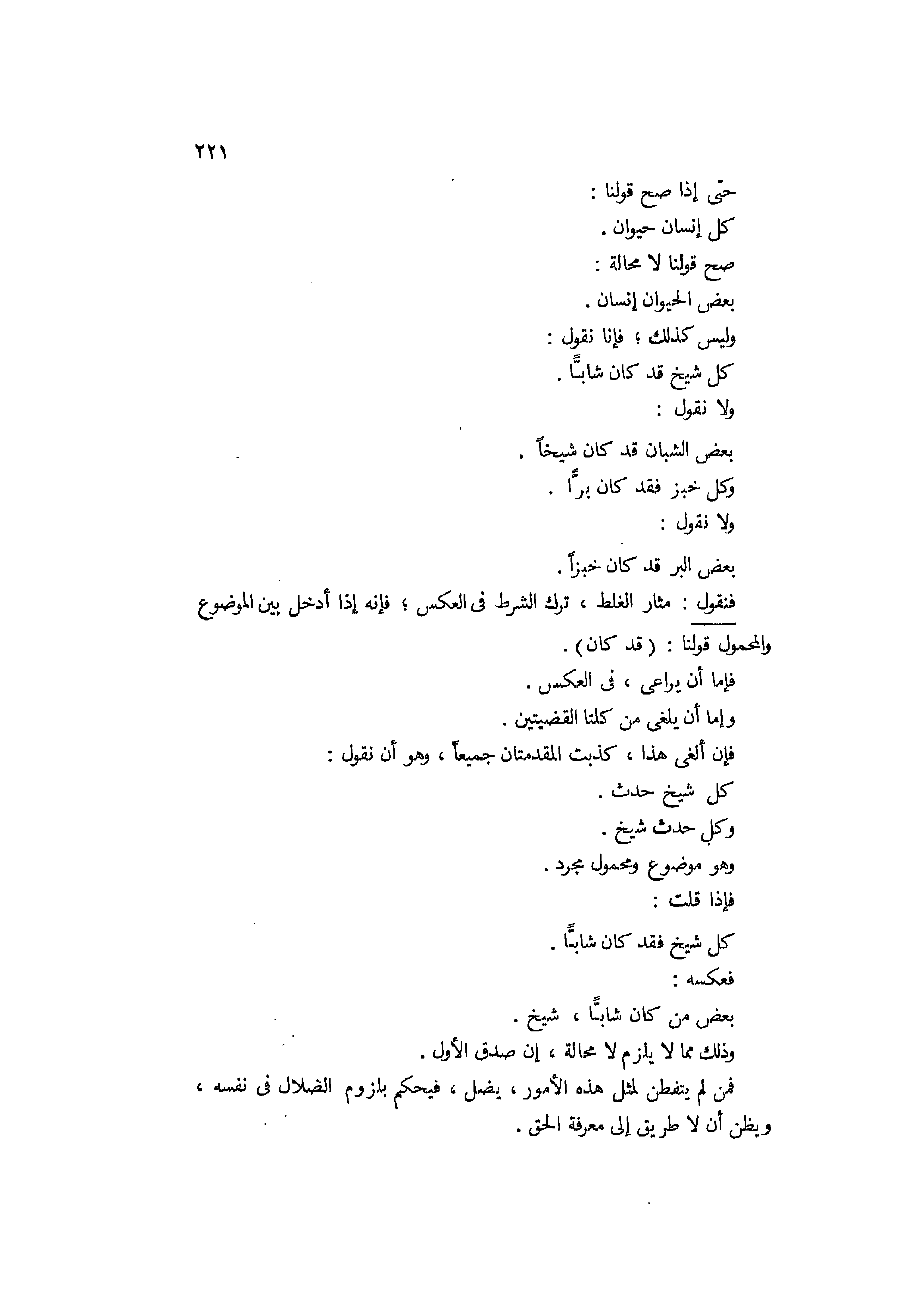 حتى إذا صح قولنا كل إنسان حيوان صح قولنا لا محالة بعض الحيوان إنسان. وليس كذلك فإنا نقول: كل شيخ قد كان شابا ولا نقول بعض الشبان قد كان شيخا، وكل خبز فقد كان برا ولا نقول بعض البر قد كان خبزا فنقول: مثار الغلط ترك الشرط في العكس، فإنه إذا أدخل بين الموضوع والمحمول قولنا قد كان، فإما أن يراعي في العكس وإما أن يلغى من كلتا القضيتين، فإن الغي هذا كذبت المقدمتان جميعا، وهو أن نقول كل شيخ حدث وكل حدث شيخ، وهو موضوع ومحمول مجرد، فإذا قلت: كل شيخ فقد كان شابا فعكسه بعض من كان شابا شيخ، وذلك مما يلزم لا محالة أن صدق الأول، فمن لم يتفطن لمثل هذه الأمور يضل فيحكم بلزوم الضلال في نفسه ويظن إلاّ طريق إلى معرفة الحق.