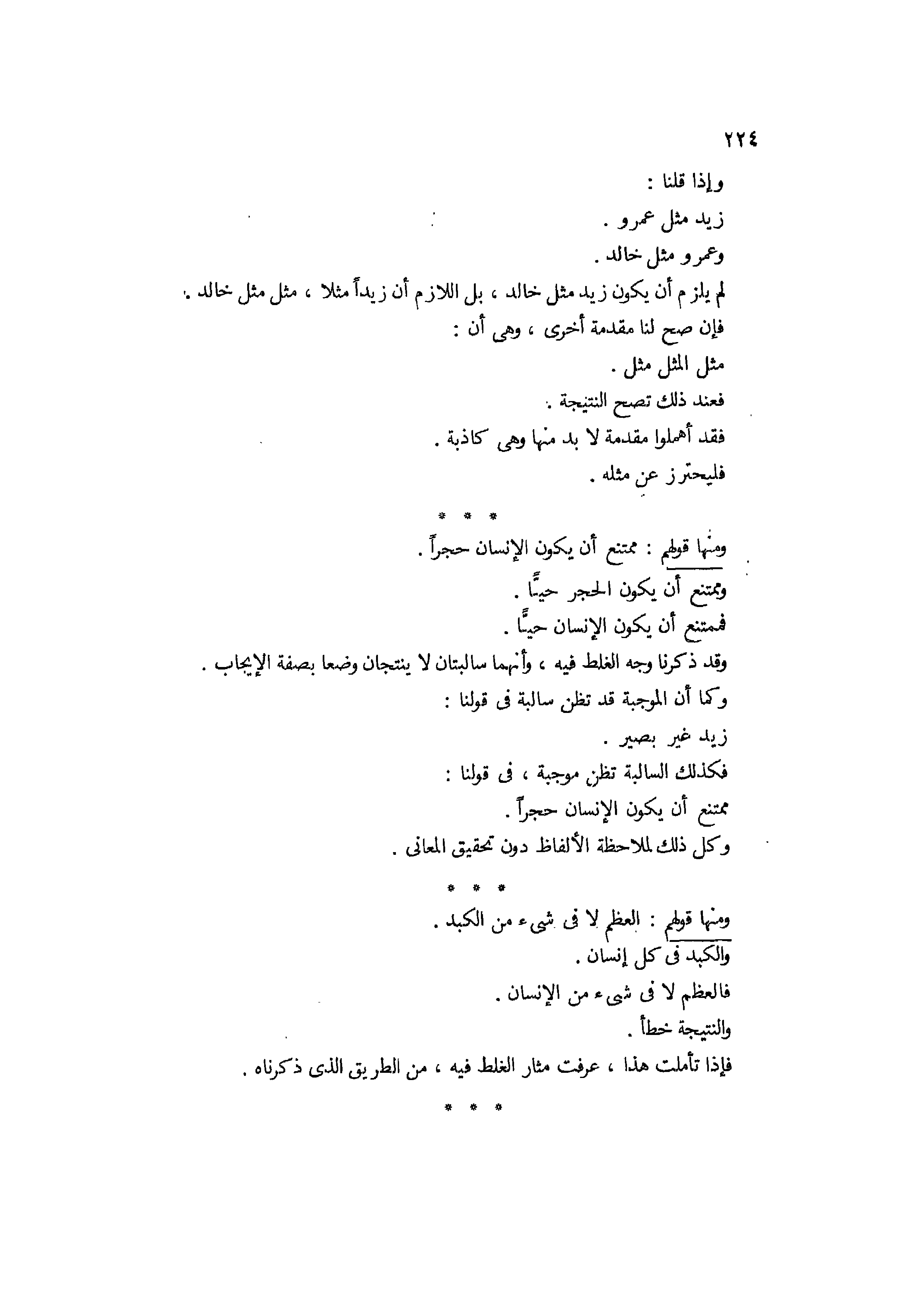 وإذا قلنا: زيد مثل عمرو وعمرو مثل خالد، لم يلزم أن يكون زيد مثل خالد بل اللازم أن زيدا مثلا مثل مثل خالد، فإن صح لنا مقدمة أخرى وهي أن مثل المثل مثل، فعند ذلك تصح النتيجة فقد أهملوا مقدمة لا بد منها وهي كاذبة فليحترز عن مثله.