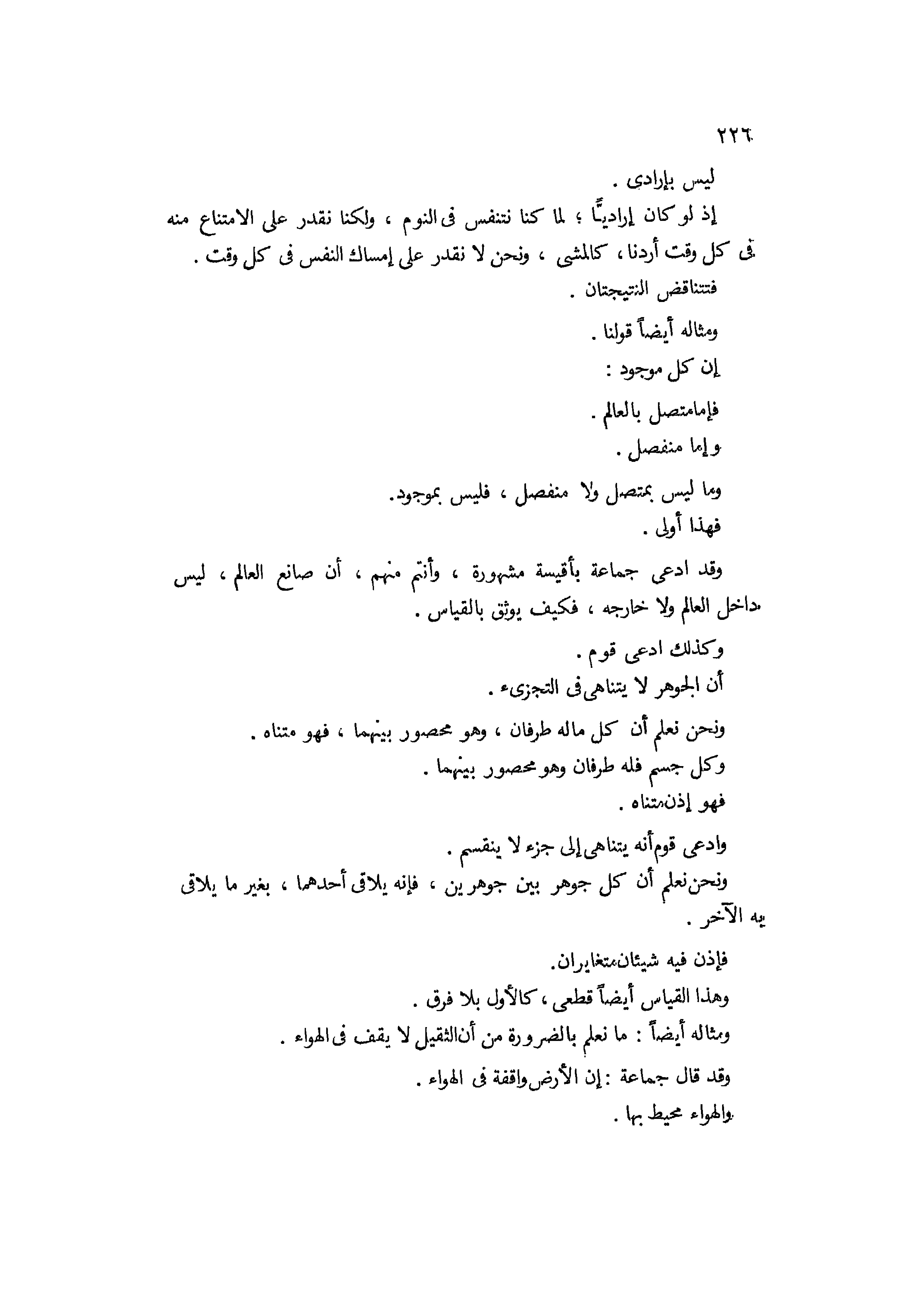 وادعى قوم أنه يتناهى إلى جزء لا ينقسم، ونحن نعلم أن كل جوهر بين جوهرين فإنه يلاقي أحدهما بغير ما يلاقي به الآخر، فإذن فيه شيئان متغايران وهذا القياس أيضا قطعي كالأول بلا فرق ومثاله أيضا ما نعمل بالضرورة من أن الثقيل لا يقف في الهواء، وقد قال جماعة أن الأرض واقفة في الهواء والهواء محيط بها