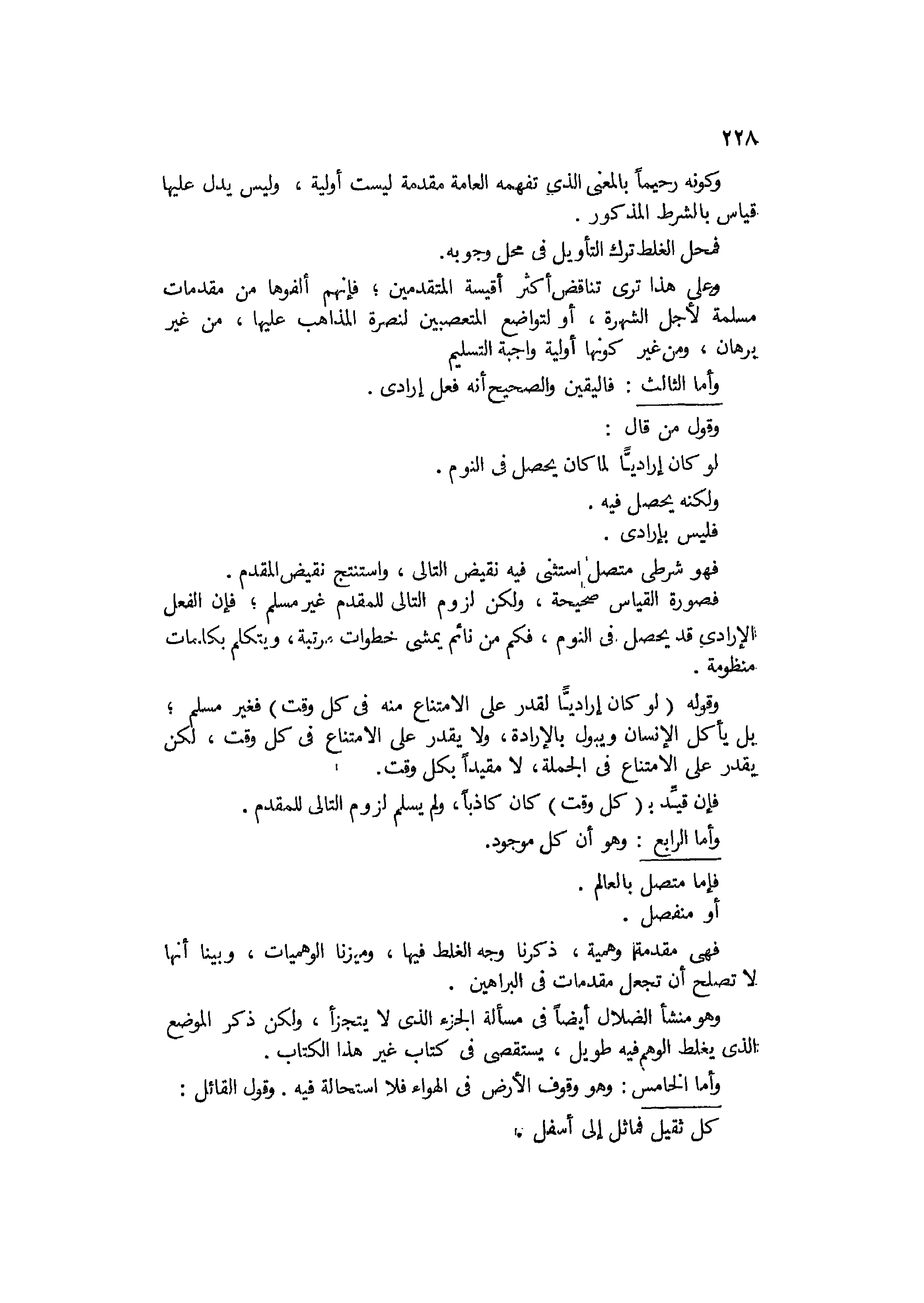 وأما الثالث فاليقين والصحيح انه فعل إرادي، وقول من قال: لو كان إراديا لما كان يحصل في النوم ولكنه يحصل فيه فليس بإرادي، فهو شرطي متصل إستثنى فيه نقيض التالي واستنتج نقيض المقدم، فصورة القياس صحيحة ولكن لزوم التالي للمقدم غير مسلم، فإن الفعل الإرادي قد يحصل في النوم فكم من نائم يمشي خطوات مرتبة ويتكلم بكلمات منظومة، وقوله: لو كان إراديا لقدر على الإمتناع منه في كل وقت، فغير مسلم بل يأكل الإنسان ويبول بالإرادة ولا يقدر على الإمتناع في كل وقت، لكن يقدر علىالإمتناع في الجملة لا مقيدا بكل وقت، فإن قيد بكل وقت كان كاذبا ولم يسلم لزوم التالي للمقدم.