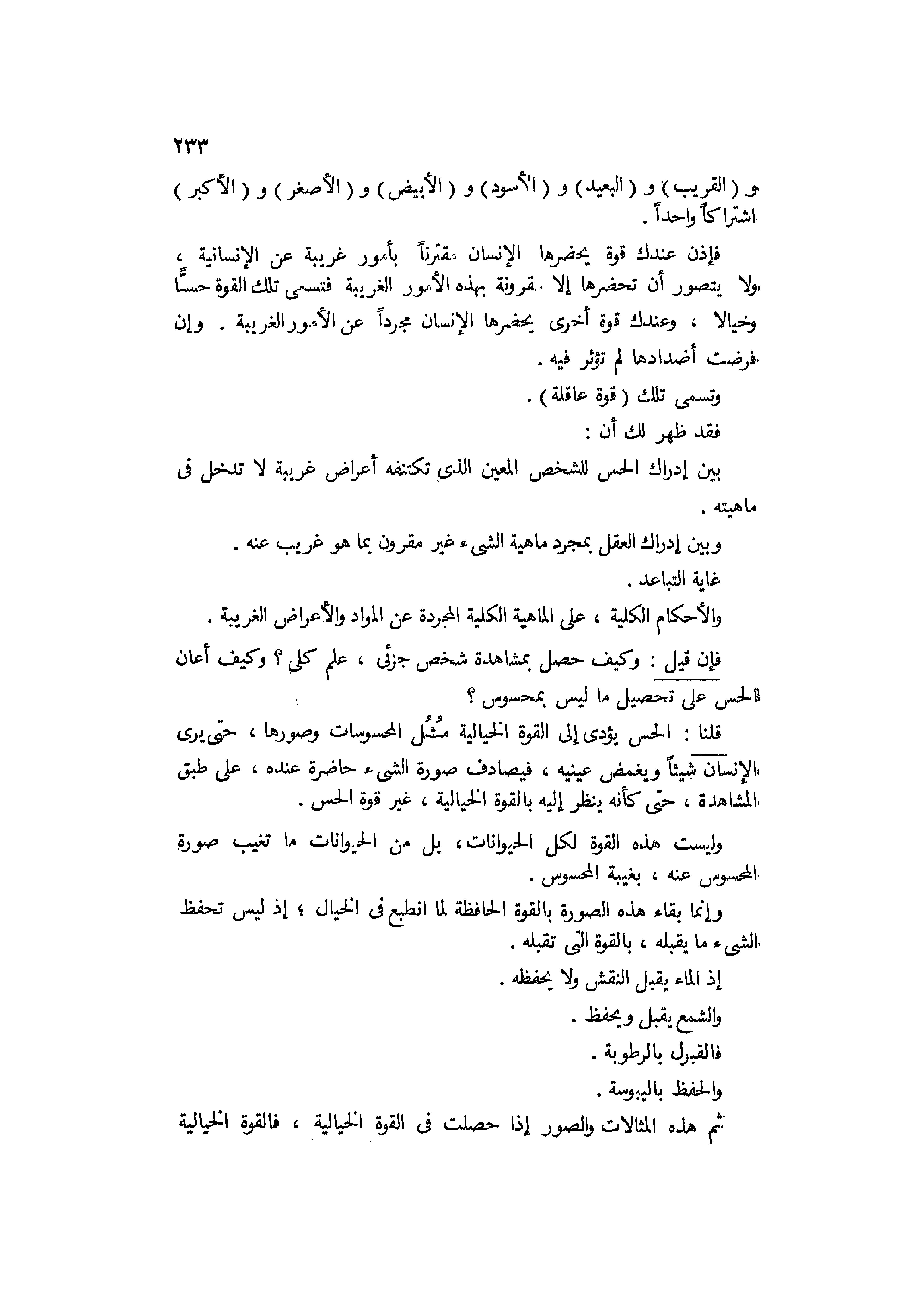 والقريب والبعيد والأسود والبيض والأصغر والأكبر إشتراكا واحدا، فإذن عندك قوة يحضرها الإنسان مقترنا بامور غريبة عن الإنسانية، ولا يتصور أن تحضرها إلامقرونة بهذه الأمور الغريبة فتسمى تلك القوة حسا وخيالا، وعندك قوة أخرى يحضرها الإنسان مجردا عن الأمور الغريبة، وإن فرضت أضدادها لم تؤثر فيه وتسمى تلك قوة عاقلة، فقد ظهر لك أن بين إدراك الحس للشخص المعين الذي تكتنفه أعراض غريبة لا تدخل في ماهيته، وبين إدراك العقل بمجرد ماهية الشيء غير مقرون بما هو غريب عنه، غاية التباعد والأحكام الكلية على الماهية الكلية المجردة عن المواد والأعراض الغريبة.