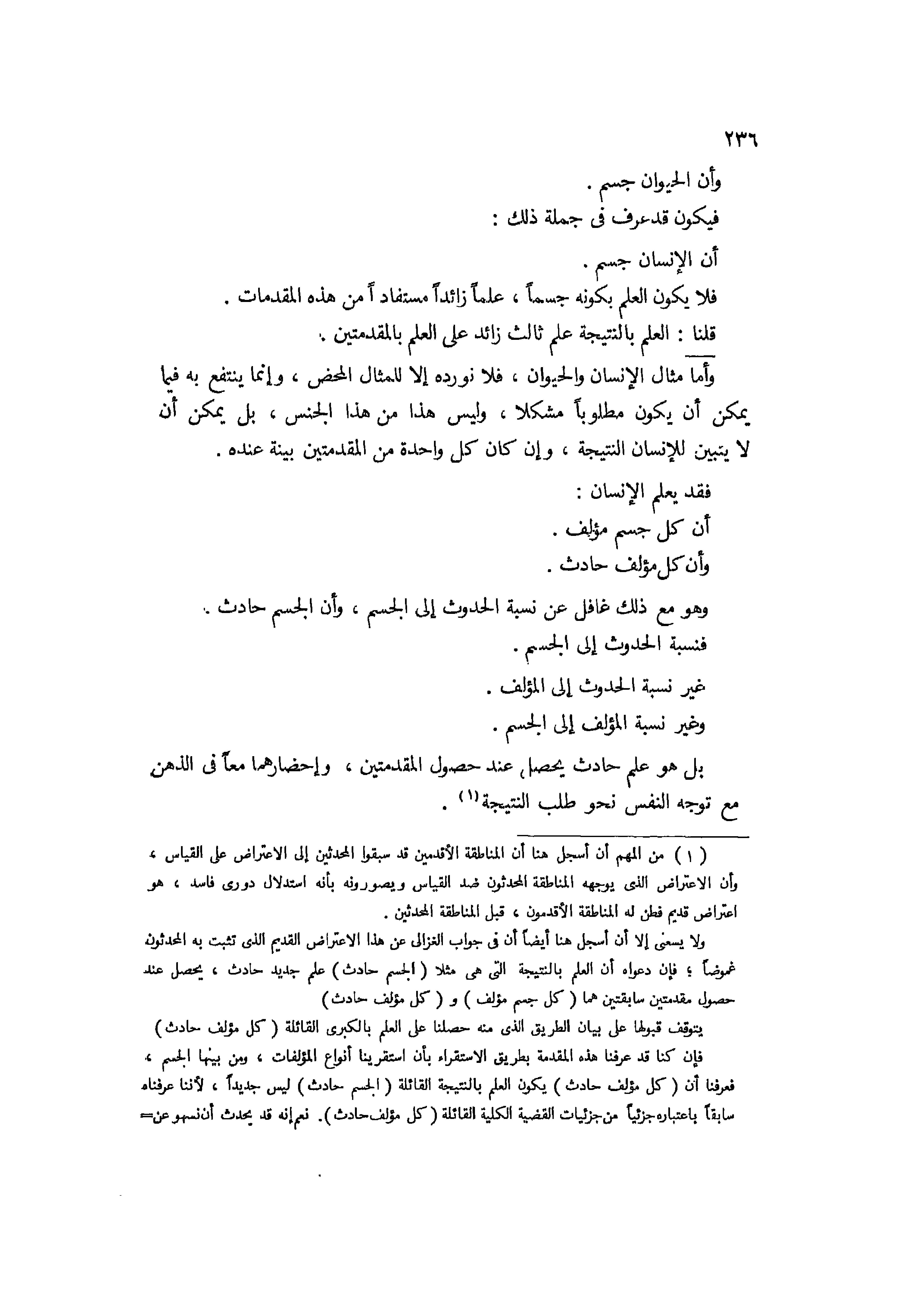 وأن الحيوان جسم، فيكون قد عرف في جملة ذلك أن الإنسان جسم، فلا يكون العلم بكونه جمسا علما زائدا مستفادا من هذه المقدمات. قلنا: العلم بالنتيجة علم ثابت زائد على العلم بالمقدمتين. وأما مثال الإنسان والحيوان فلا نورده إلا للمثال المحض، وإنما ينتفع بهب فيما يمكن أن يكون مطلوبا مشكلا، وليس هذا من هذا الجنس بل يمكن أن لا يتبين للإنسان النتيجة، وإن كان كل واحدة من المقدمتين بينة عنده فقد يعلم الإنسان أن كل جسم مؤلف، وأن كل مؤلف حادث، وهو مع ذلك غافل عن نسبة الحدوث إلى الجسم، وأن الجسم حادث فنسبة الحدوث إلى الجسم غير نسبة الحدوث إلى المؤلف، وغير نسبة المؤلف إلى الجسم بل هو علم حادث يحصل عند حصول المقدمتين وإحضارهما معا في الذهن، مع توجه النفس نحو طلب النتيجة.