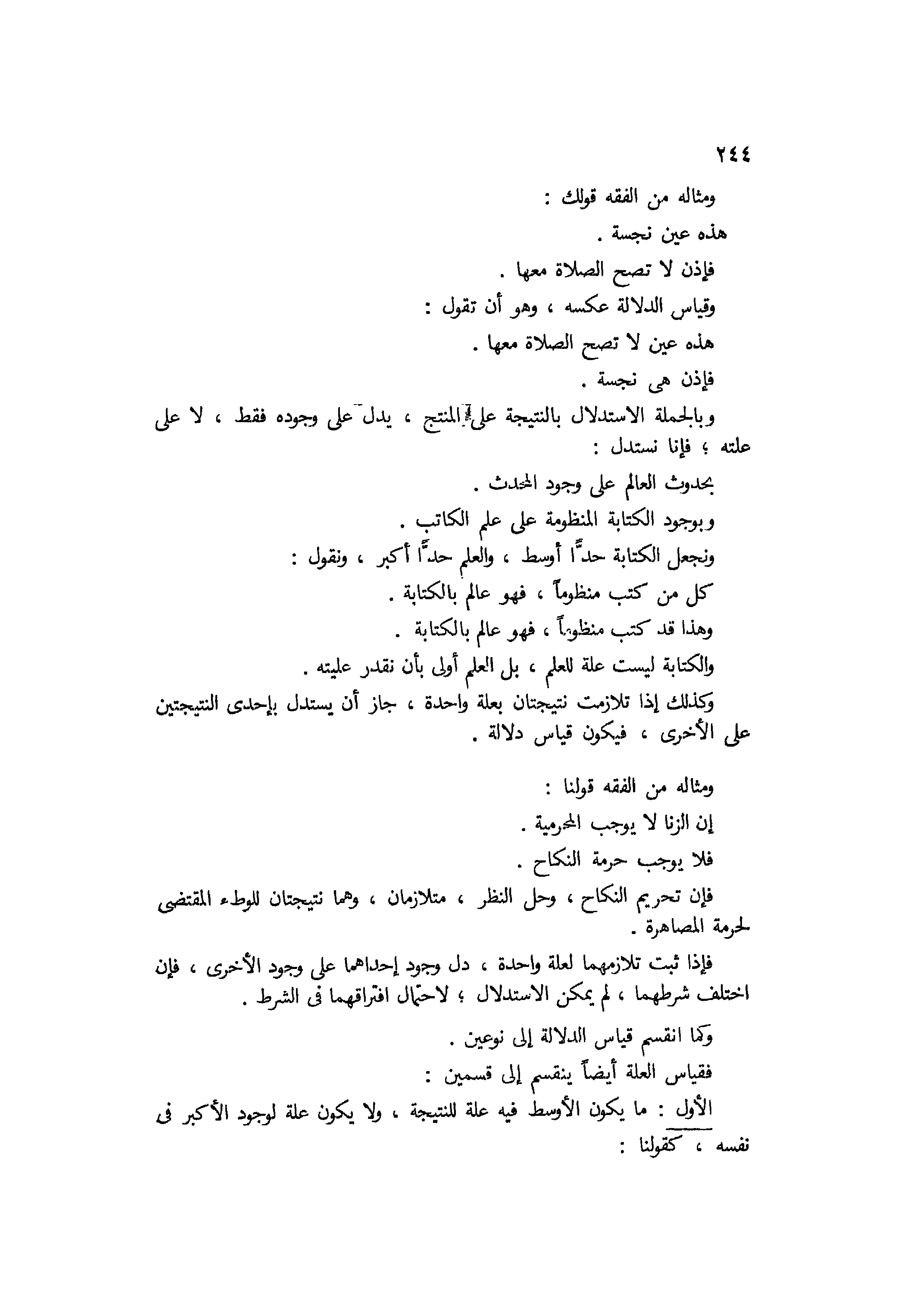 وبالجملة الإستدلال بالنتيجة على المنتج يدل على وجوده فقط لا على علته، فإنا نستدل بحدوث العالم على وجود المحدث، وبوجود الكتابة المنظومة على علم الكاتب، ونجعل الكتابة حدا أوسط والعلم حدا أكبر، ونقول كل من كتب منظوما فهو عالم بالكتابة، والكتابة ليست علة للعلم بل العلم أولى بأن نقدر عليته. وكذلك إذا تلازمت نتيجتان بعلة واحدة جاز أن يستدل بإحدى النتيجتين على الأخرى فيكون قياس دلالة. ومثاله من الفقه قولنا: إن الزنا لا يوجب المحرمية فلا يوجب حرمة النكاح، فإن تحريم النكاح وحل النظر متلازمان، وهما نتيجتان للوطء المقتضي لحرمة المصاهرة، فإذا ثبت تلازمهما لعلة واحدة دل وجود إحداهما على وجود الأخرى، فإن اختلف شرطهما لم يمكن الإستدلال لإحتمال افتراقهما في الشرط، وكما انقسم قياس الدلالة إلى نوعين فقياس العلة أيضا ينقسم إلى قسمين: الأول: ما يكون الأوسط فيه علة للنتيجة ولا يكون علة لوجود الأكبر في نفسه، كقولنا: