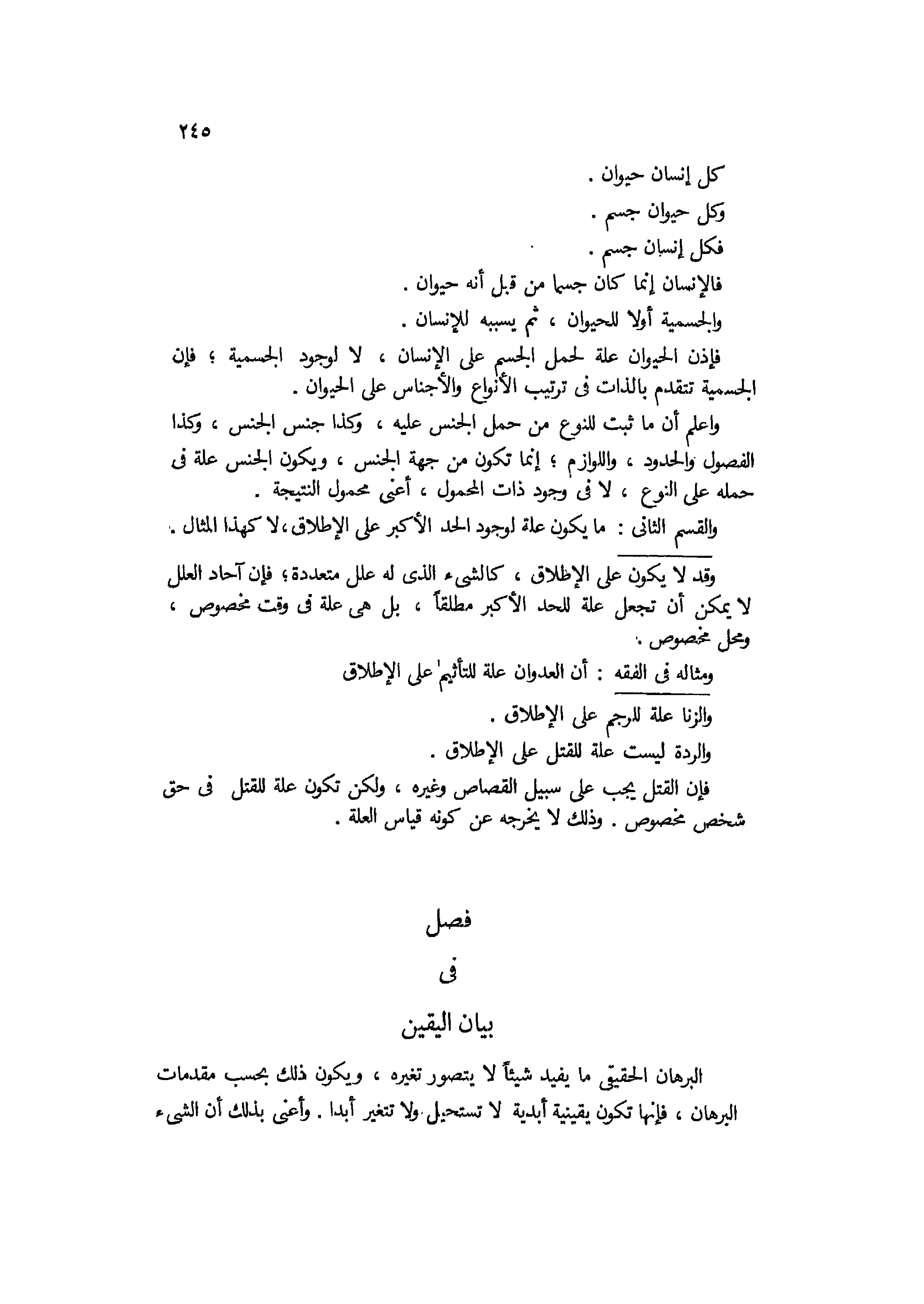 كل إنسان حيوان وكل حيوان جسم، فكل إنسان جسم. فالإنسان إنما كان جسما من قبل أنه حيوان والجسمية أولا للحيوان، ثم بسببه للإنسان، فإذا الحيوان علة لحمل الجسم على الإنسان لا لوجود الجسمية، فإن الجسمية تتقدم بالذات في ترتيب الأنواع والأجناس على الحيوان.