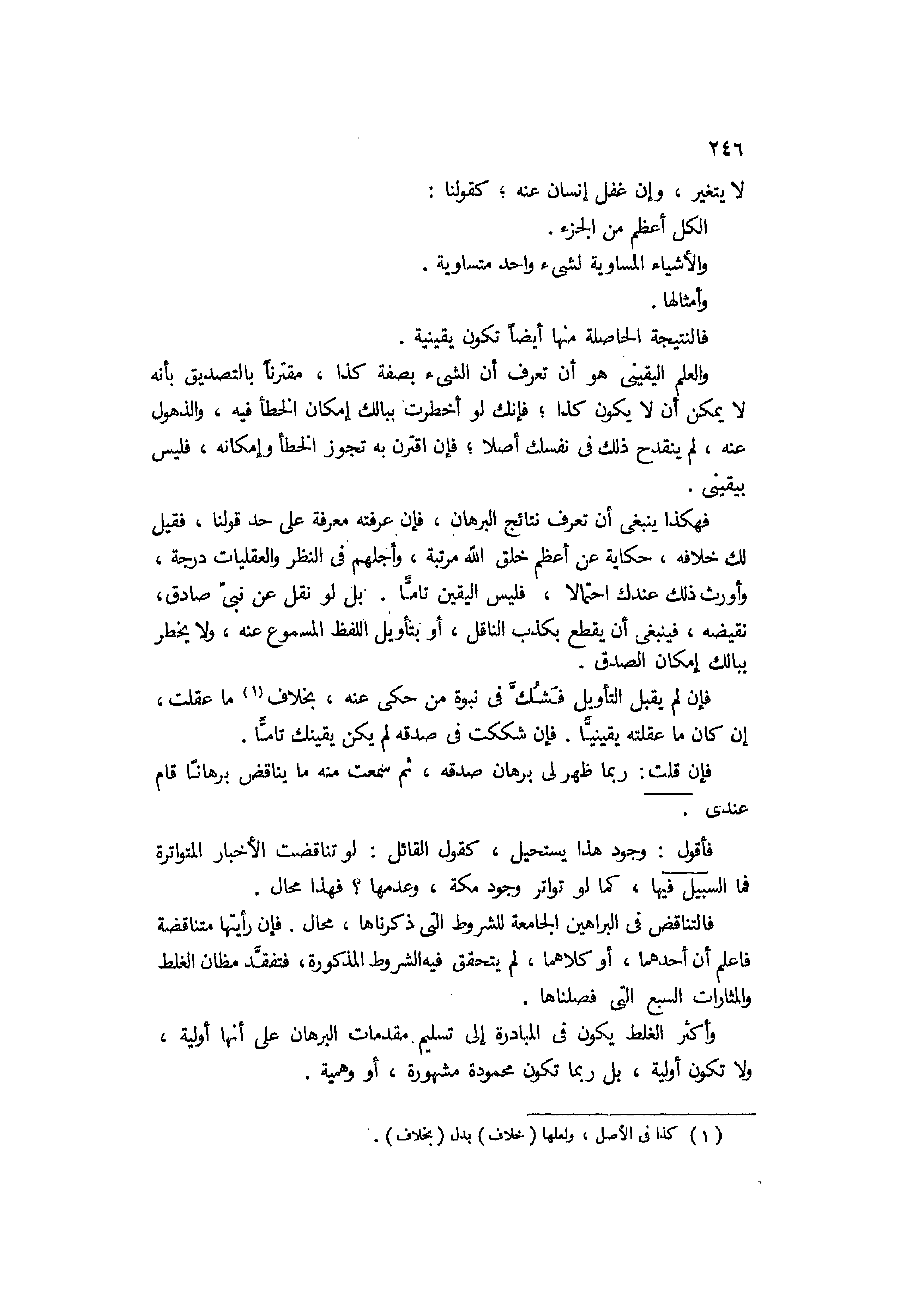 وأن غفل إنسان عنه كقولنا: الكل أعظم من الجزء والأشياء المساوية لشيء واحد متساوية وأمثالها، فالنتيجة الحاصلة منها أيضا تكون يقينية، والعلم اليقيني هو أن تعرف أن الشيء بصفة كذا مقترنا بالتصديق بأنه لا يمكن ان لا يكون كذا، فإنك لو أخطرت ببالك إمكان الخطأ فيه والذهول عنه لم ينقدح ذلك في نفسك أصلا، فإن إقترن به تجوز الخطأ وإمكانه فليس بيقيني؛ فهكذا ينبغي أن تعرف نتائج البرهان، فإن عرفته معرفة على حد قولنا فقيل لك خلافه حكاية عن أعظم خلق الله مرتبة وأجلهم في النظر والعقليات درجة، وأورث ذلك عندك احتمالا، فليس اليقين تاما، بل لو نقل عن نبي صادق نقيضه فينبغي أن يقطع بكذب الناقل أو بتأويل اللفظ المسموع عنه، ولا يخطر ببالك إمكان الصدق، فإن لم يقبل التأويل فشك في نبوة من حكى عنه بخلاف ماعقلت إن كان ما عقلته يقينا فإن شككت في صدقه لم يكن يقينك تاما.