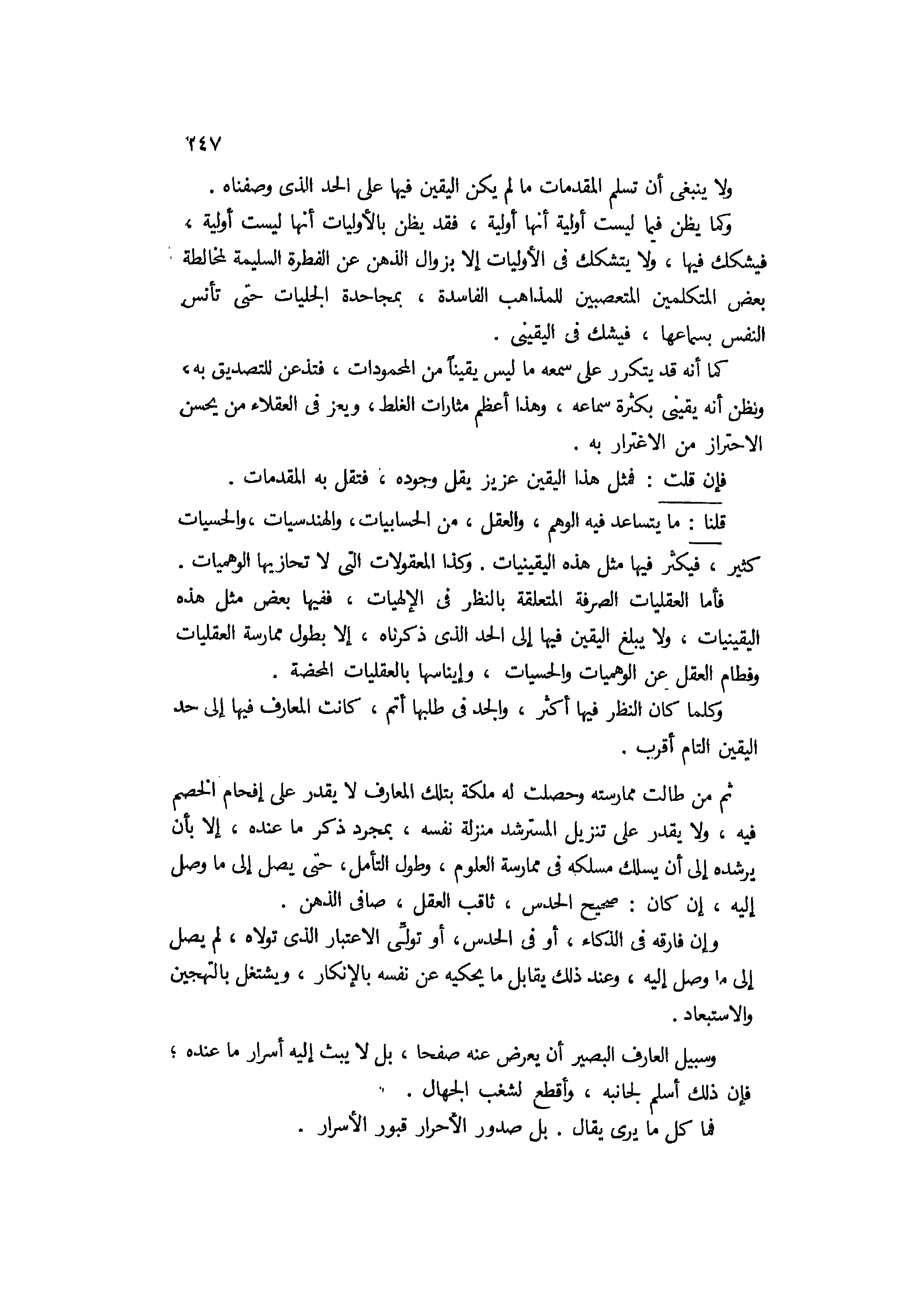 ولا ينبغي أن تسلم المقدمات ما لم يكن اليقين فيها على الحد الذي وصفناه. وكما يظن فيما ليست أولية أنها أولية فقد يظن بالأوليات أنها ليست أولية فيشكك فيها، ولا يتشكك في الأوليات إلا بزوال الذهن عن الفطرة السليمة، لمخالطة بعض المتكلمين المتعصبين للمذاهب الفاسدة بمجاحدة الجليات حتى تأنس النفس بسماعها فيشك في اليقيني، كما أنه قد يتكرر على سمعه ما ليس يقينا من المحمودات فتذعن للتصديق به وتظن أنه يقيني بكثرة سماعه، وهذا أعظم مثارات الغلط ويعز في العقلاء من يحسن الإحتراز من الإغترار به.