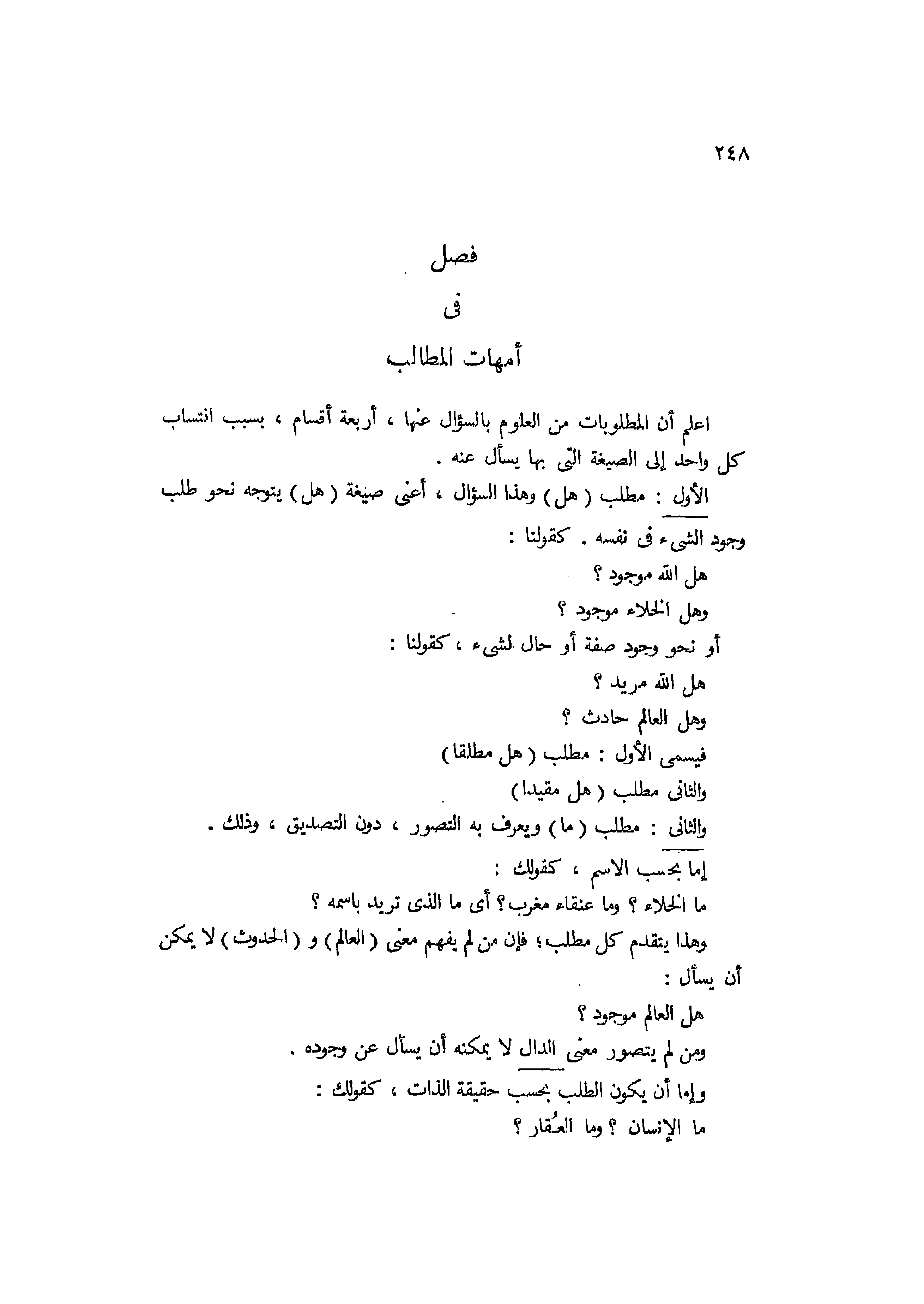 إعلم أن المطلوبات من العلوم بالسؤال عنها أربعة أقسام بسبب إنتساب كل واحد إلى الصيغة التي بها يسأل عنه: الأول: مطلب " هل " وهذا السؤال أعني صيغة هل، يتوجه نحو طلب وجود الشيء في نفسه كقولنا: الله موجود وهل الخلاء موجود؟ أو نحو وجود صفة أو حال لشيء كقولنا: هل الله مريد وهل العالم حادث؟ فيسمى الأول مطلب هل مطلقا والثاني مطلب هل مقيدا.