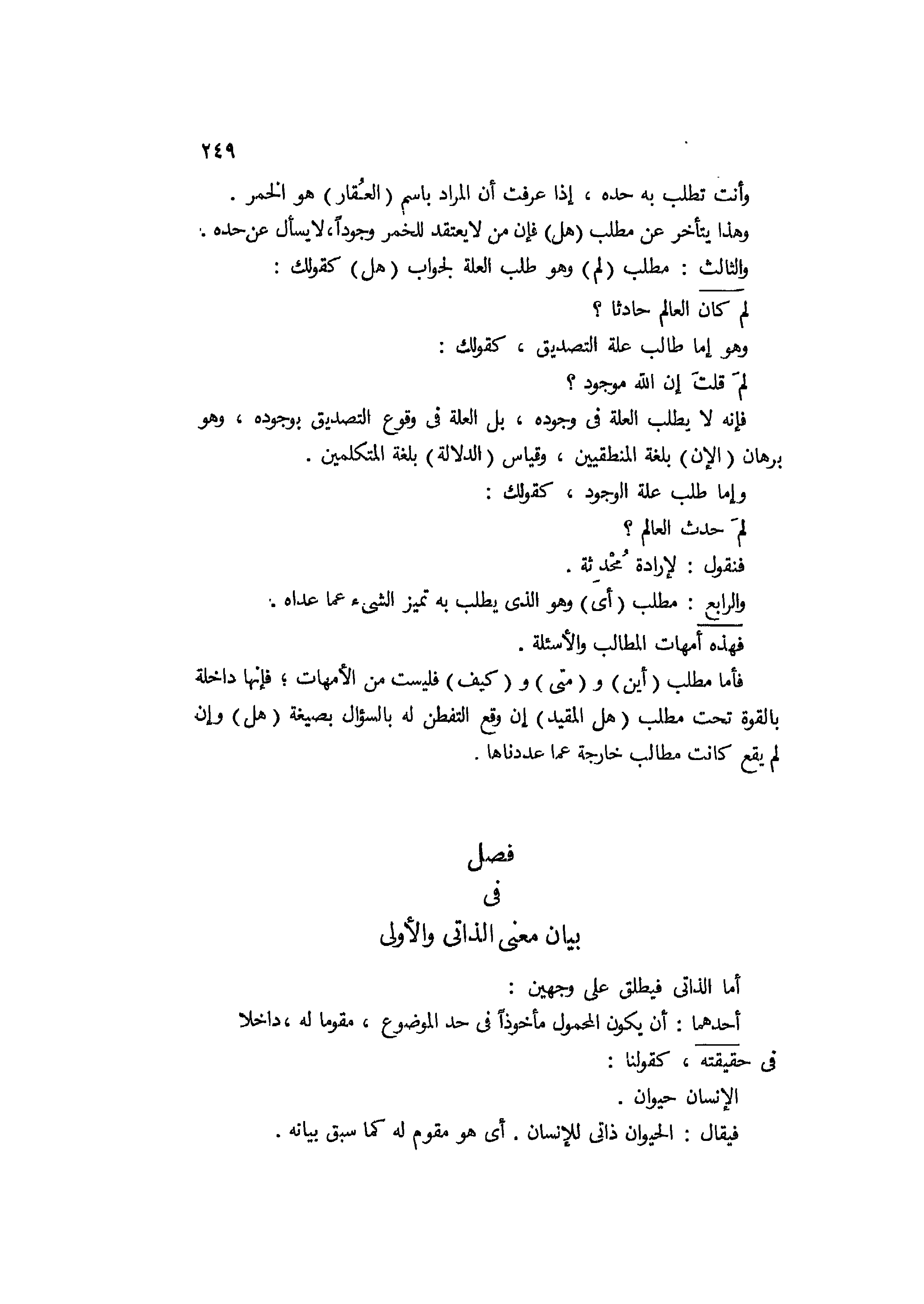 والثالث: مطلب " لم " وهو طلب العلة لجواب هل كقولك: لم كان العالم حادثا؟ وهو إما طلب علة التصديق كقولك: لم قلت أن الله موجود؟ فإنه لا يطلب العلة في وجوده بل العلة في وقوع التصديق بوجوده، وهو برهان الآن بلغة المنطقيين، وقياس الدلالة بلغة المتكلمين، وإما طلب علة الوجود كقولك لم حدث العالم؟ فنقول: لإرادة محدثة.
