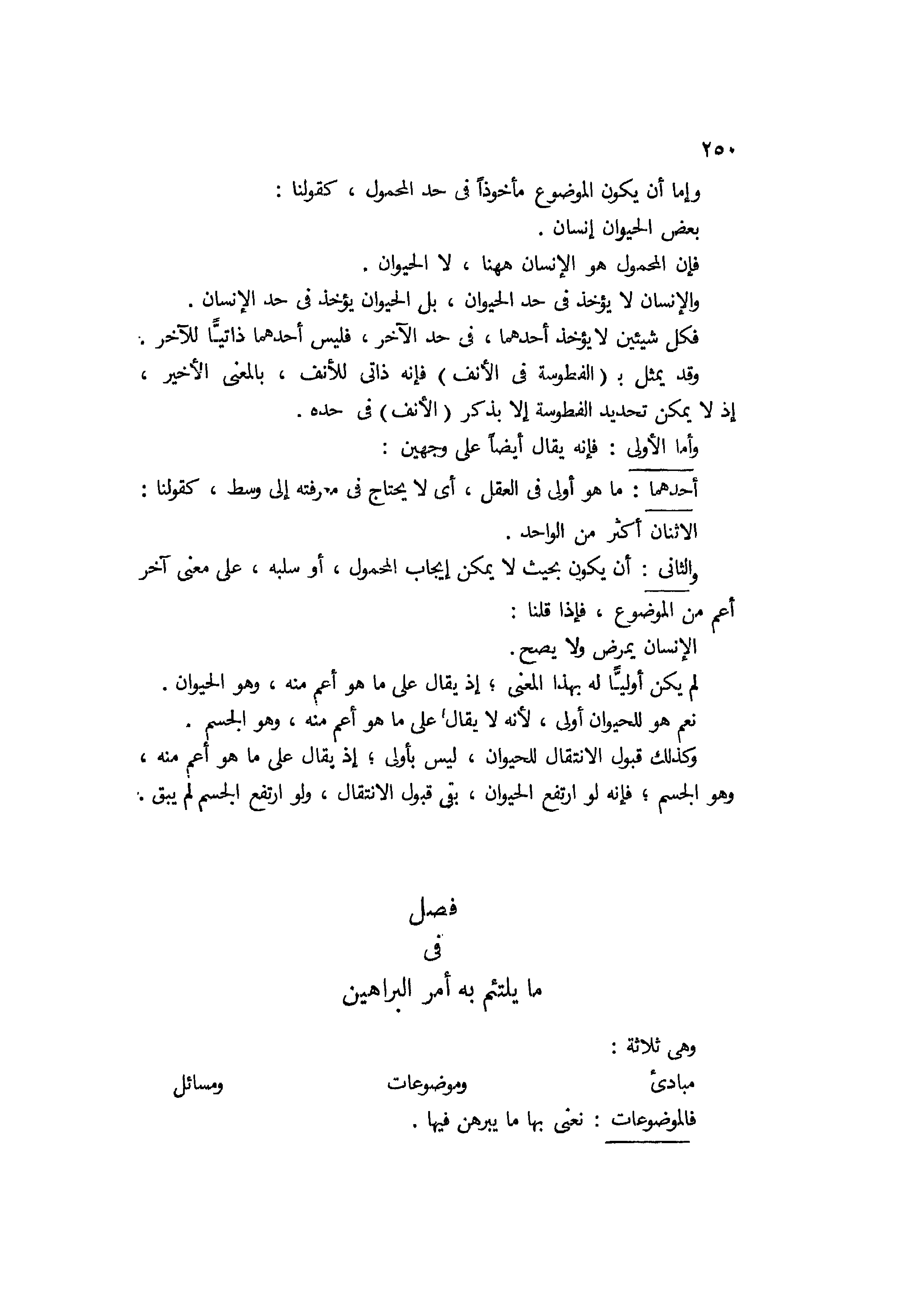 وهي ثلاثة: مبادي وموضوعات ومسائل. فالموضوعات نعني بها ما يبرهن فيها،