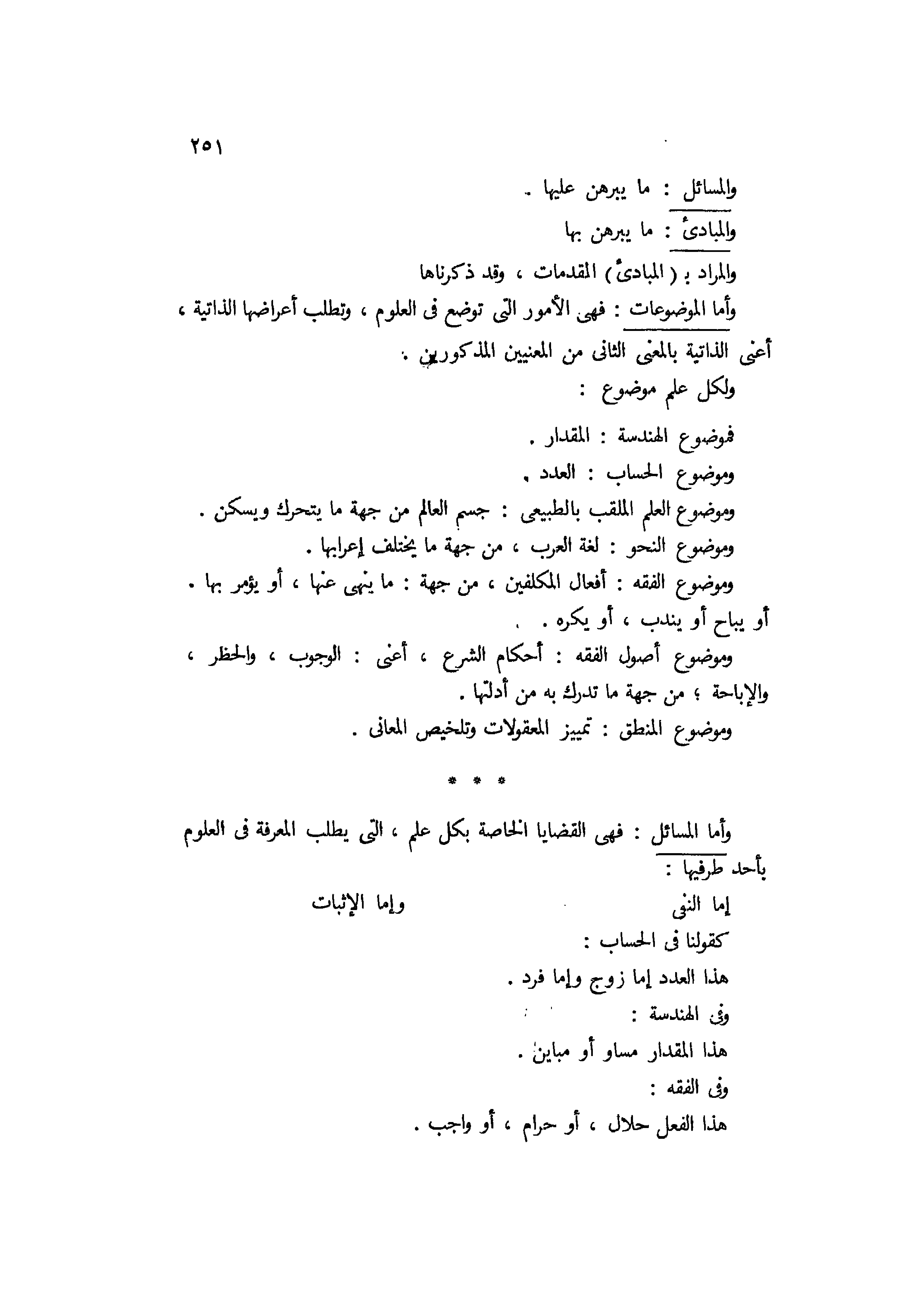 وأما المسائل فهي القضايا الخاصة بكل علم، التي يطلب المعرفة في العلوم بأحد طرفيها: إما النفي وإما الإثبات كقولنا في الحساب: هذا العدد إمازوج او فرد، وفي الهندسة: هذا المقدار مساو أو مباين، وفي الفقه: هذا الفعل حلال أوحرام أو واجب،