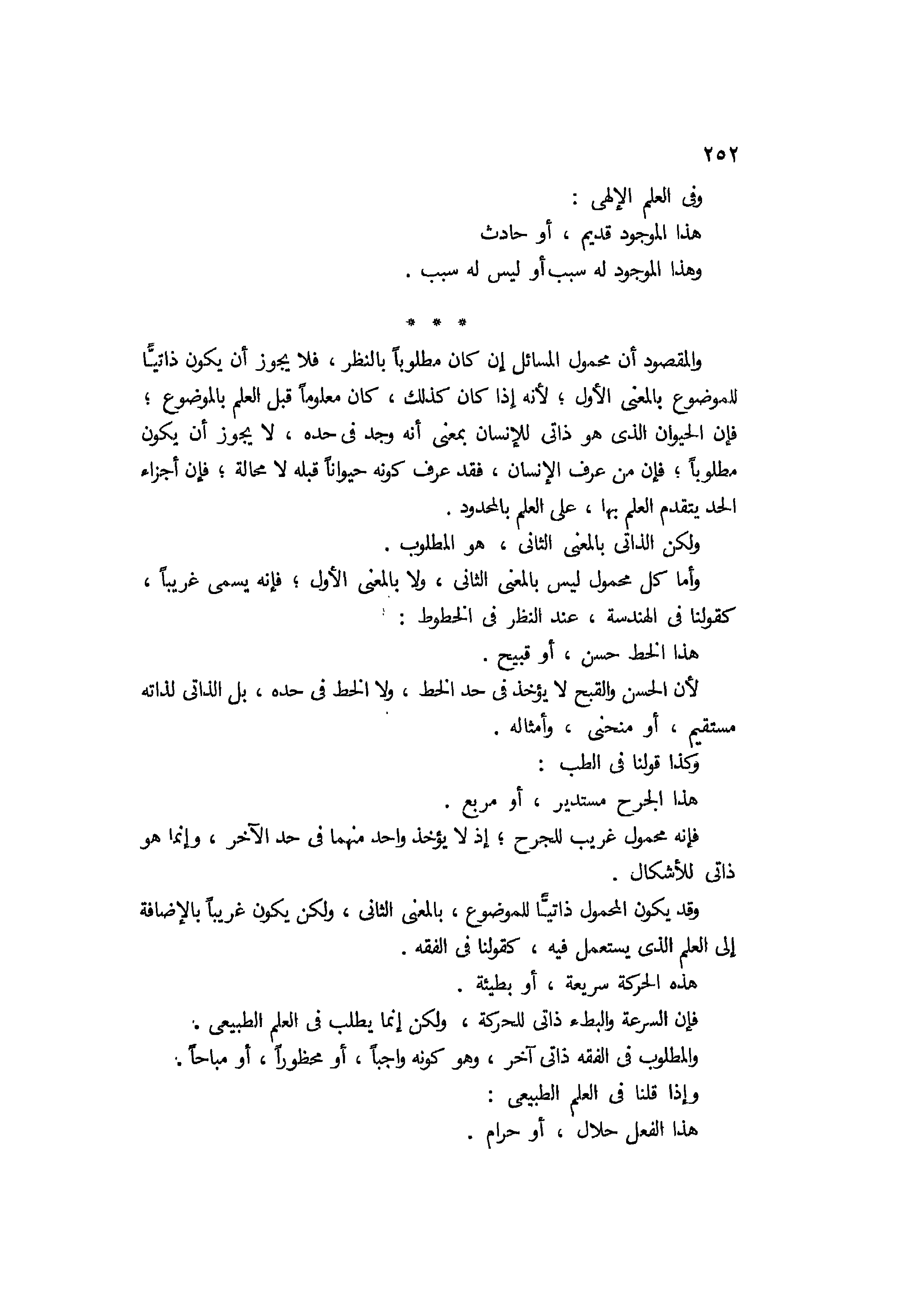 وفي العلم الإلهي: هذا الموجود قديم أو حادث وهذا الموجود له سبب أو ليس له سبب.