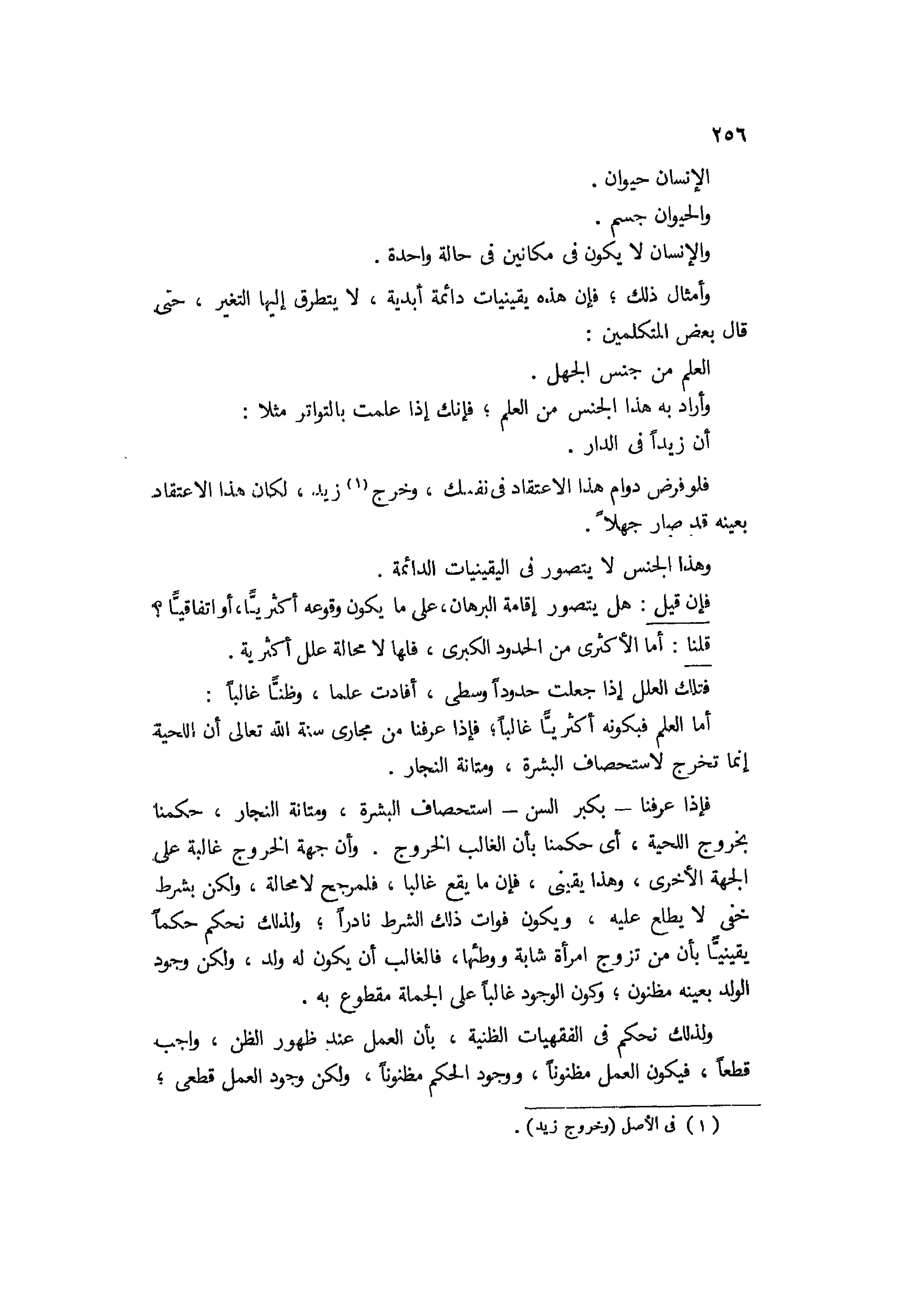 الإنسان حيوان والحيوان جسم والإنسان لا يكون في مكانين في حالة واحدة، وأمثال ذلك فإن هذه يقينيات دائمية أبدية لا يتطرق إليها التغير حتى قال بعض المتكلمين: العلم من جنس الجهل، وأراد به هذا الجنس من العلم. فإنك إذا علمت بالتواتر مثلا أن زيدا في الدار، فلو فرض دوام هذا الإعتقاد في نفسك وخروج زيد لكان هذا الإعتقاد بعينه قد صار جهلا، وهذاالجنس لا يتصور في اليقينيات الدائمة. فإن قيل: هل يتصور إقامة البرهان على ما يكن وقوعه أكثريا أو اتفاقيا؟ قلنا: أما الأكثري من الحدود الكبرى فلها لا محالة علل اكثيرة، فتلك العلل إذا جعلت حدودا وسطى أفادت علما وظنا غالبا.