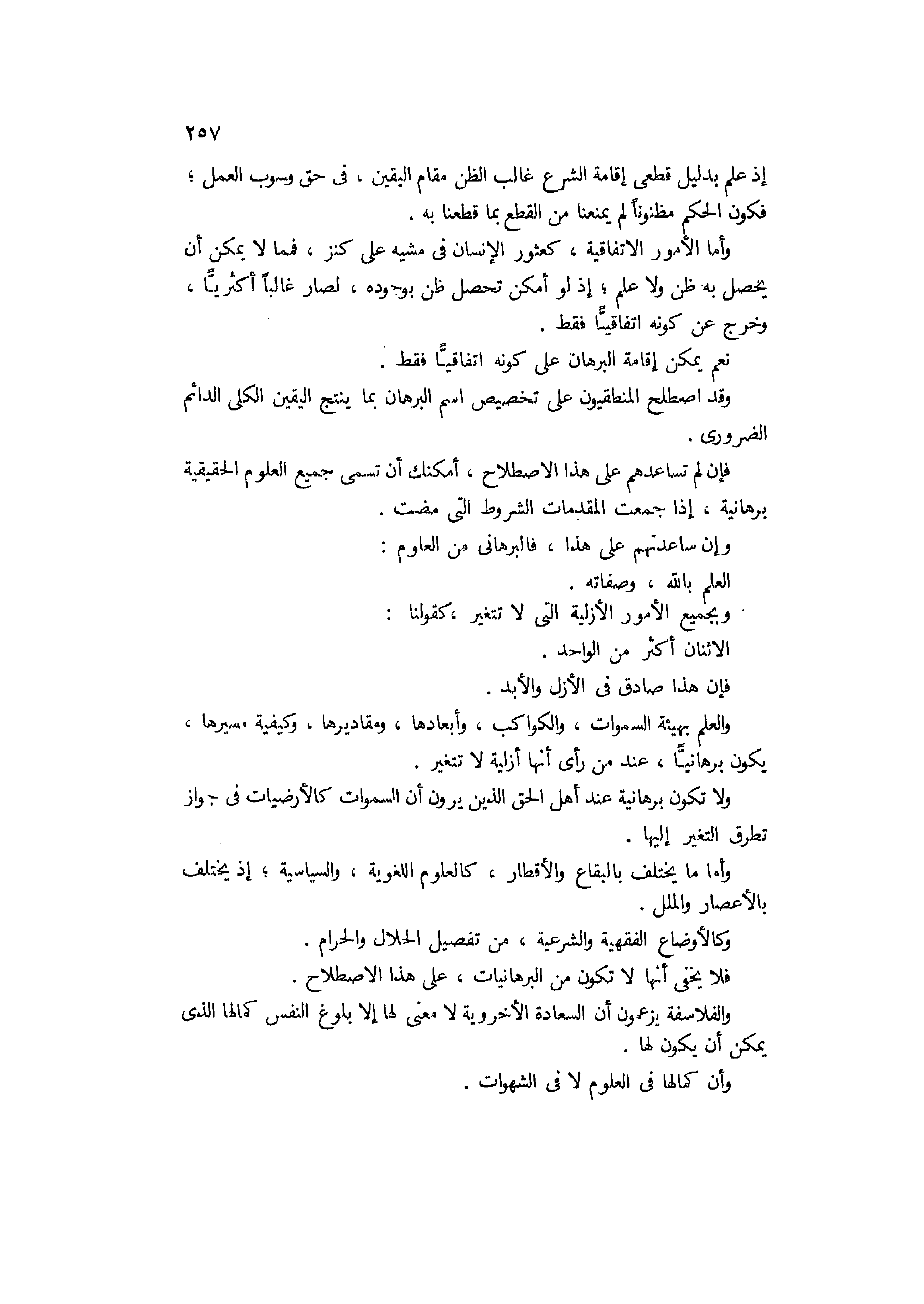 نعم يمكن إقامة البرهان على كونه اتفاقيا فقط، وقد اصطلح المنطقيون على تخصيص إسم البرهان بما ينتج اليقين الكلي الدايم الضروري، فإن لم تساعدهم على هذا الإصطلاح أمكنك أن تسمي جميع العلوم الحقيقية برهانية إذا جمعت المقدمات الشروط التي مضت، وأن ساعدتهم على هذا، فالبرهاني من العلوم العلم بالله وصفاته وبجميع الأمور الأزلية التي لا تتغير كقولنا: الإثنان أكثر من الواحد؛ فإن هذا صادق في الأزل، والأبد والعلم بهيئة السموات والكواكب وإبعادها ومقاديرها وكيفية مسيرها يكون برهانيا عند من رأى أنها أزلية لا تتغير، ولا تكون برهانية عند أهل الحق الذين يرون أن السموات كالأرضيات في جواز تطرق التغير إليها.