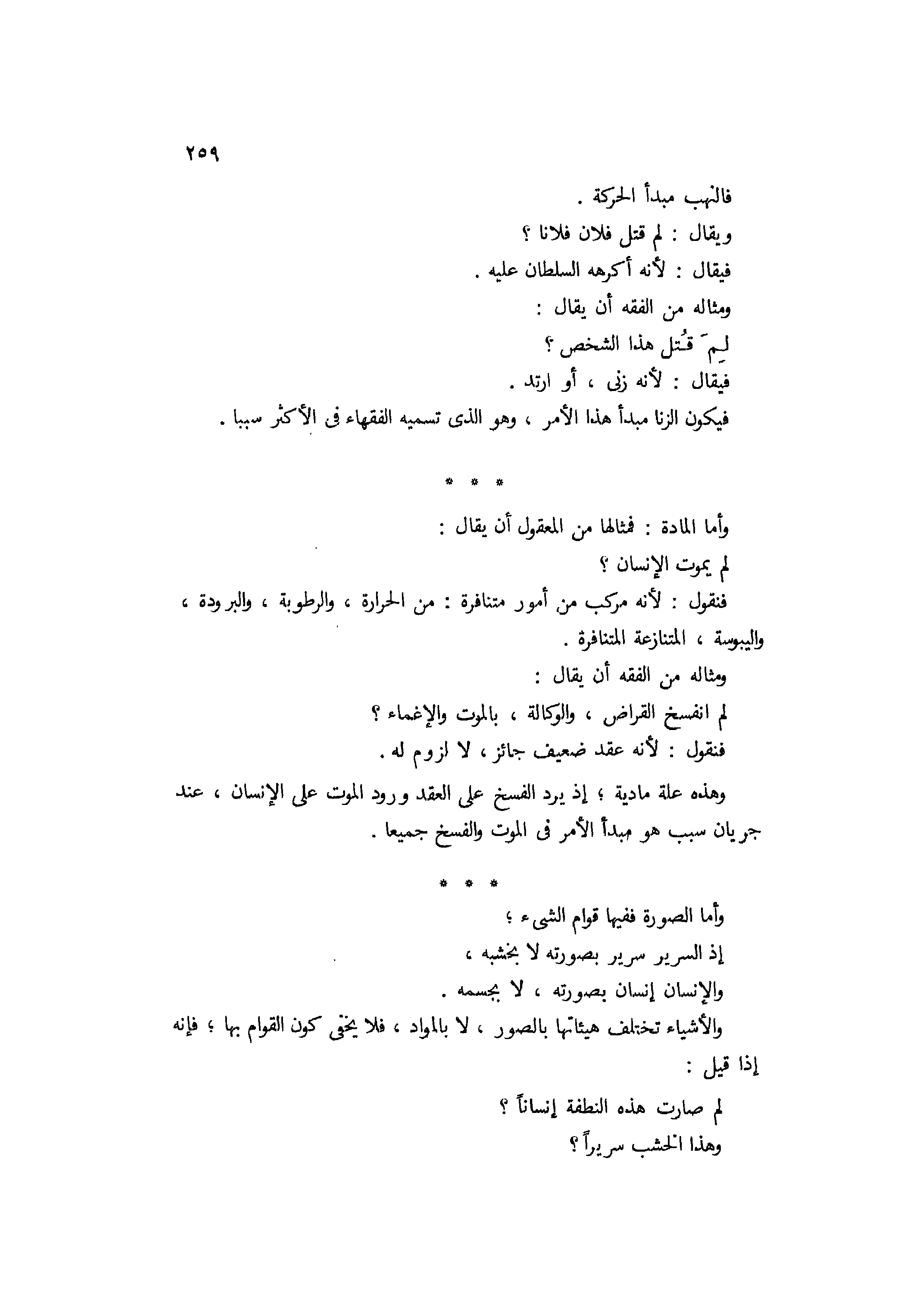 فالنهب مبدأ الحركة. ويقال: لم اقتل فلانا؟ فيقال: لانه أكرهه السلطان عليه. ومثاله من الفقه أن يقال: لم قتل هذا الشخص؟ فيقال: لأنه زنى أوارتد، فيكون الزنا مبدأ هذا الأمر وهو الذي تسميه الفقهاء في الأكثر سببا، وأما المادة فمثالها من المعقول أني قال: لم يموت الإنسان؟ فتقول: لأنه مركب من أمور متنافرة من الحرارة والرطوبة والبرودة واليبوسة المتنازعة المتنافرة. ومثاله من الفقه أن يقال: لم انفسخ القراض والوكالة بالموت والإغماء؟ فتقول: لأنه عقد ضعيف جائز لا لزوم له، وهذه علة ماديةإذ يرد الفسخ على العقد ورود الموت على الإنسان عند جريان سبب هومبدأ الأمر في الموت والفسخ جميعا.