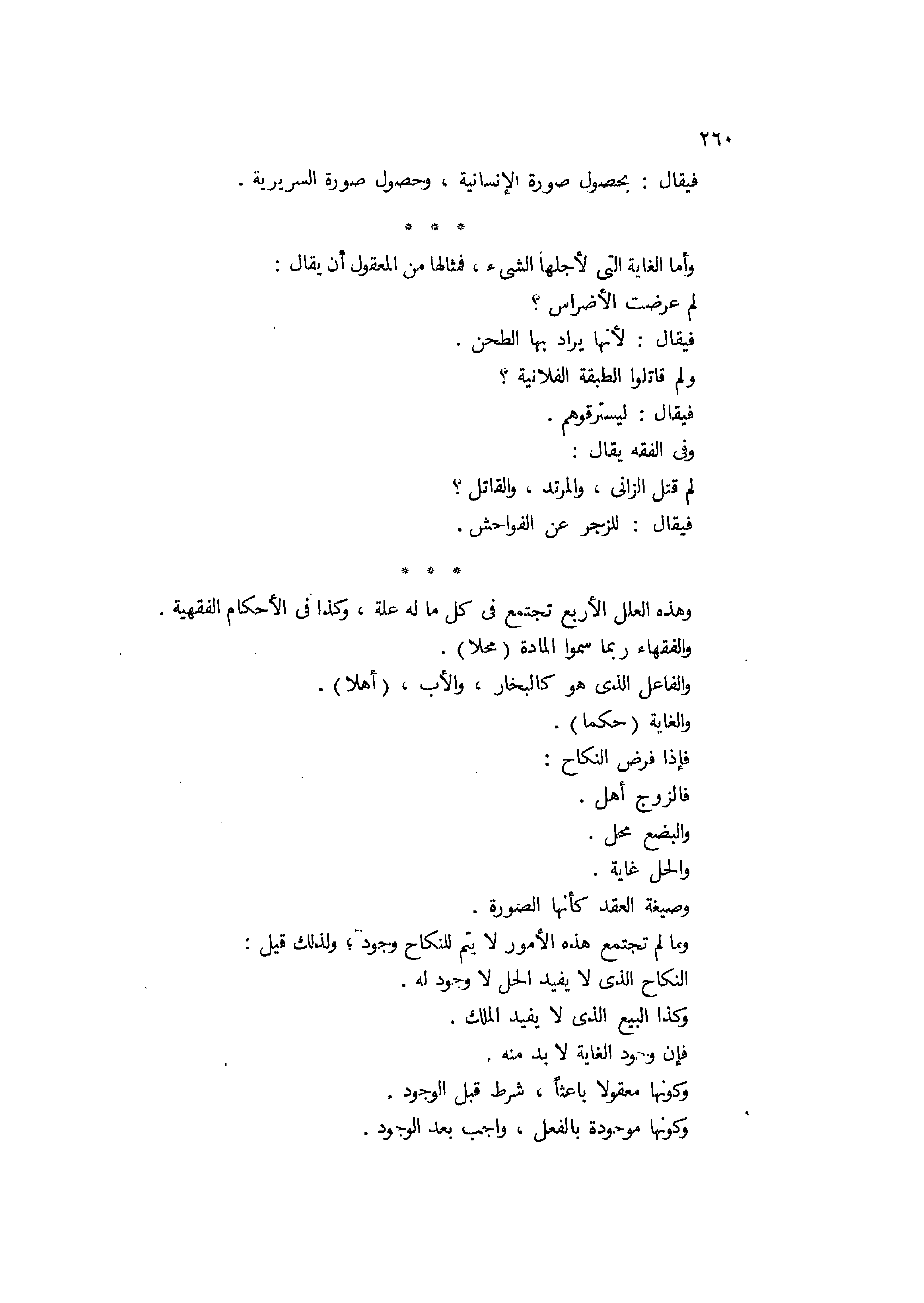 فيقال: بحصول صورة الإنسانية وحصول صورة السريرية. وأما الغاية التي لأجلها الشيء فمثالها من المعقول أن يقال: لم عرضت الأضراس؟ فيقال: لأنها يراد بها الطحن. ولم قاتلوا الطبقة الفلانية؟ فيقال: ليسترقوهم. وفي الفقه يقال: لم قتل الزاني والمرتد والقاتل؟ فيقال: للزجر عن الفواحش. وهذه العلل الأربع تجتمع في كل ما له علة، وكذا في الأحكام الفقهية، والفقهاء ربما سموا المادة محلا والفاعل الذي هو كالنجار والأب أهلا، والغاية حكما، فإذا فرض النكاح فالزوج أهل والبضع محل والحل غاية وصيغة العقد كأنها الصورة، وما لم تجتمع هذه الأمور لا يتم للنكاح وجود، ولذلك قيل: النكاح الذي لا يفيد الحل لا وجود له، وكذا البيع الذي لا يفيد الملك فإن وجود الغاية لا بد منه، وكونها معقولا باعثا شرط قبل الوجود،