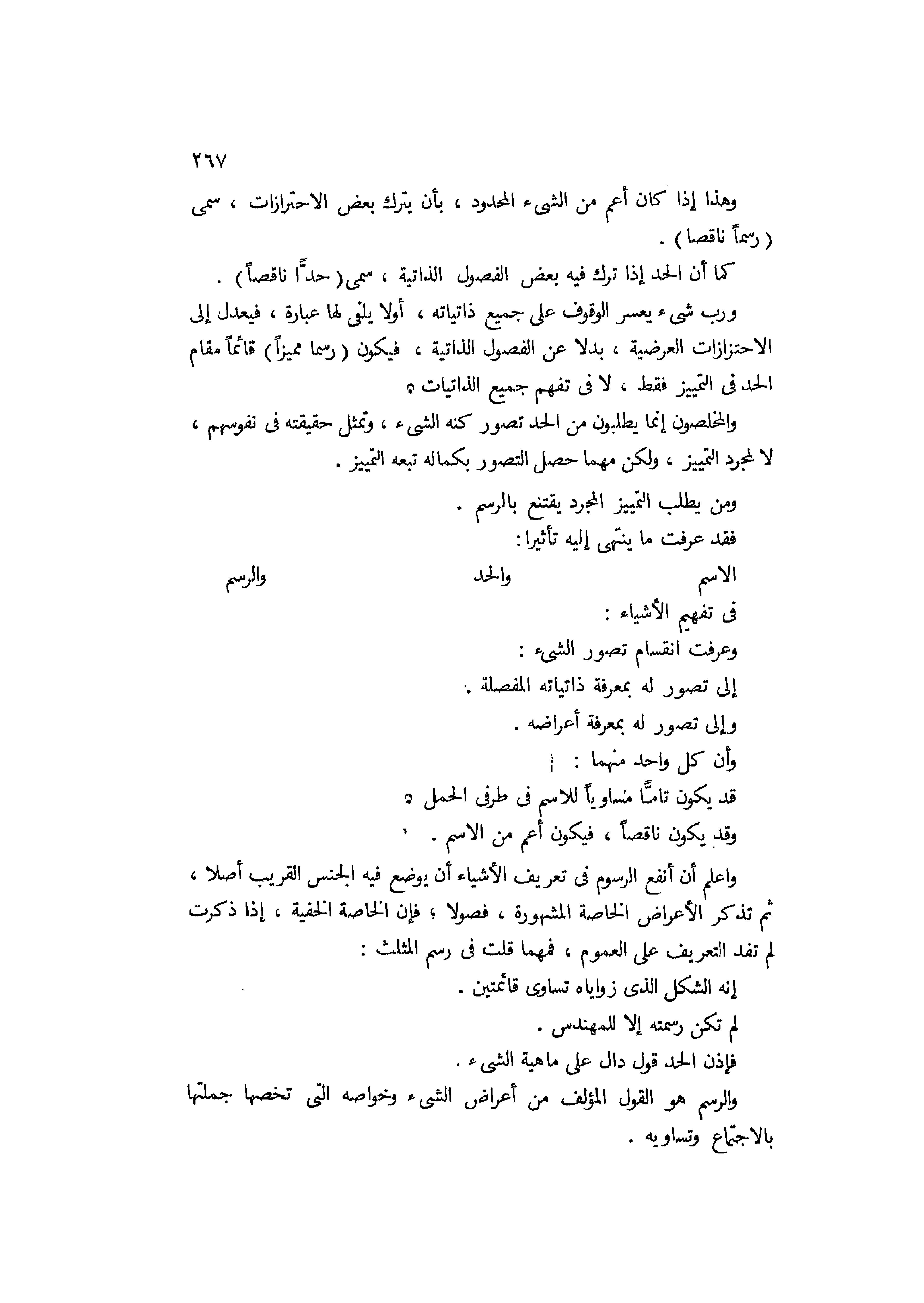 وهذا إذا كان أعم من الشيء المحدود بأن يترك بعض الإحترازات سمي رسما ناقصا، كما أن الحد إذا ترك فيه بعض الفصول الذاتية فيكون سمي حدا ناقصا، ورب شيء يعسر الوقوف على جميع ذاتياته أولا يلفى لها عبارة فيعدل إلى الإحترازات العرضية بدلا عن الفصول الذاتية فيكون رسما مميزا، قائما مقام الحد في التمييز فقط لا في تفهيم جميع الذاتيات؛ والمخلصون إنما يطلبون منالحد تصور كنه الشيء وتمثل حقيقته في نفوسهم، لا لمجرد التمييزن ولكن مهما حصل التصور بكماله تبعه التمييز، ومن يطلب التمييز المجرد يقتنع بالرسم فقد عرفت ما ينتهي إليه تأثير الإسم والحد والرسم في تفهيم الأشياء، وعرفت إنقسام تصور الأشياء إلى تصور له بمعرفة ذاتياته المفصلة وإلى تصور له بمعرفة أعراضه، وإن كل واحد منهما قد يكون تاما مساويا للإسم في طرفي الحمل، وقد يكون ناقصا فيكون أعم من الإسم.