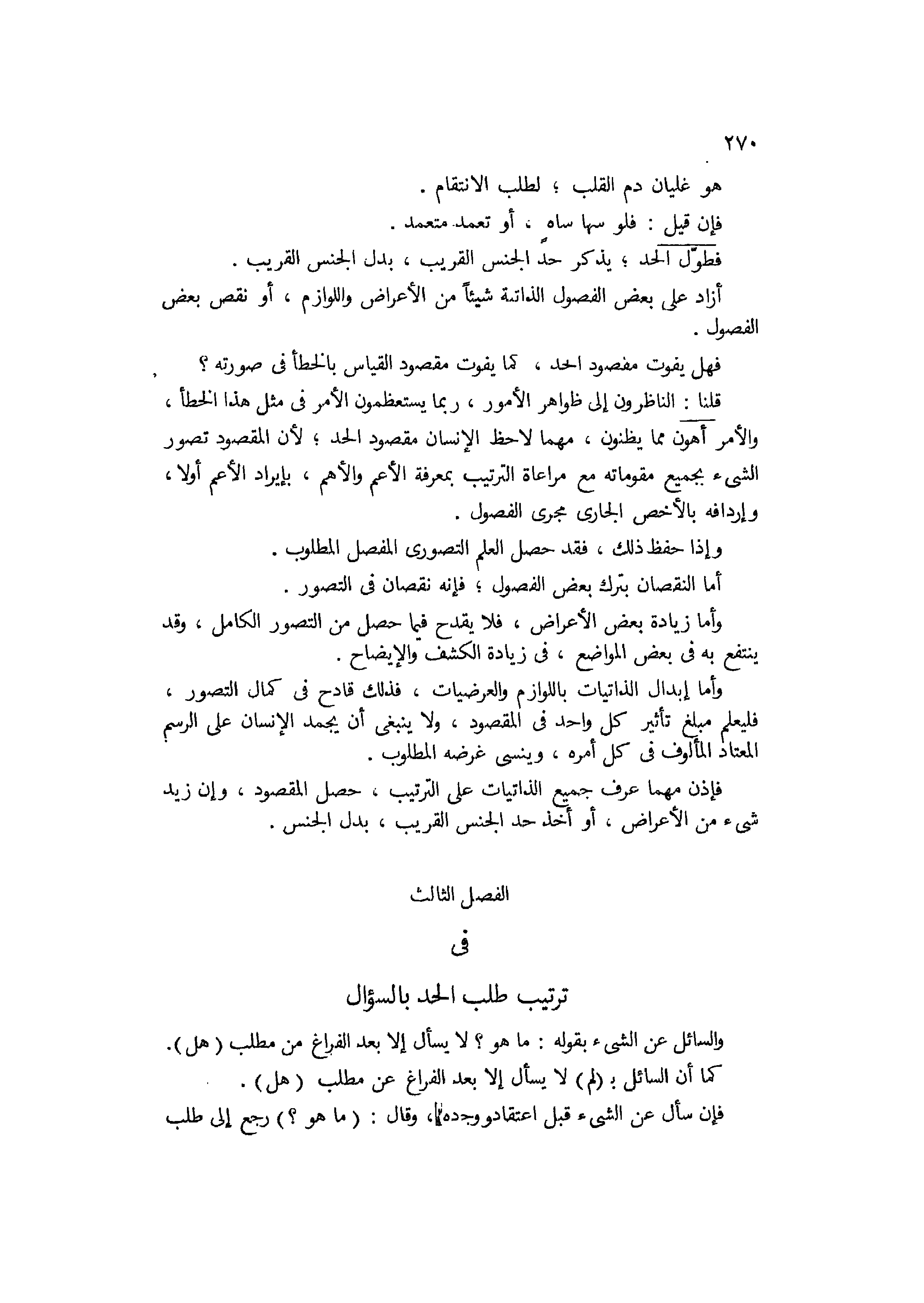 في ترتيب طلب الحد بالسؤال، والسائل عن الشيء بقوله: ما هو؟ لا يسأل إلا بعد الفراغ عن مطلب هل، كما أن السائل بلم لا يسأل إلا بعد الفراغ عن مطلب هل، فإن سأل عن الشيء قبل اعتقاد وجوده وقال: ما هو؟ رجع إلى طلب