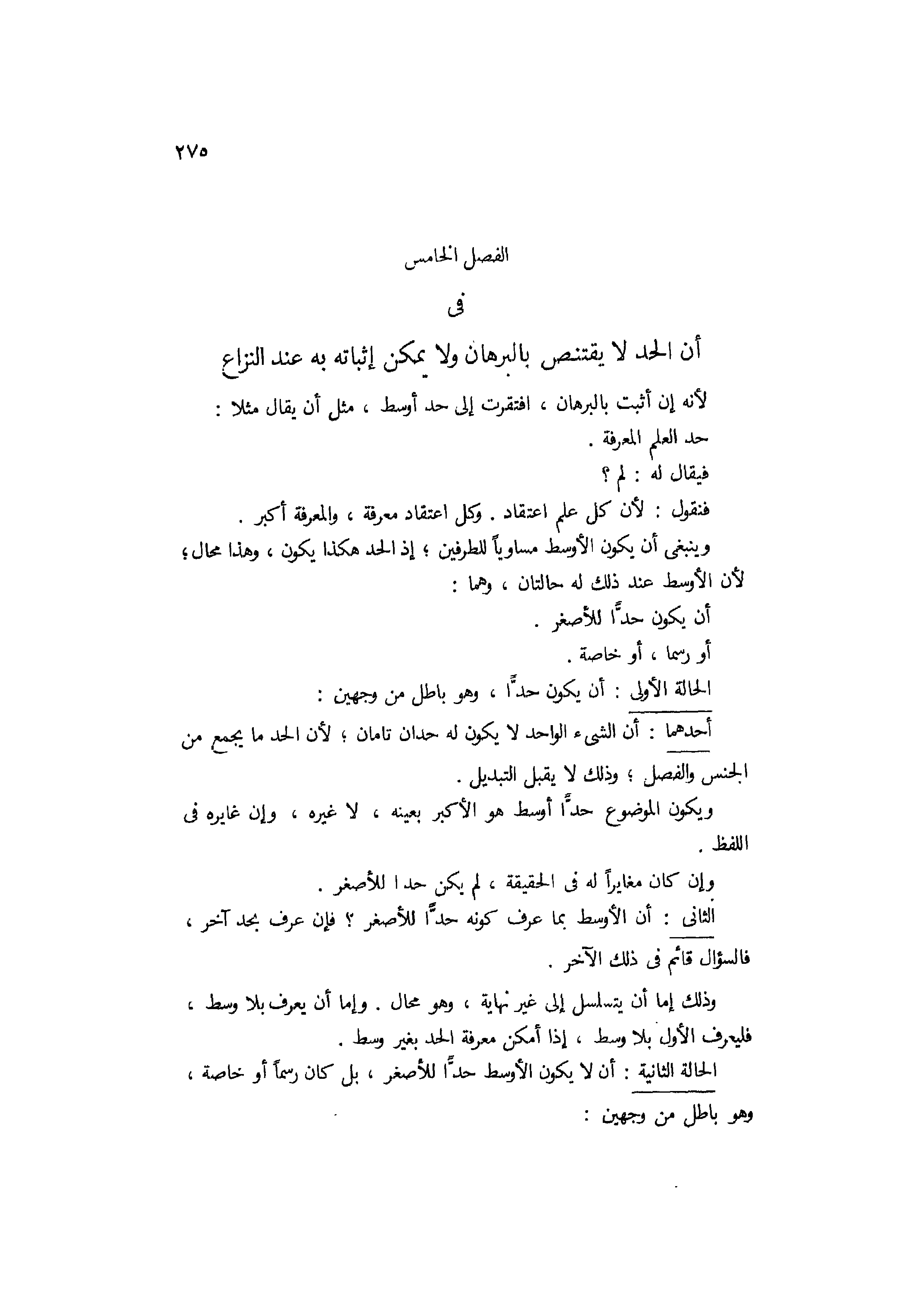 في أن الحد لا يقتنص بالبرهان ولا يمكن إثباته به عند النزاع، لأنه إن أتيت بالبرهان افتقرت إلى حد أوسط مثل أن يقال مثلا: حد العلم المعرفة، فيقال: لم؟ فنقول: لأن كل علم اعتقاد، وكل اعتقاد معرفة، والمعرفة أكبر، وينبغي أن يكون الأوسط مساويا للطرفين إذ الحد هكذا يكون، وهذا محال لأن الأوسط عند ذلك له حالتان، وهما أن يكون حدا للأصغر أو رسما أو خاصة.