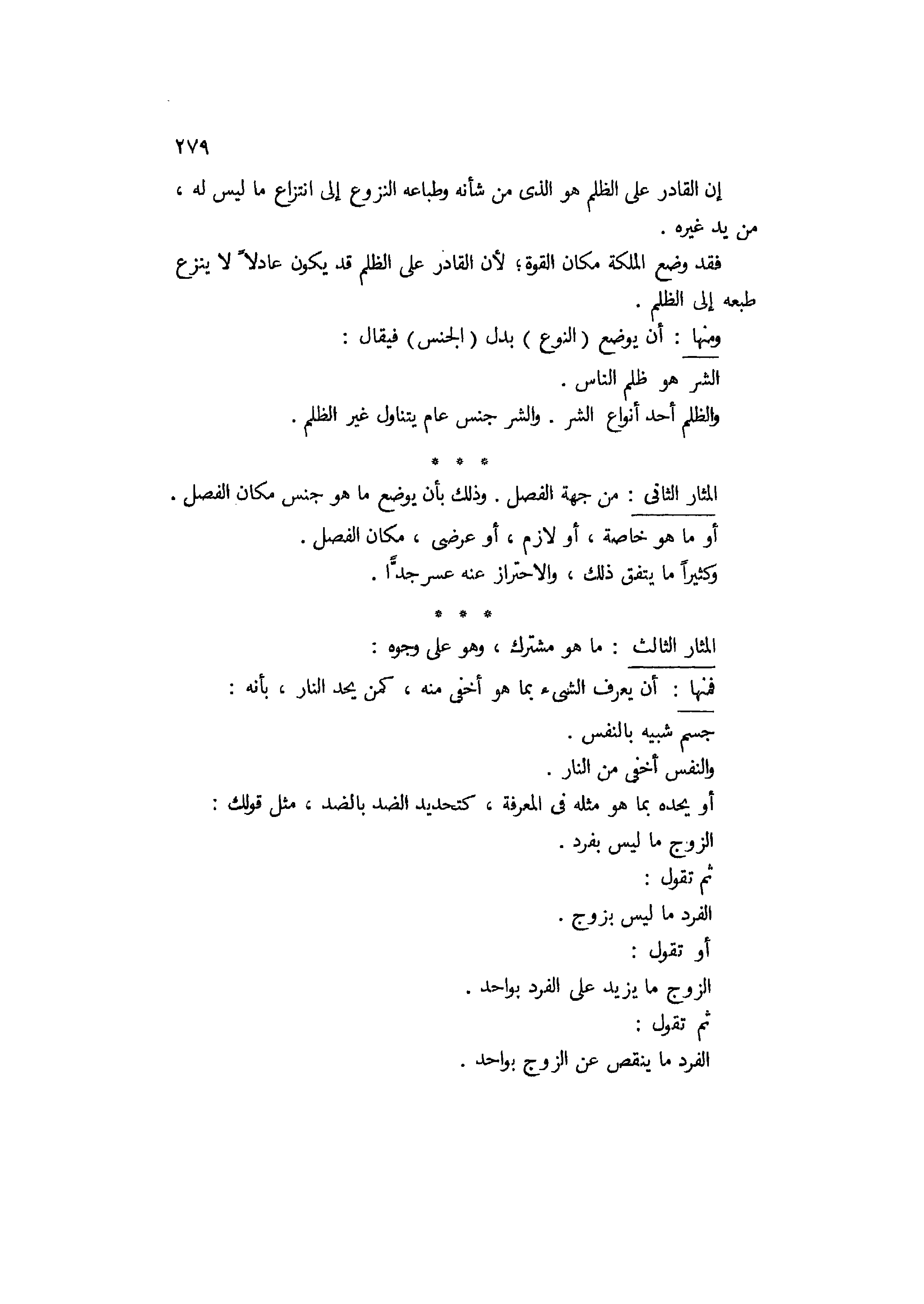 إن القادر على الظلم هو الذي من شأنه وطباعه النزوع إلى انتزاع ما ليس له من يد غيره، فقد وضع الملكة مكان القوة لأن القادر على الظلم قد يكون عادلا لا ينزع طبعه إلىالظلم. ومنها ان يوضع النوع بدل الجنس فيقال: الشر هو ظلم الناس، والظلم أحد أنواع الشر، والشر جنس عام يتناول غير الظلم.
