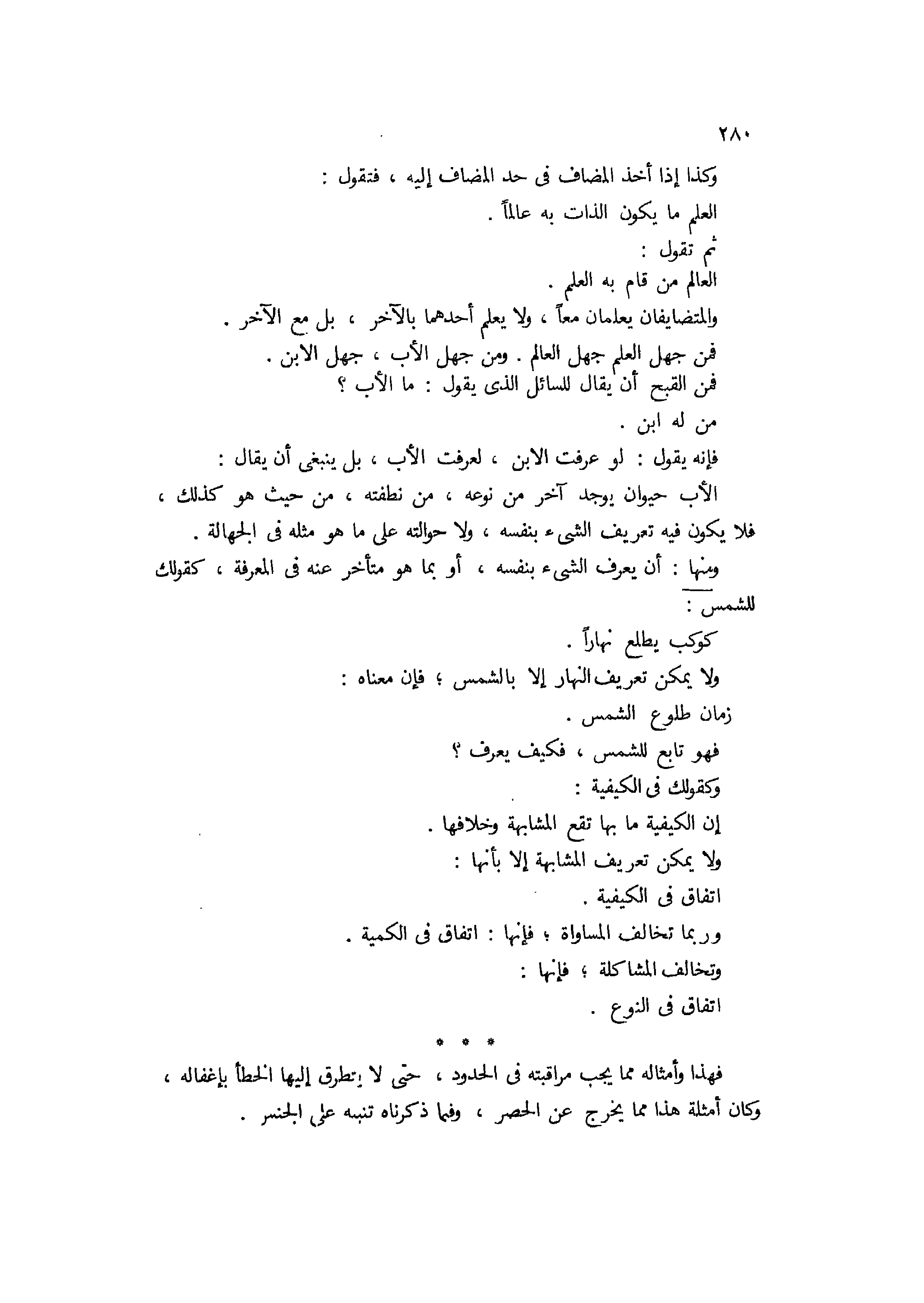 وكذا إذا أخذ المضاف في حد المضاف. فتقول: العلم ما يكون الذات به عالما. ثم تقول: العالم منقام به العلم والمتضايفين يعلمان معا، ولا يعلم أحدهما بالآخر بل مع الآخر. فمن جهل العلم جهل العالم، ومن جهل الأب جهل الإبن، فمن القبيح أن يقال للسائل الذي يقول: ما الأب من له ابن، فإنه يقول: لو عرفت الإبن لعرفت الأب بل ينبغي أن يقال: الأب حيوان يوجد آخر من نوعه من نطفته من حيث هو كذلك، فلا يكون فيه تعريف الشيء بنفسه ولا حوالته على ما هو مثله في الجهالة. ومنها ان يعرف الشيء بنفسه أو بما هومتأخر عنه في المعرفة كقولك للشمس: كوكب يطلع نهارا، ولايمكن تعريف النهار إلا بالشمس، فإن معناه زمان طلوع الشمس فهو تابع للشمس فكيف يعرف؟ وكقولك في الكيفية: أن الكيفية ما بها تقع المشابهة وخلافها، ولا يمكن تعريف المشابهة إلا بأنها إتفاق في الكيفية، وربما يخالف المساواة فإنها إتفاق في الكمية، وتخالف المشاكلة فإنها اتفاق في النوع؛ فهذا وأمثاله مما يجب مراقبته في الحدود حتى لا يتطرق إليه الخطأ بإغفاله، وكان أمثلة هذا مما يخرج عن الحصر، وفيما ذكرنا تنبيه على الجنس.