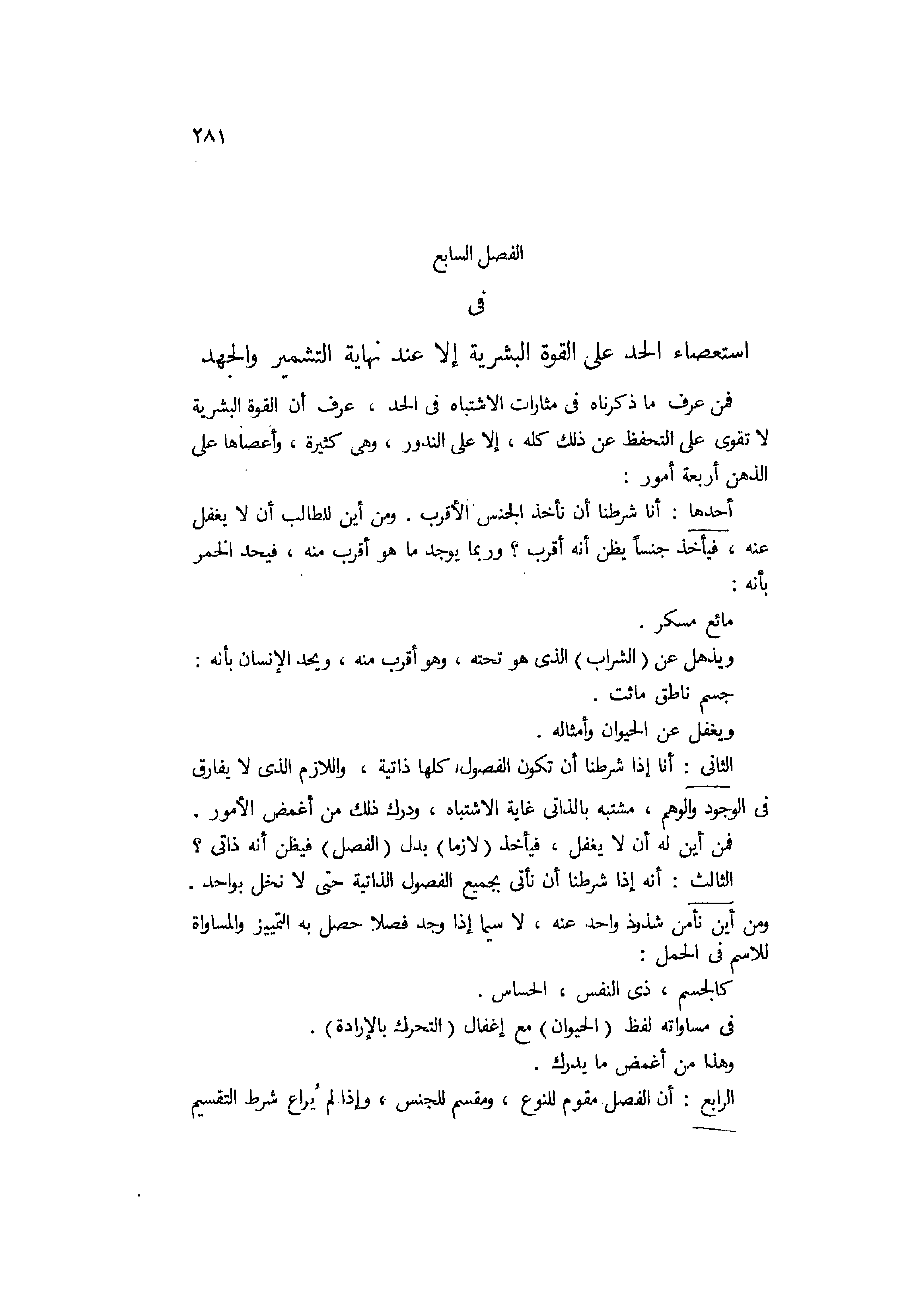 في استقصاء الحد على القوة البشرية إلا عند غاية التشمير والجهد. فمن عرف ما ذكرناه في مثارات الإشتباه في الحد، عرف أن القوة البشرية لا تقوى على التحفظ عن كل ذلك إلا على الندور، وهي كثيرة وأعصاها على الذهن أربعة أمور: أحدها أنا شرطنا أن نأخذ الجنس الأقرب، ومن أين للطالب أن لا يغفل عنه فيأخذ جنسا يظن أنه أقرب، وربما يوجد ما هو أقرب منه فيحد الخمر بأنه مائع مسكر، ويذهل عن الشراب الذي هو تحته، وهو أقرب منه، ويحد الإنسان بأنه جسم ناطق مايت ويغفل عن الحيوان وأمثاله.
