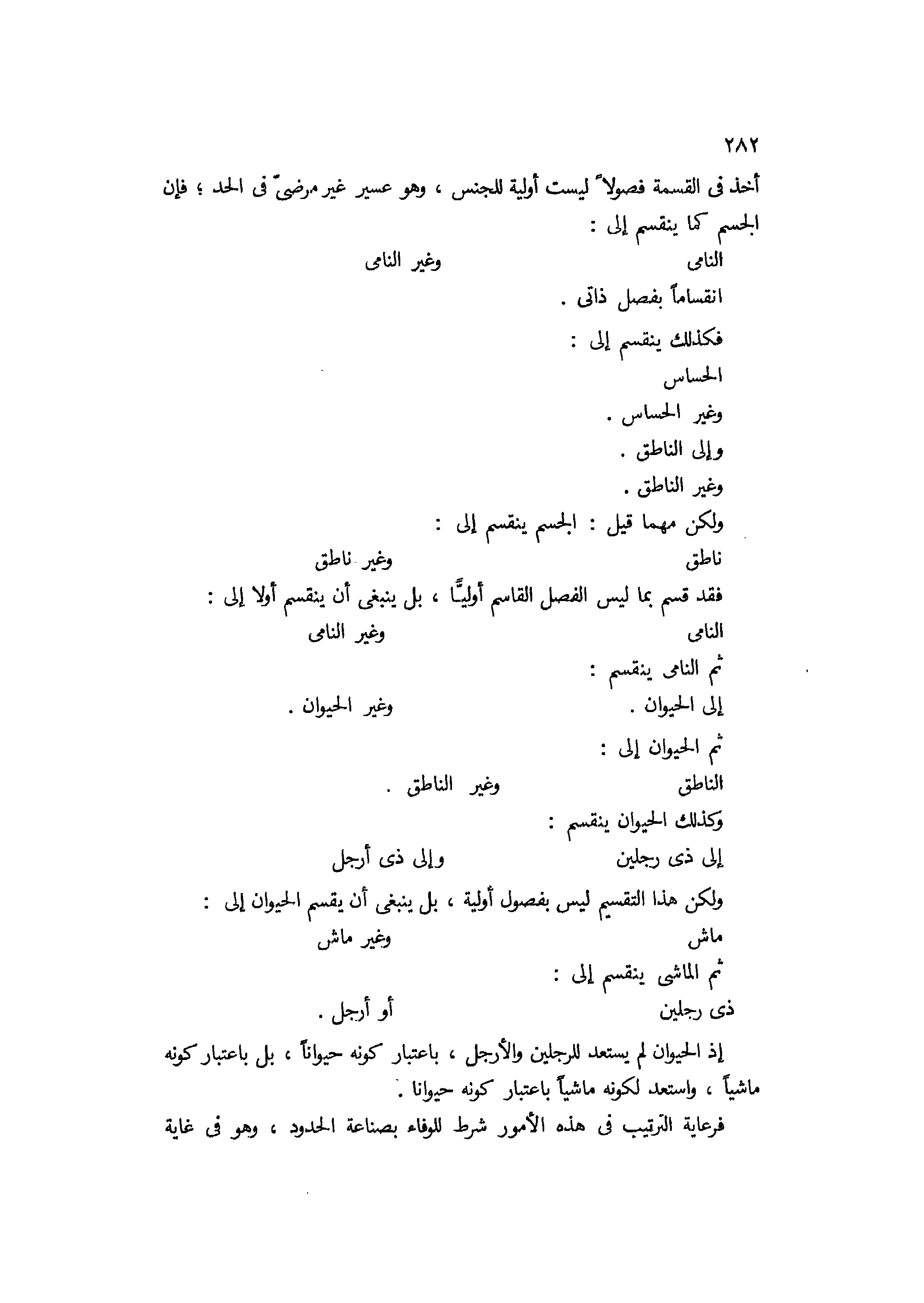 أخذ في القسمة فصولا ليست أولية للجنس، وهو عسير غير مرضي في الحد، فإن الجسم كما ينقسم إلىالنامي وغير النامي انقساما بفصل ذاتي، فكذلك ينقسم إلى الحساس وغير الحساس وإلى الناطق وغير الناطق، ولكن مهما قيل الجسم ينقسم إلى ناطق وغير ناطق، فقد قسم بما ليس الفصل القاسم أوليا، بل ينبغي أن ينقسم أولا إلى النامي وغير النامي، ثم النامي ينقسم إلى الحيوان وغير الحيوان؛ ثم الحيوان إلى الناطق وغير. وكذلك الحيوان ينقسم إلى ذي رجلين وإلى ذي أرجل، ولكن هذا التقسيم ليس بفصول أولية، بل ينبغي أن يقسم لاحيوان إلىماشي وغير ماشي، ثم الماشي ينقسمب إلى ذي رجلين أو أرجل، إذ الحيوان لم يستعد للرجلين والأرجل باعتبار كونه حيوانا بل باعتبار كونه ماشيا، واستعد لكونه ماشيا باعتبار كونه حيوانا، فرعاية الترتيب في هذه الأمور شرط للوفاء بصناعة الحدود، وهو في غاية