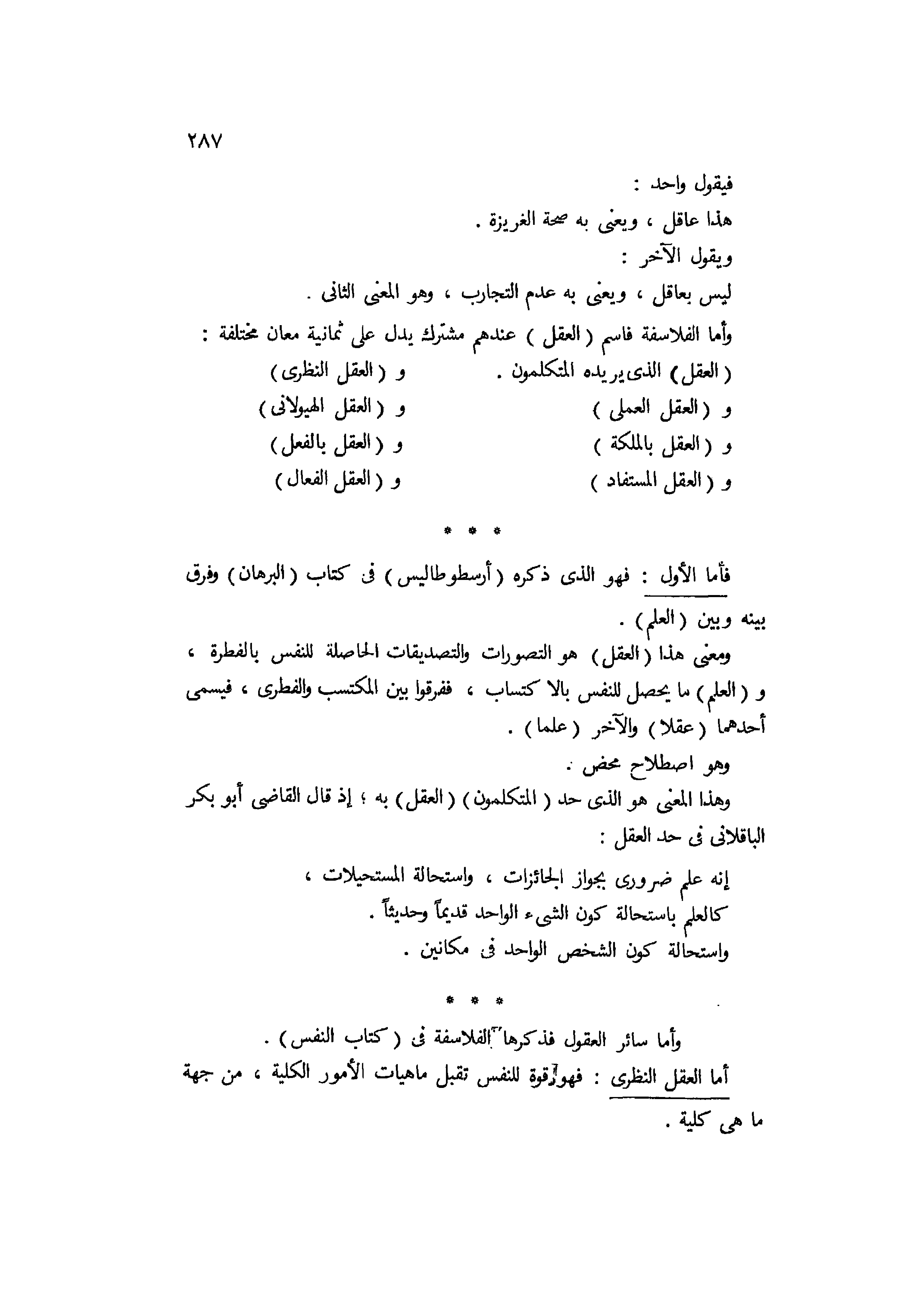 وأما الفلاسفة فاسم العقل عندهم مشترك يدل على ثمانية معاني مختلفة: العقل الذي يريده المتكلمون، والعقل النظري، والعقل العملي، والعقل الهيولاني، والعقل بالملكة، والعقل بالفعل، والعقل المستفاد، والعقل الفعال. فأما الأول فهو الذي ذكره أرسطاليس في كتاب البرهان وفرق بينه وبين العلم، ومعنى هذا العقل هو التصورات والتصديقات الحاصلة للنفس بالفطرة، والعلم ما يحصل للنفس بالإكتساب، ففرقوا بين المكتب والفطري فيسمى أحدهما عقلا والآخر علما، وهو اصطلاح محض. وهذا المعنى هو الذي حد المتكلمون العقل به إذ قال القاضي أبو بكر الباقلاني في حد العقل: إنه علم ضروري بجواز الجائزات واستحالة المستحيلات، كالعلم باستحالة كون الشيء الواحد قديما وحديثا، واستحالة المستحيلات كالعلم باستحالة كون الشيء الواحد قديما وحديثا، واستحال كون الشخص الواحد في مكانين. وأما سائر العقول فذكرها الفلاسفة في كتاب النفس.