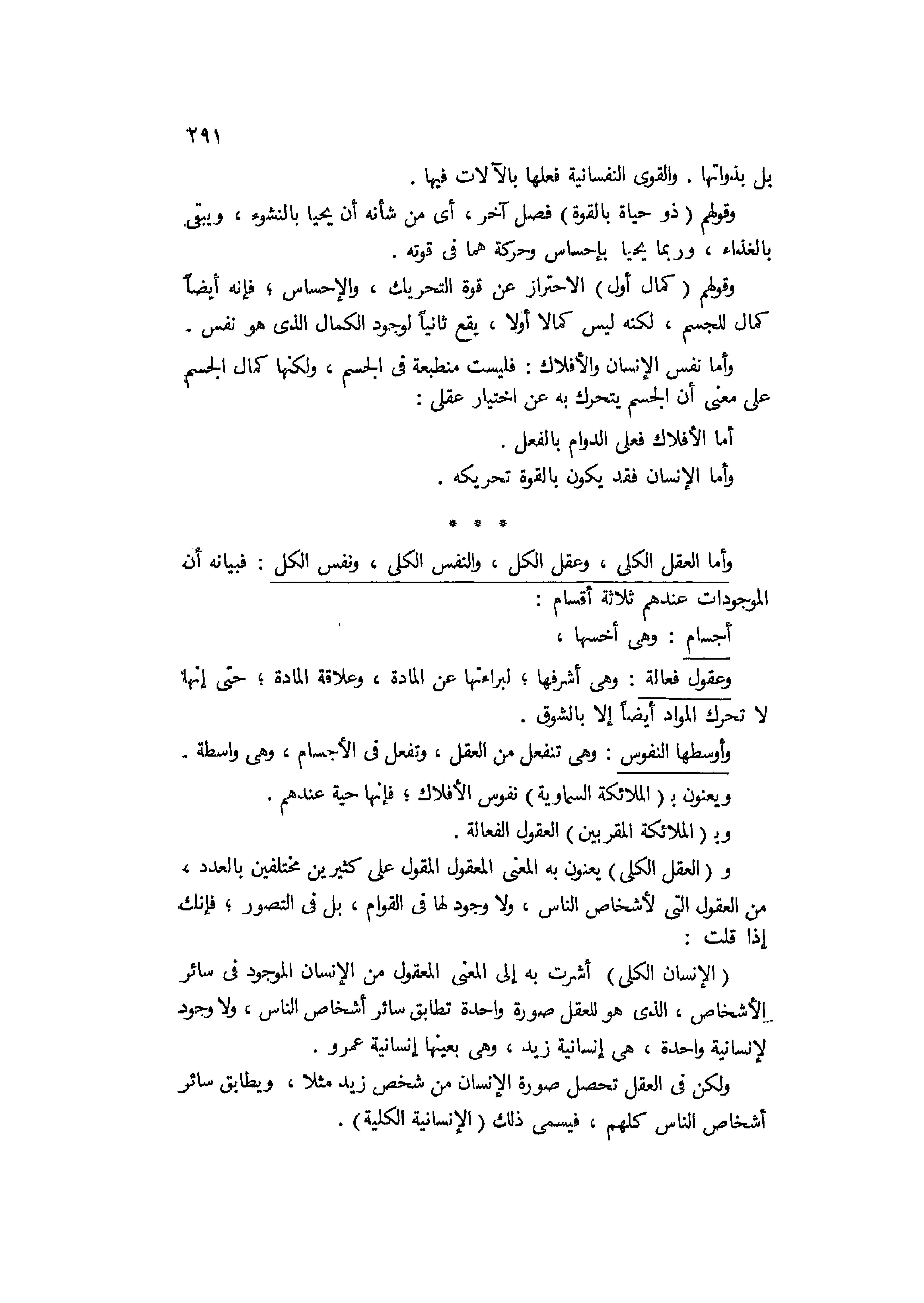 وأما العقلي الكلي وعقل الكل والنفس الكلي ونفس الكل، فبيانه أن الموجودات عندهم ثلاثة أقسام: أجسام وهي أخسها، وعقول فعالة وهي أشرفها لبراءتها عن المادة وعلاقة المادة، حتى أنها لا تحرك المواد أيضا غلا بالشوق، وأوسطها النفوس وهي التي تنفعل من العقل وتفعل في الأجسام، وهي واسطة، ويعنون بالملائكة السماوية نفوس الأفلاك فإنها حية عندهم وبالملائكة المقربين العقول الفعالة. والعقل الكلي يعنون به المعنى المعقول المقول على كثيرين مختلفين بالعدد من العقول التي لإشخاص الناس، ولا وجود لها في القوام بل في التصور، فإنك إذا قلت الإنسان الكلي أشرت به إلى المعنى المعقول من الإنسان الموجود في سائر الأشخاص، الذي هو للعقل صورة واحدة تطابق سائر أشخاص الناس، ولا وجود لإنسانية واحدة هي إنسانية زيد، وهي بعينها إنسانية عمرو، ولكن في العقل تحصل صورة الإنسان من شخص زيد مثلا، ويطابق سائر أشخاص الناس كلهم فيسمى ذلك الإنسانية الكلية،