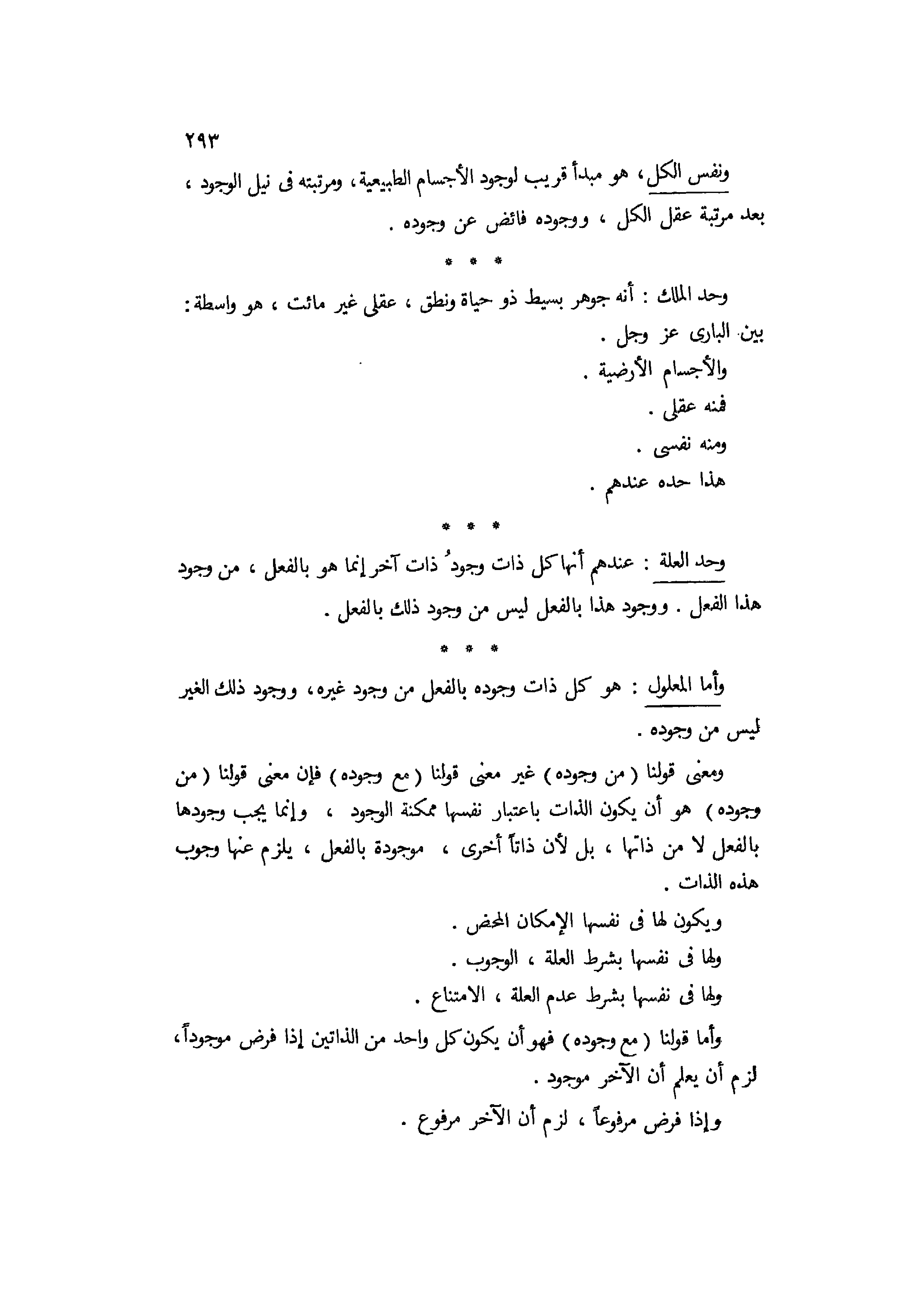 ونفس الكل هو مبدأ قريب لوجود الأجسام الطبيعية ومرتبته في نيل الوجود بعد مرتبة عقل الكل، ووجوده فايض عن وجوده. وحد الملك أنه جوهر بسيط ذو حياة ونطق عقلي غير مائت، هو واسطة بين الباري عز وجل. والأجسام الأرضية فمنه عقلي ومنه نفسي؛ هذا حده عندهم. وحد العلة عندهم أنها كل ذات وجود ذات آخر إنما هو بالفعل من وجود هذا الفعل ووجود هذا بالفعل ليس من وجود ذلك بالفعل.