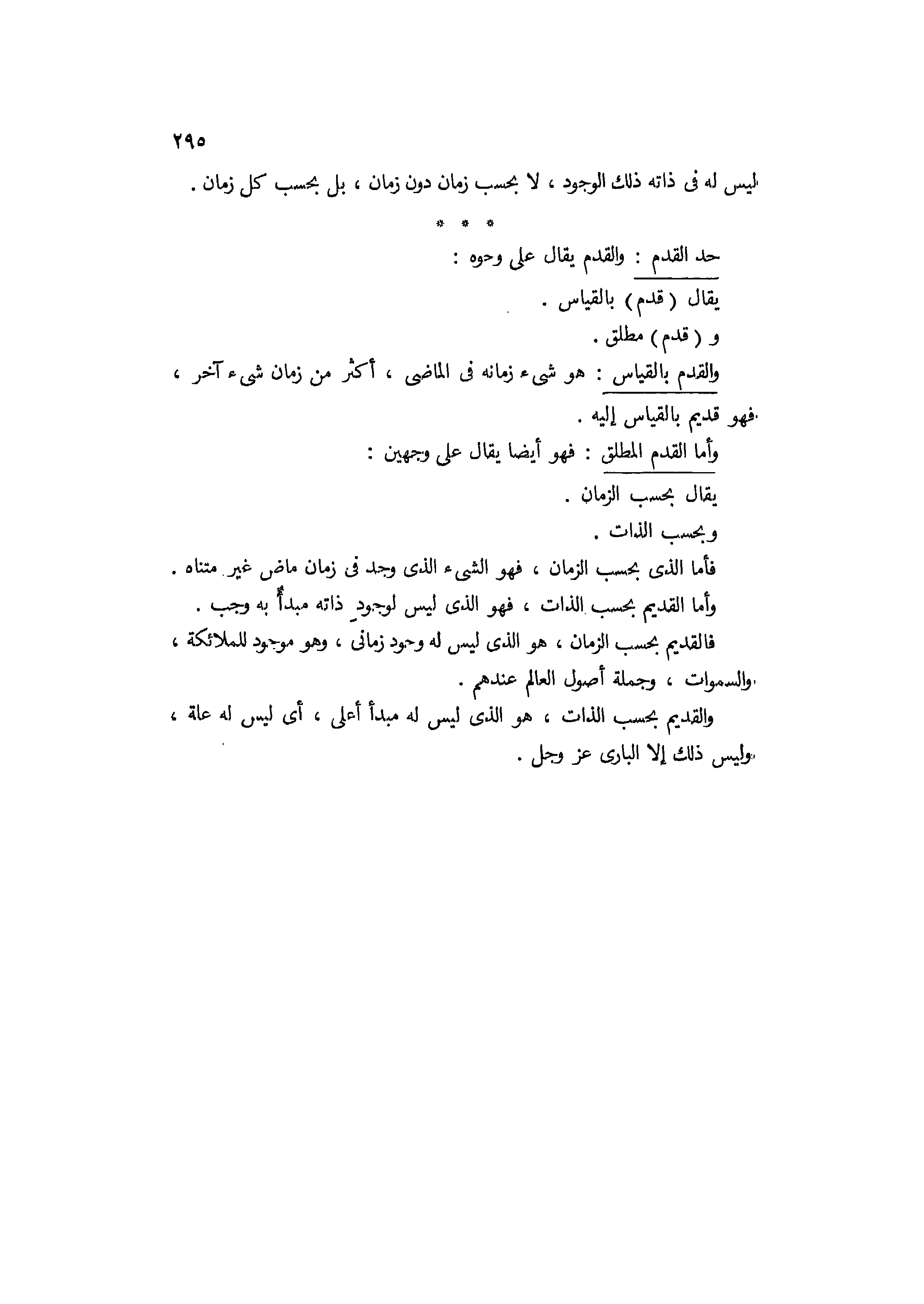 حد القدم والقدم يقال على وجوه، يقال قدم بالقياس، وقدم مطلق، والقدم بالقياس هو شيء زمانه في الماضي أكثر من زمان شيء آخر، فهو قدم بالقياس إليه. وأما القدم المطلق فهو أيضا على وجهين يقال بحسب الزمان وبحسب الذات، فأما الذي بحسب الزمان فهو الشيء الذي وجد في زمان ماض غير متناه. وأما القديم بحسب الزمان هو الذي ليس له وجود زماني وهو موجود للملائكة والسموات وجملة أصول العالم عندهم. والقديم بحسب الذات هو الذي ليس له مبدأ علي، أي ليس له علة، وليس ذلك إلا الباري عز وجل.