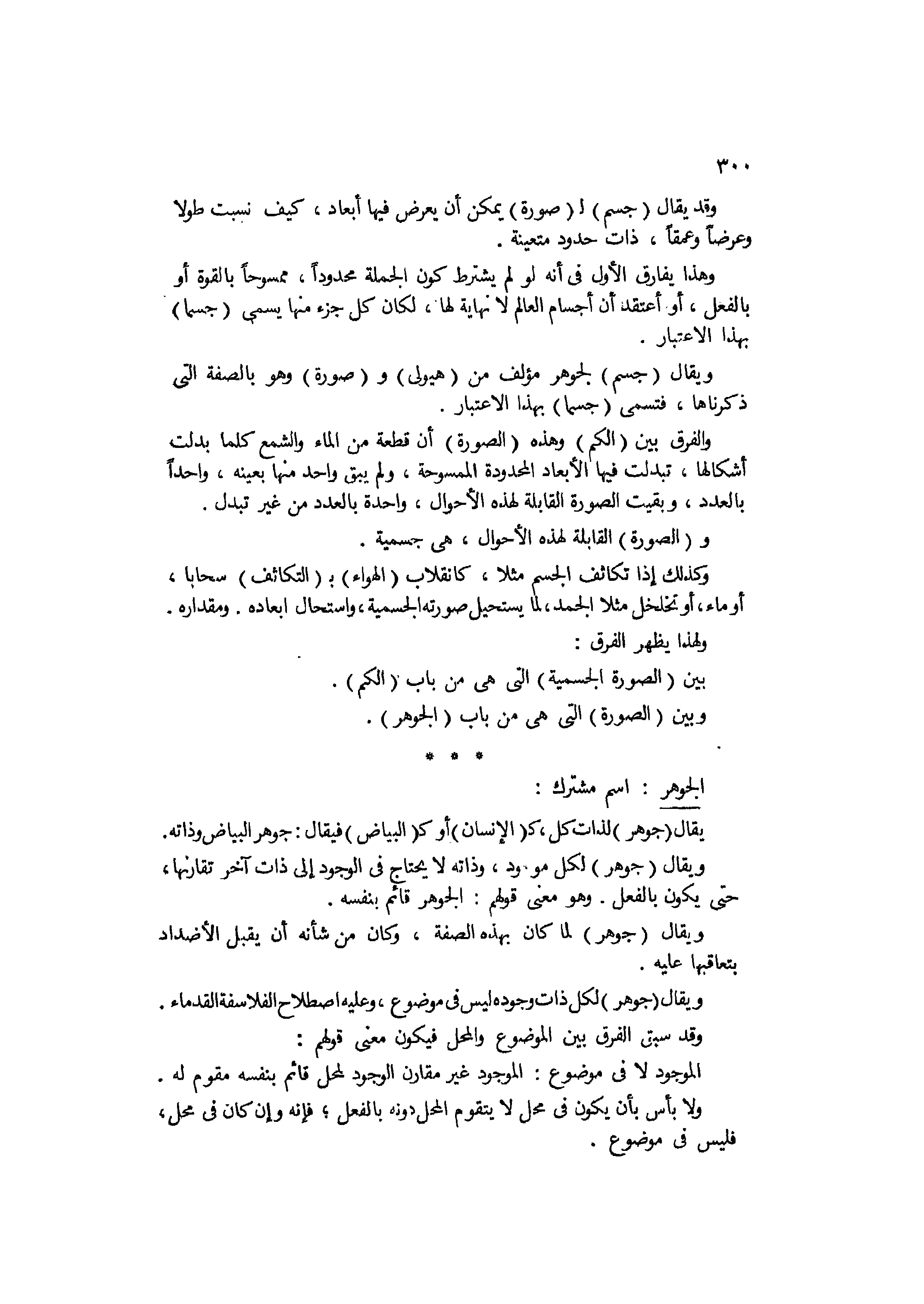 وقد يقال جسم لصورة يمكن أن يعرض فيها أبعاد كيف نسبت طولا وعرضا وعمقا، ذات حدود متعينة، وهذا يفارق الأول في أنه لو لم يشترط كون الجملة محدودا ممسوحا بالقوة أو بالفعل، أو اعتقد أن أجسام العالم لا نهاية لها، لكا كل جزء منها يسمى جسما بهذا الإعتبار، والفرق بين الكم وهذه الصورة أن قطعة من الماء ولاشمع كلما بدلت أشكالها تبدلت فيها الأبعاد المحدودة الممسوحة، ولم يبق واحد منها بعينه واحدا بالعدد، وبقيت الصورة القابلة لهذه الأحوال واحدة بالعدد من غير تبدل. والصورة القابلة لهذه الأحوال هي جسمية، وكذلك إذا تكاثف الجسم مثلا كانقلاب الهواء بالتكاثف سحابا أو ماء، أو تخلخل مثلا الجمد لما يستحيل صورته الجسمية، واستحال أبعاده ومقداره، ولهذا يظهر الفرق بين الصورة الجسمية التي هي من باب الكم، وبين الصورة التي هي من باب الجوهر.