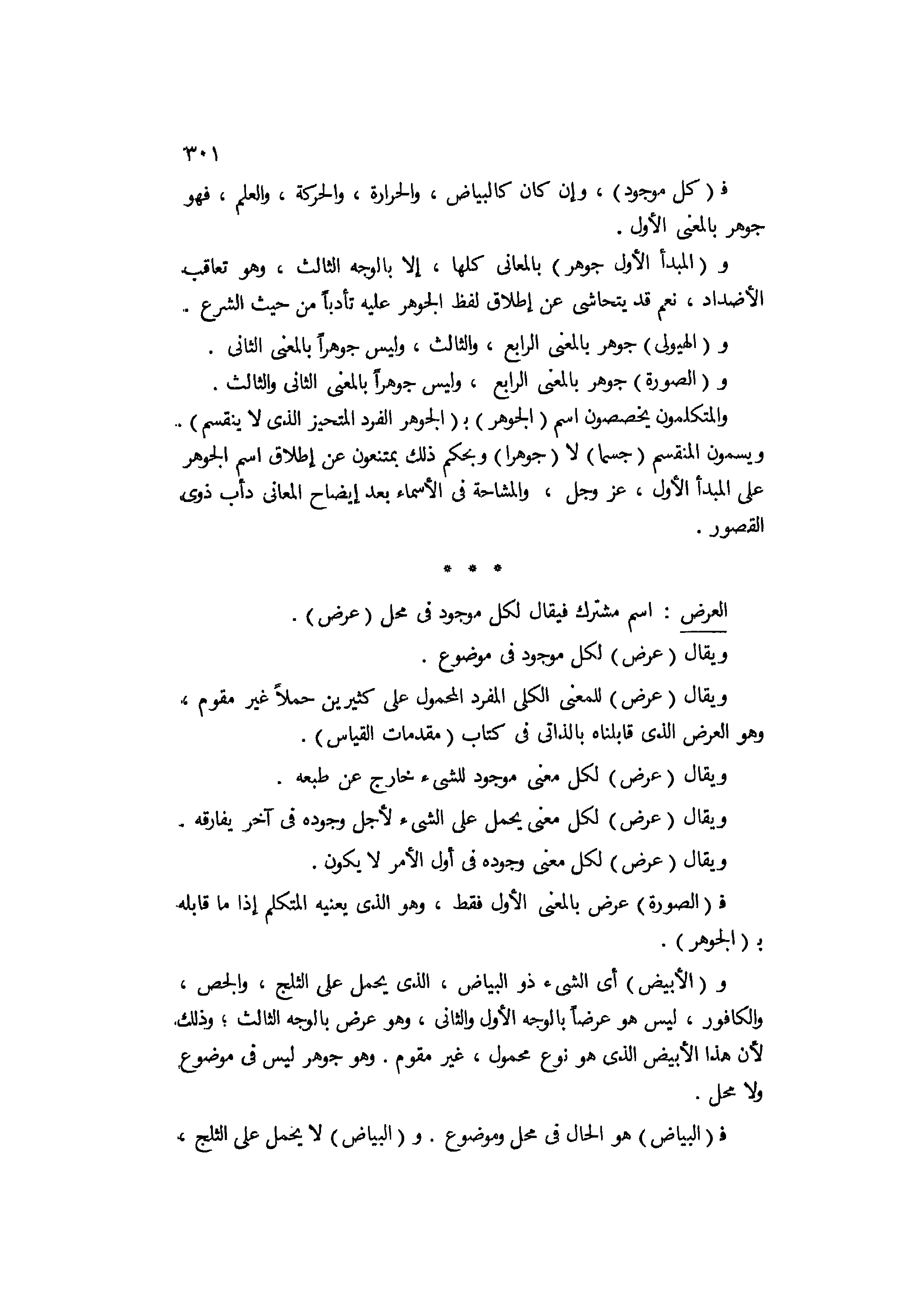 العرض غسم مشترك فيقال لكل موجود في محل عرض، ويقال عرض لكل موجود في موضوع، ويقال عرض للمعنى الكلي المفرد المحمول على كثيرين حملا غير مقوم، وهو العرض الذي قابلناه بالذاتي في كتاب مقدمات القياس. ويقال عرض لكل معنى موجود للشيء خارج عن طبعه، ويقال عرض لكل معنى يحمل على الشيء لأجل وجوده في آخر يفارقه، ويقال عرض لكل معنى وجوده في أول الأمر لا يكون؛ فالصورة عرض بالمعنى الأول فقط، وهو الذي يعنيه المتكلم إذا ما قابله بالجوهر والأبيض، أي الشيء ذو البياض الذي يحمل على الثلج والجص والكافور ليس هو عرضا بالوجه الأول والثاني، وهو عرض بالوجه الثالث، وذلك لأن هذا الأبيض الذي هو نوع محمول غير مقوم، وهو جوهر ليس في موضوع ولا محل، فالبياض هو الحال في محل وموضوع، والبياض لا يحمل على الثلج