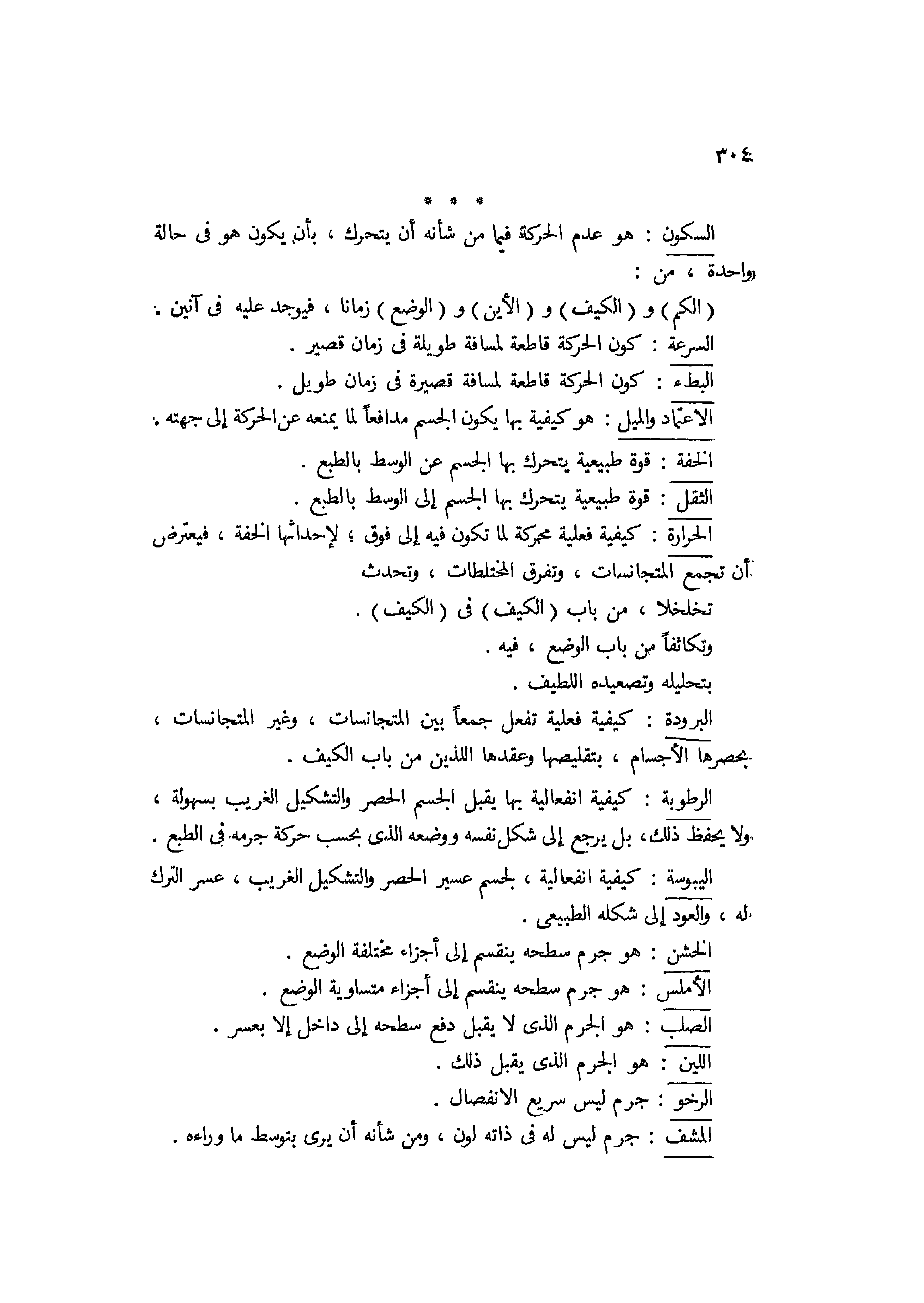 السكون هو عدم الحركة فيما من شأنه أن يتحرك بأن يكون هو في حالة واحدة من الكم والكيف والأين والوضع زمانا، فيوجد عليه في آنين.