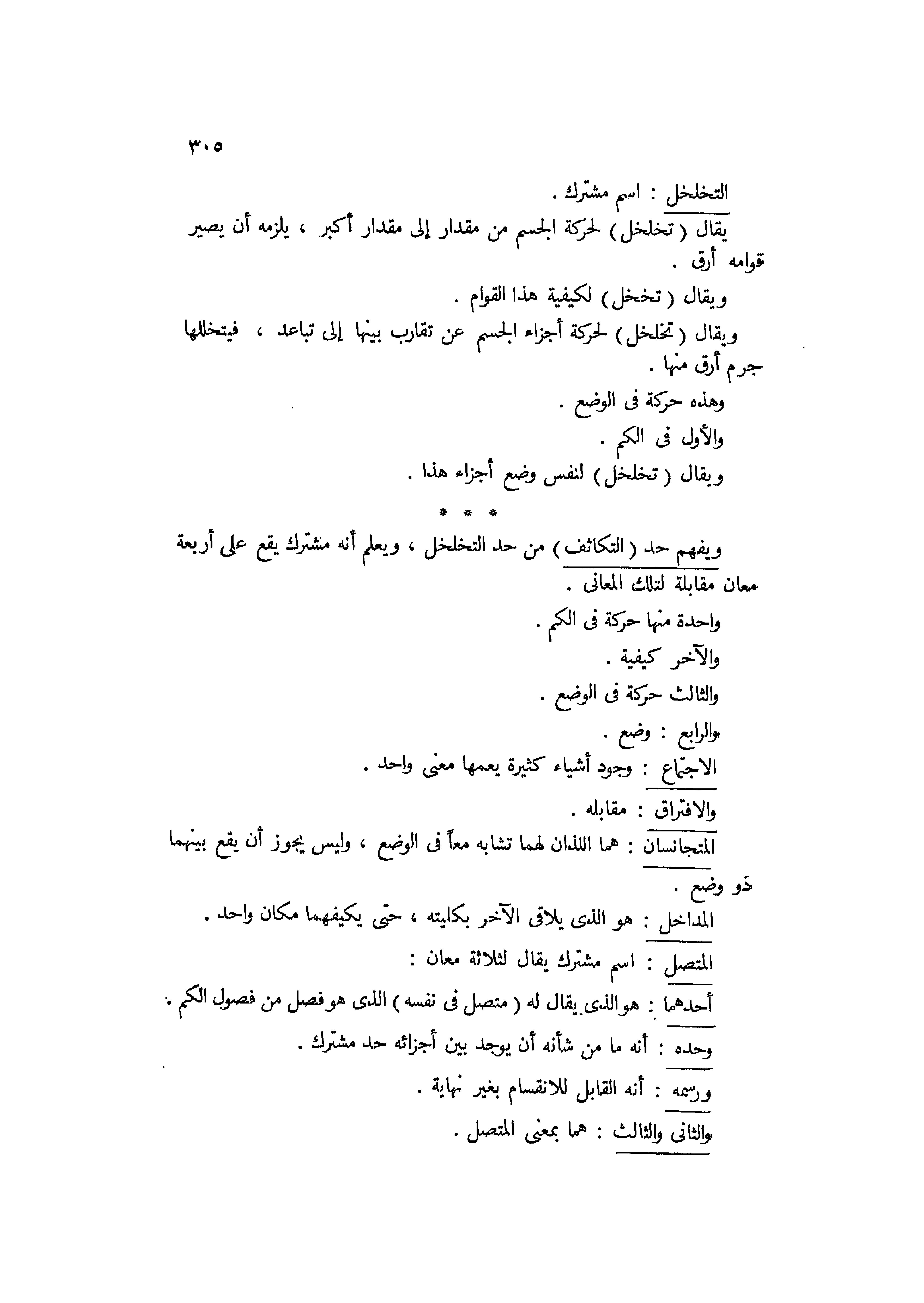 ويقال تخلخل لحركة أجزاء الجسم عن تقارب بينها إلى تباعد فيتخللها جرم أرق منها، وهذه حركة في الوضع والأول في الكم. ويقال تخلخل لنفس وضع أجزاء هذا، ويفهم حد التكاثف من حد التخلخل، ويعلم أنه مشترك يقع على أربعة معان مقابلة لتلك المعانيي: واحدة منها حركة في الكم، والآخر كيفية، والثالث حركة في الوضع، والرابع وضع.